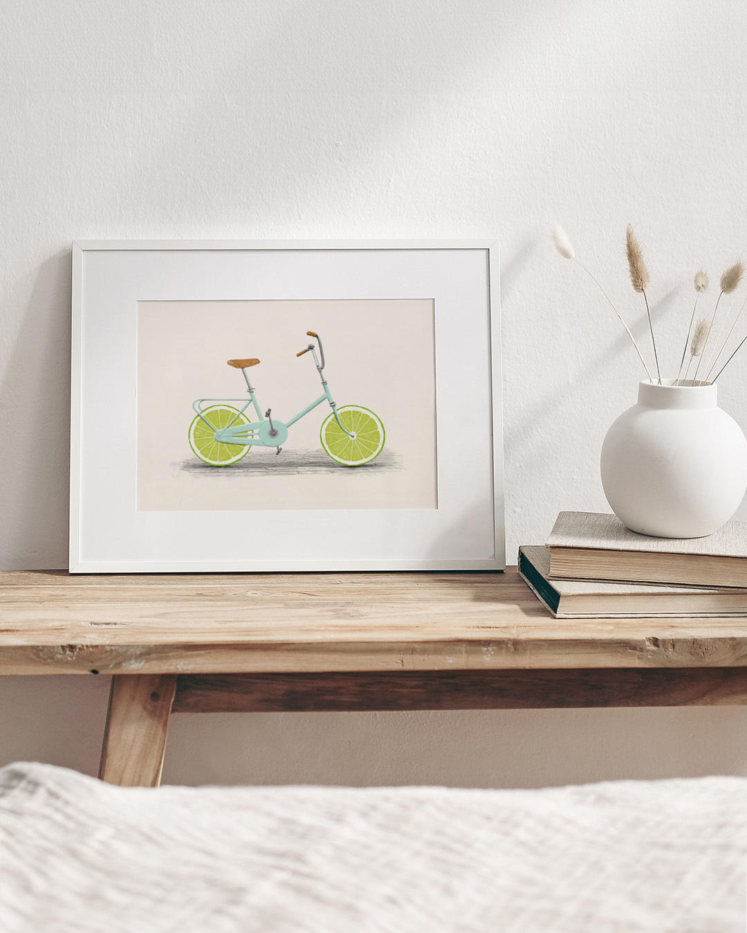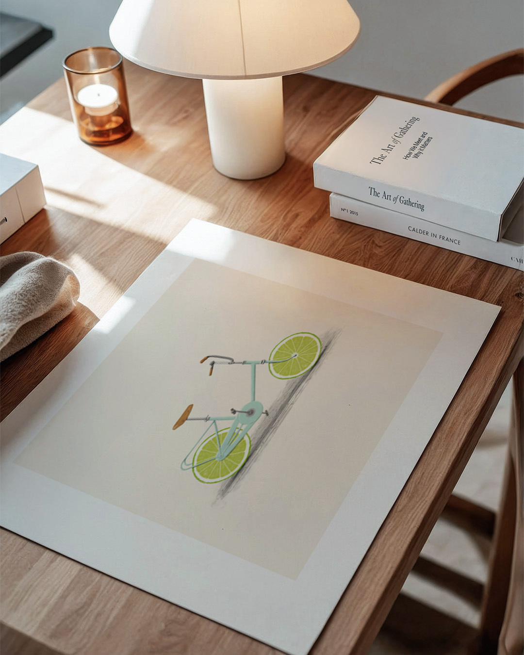Een speelse illustratie van Florent Bodart met een cyaankleurige fiets met limoenschijven als wielen, tegen een beige achtergrond. Een humoristische mix met een vleugje gastronomie.