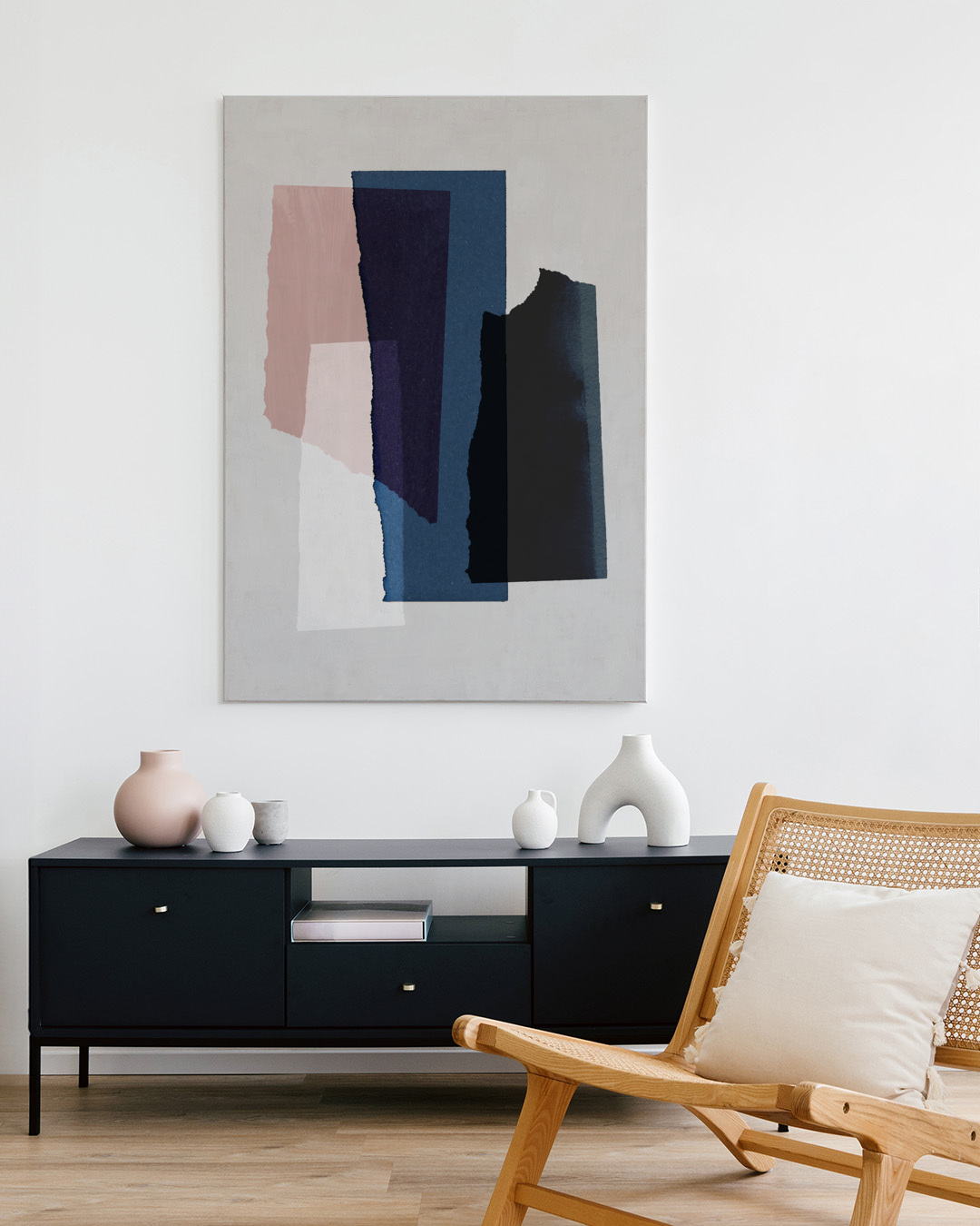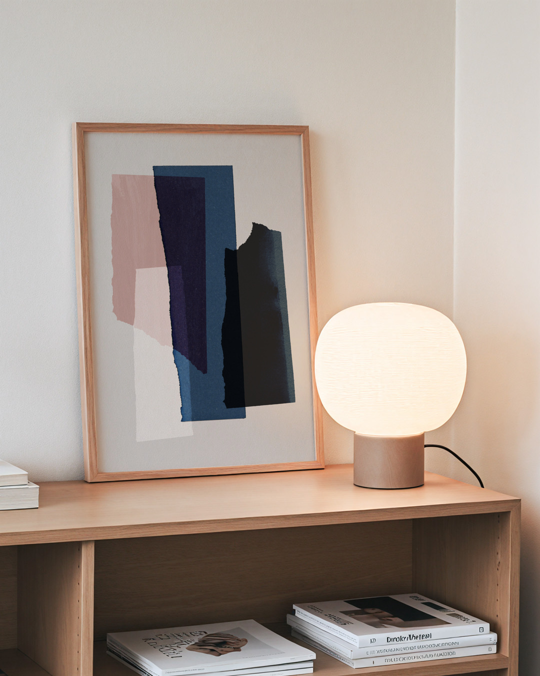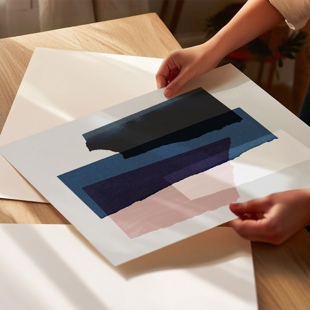 Mareike Böhmers abstracte collagekunstwerk bevat overlappende gescheurde papieren in gedempte tinten. Het kunstwerk creëert een subtiele harmonie met zijn samenspel van blauwe, roze, grijze en zwarte tinten, en vangt een intrigerende en verfijnde compositie.