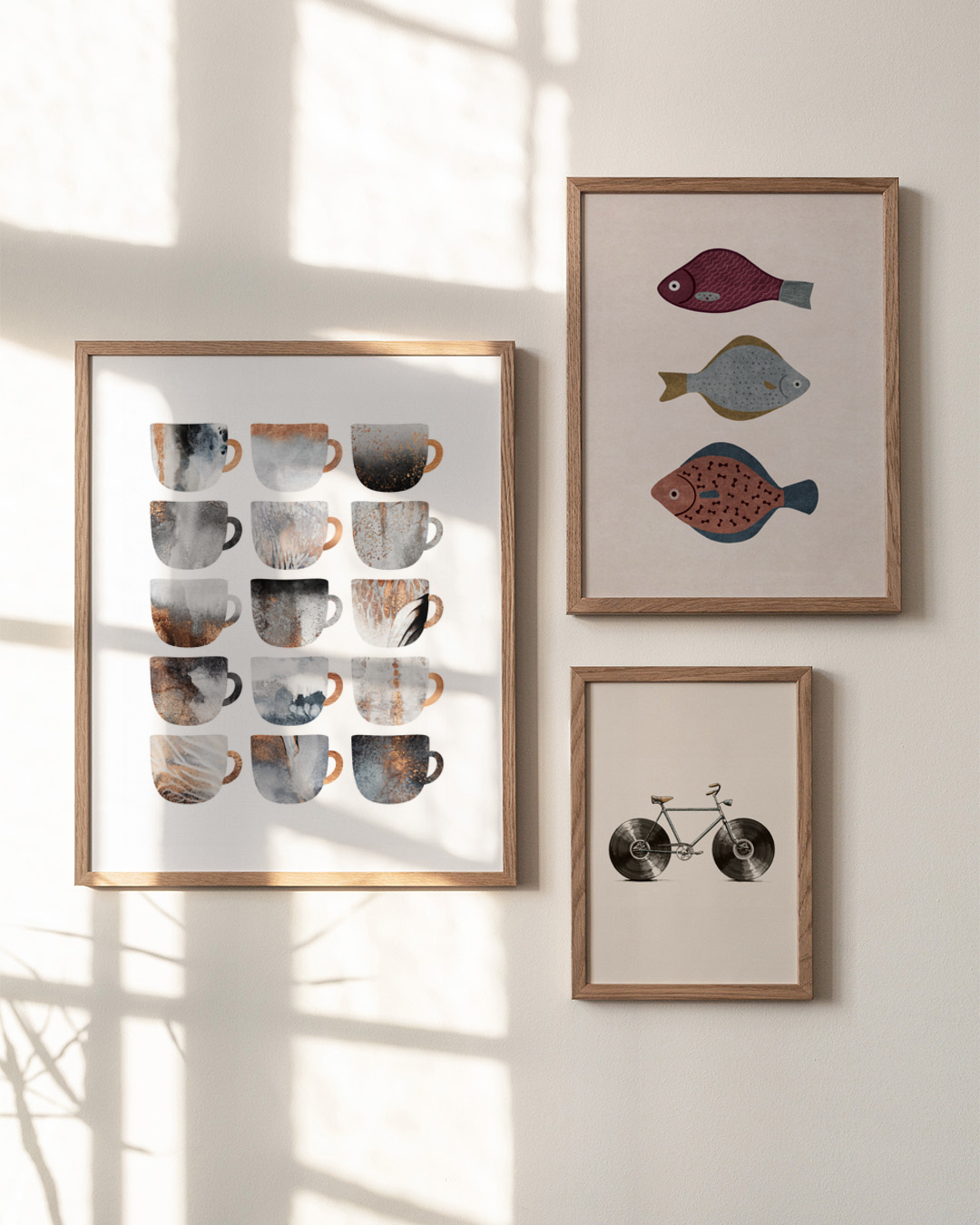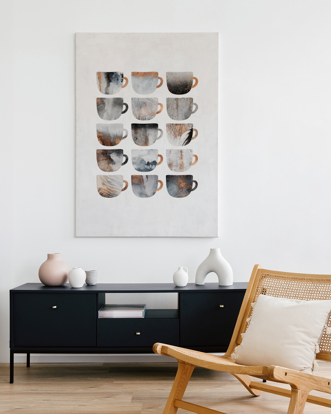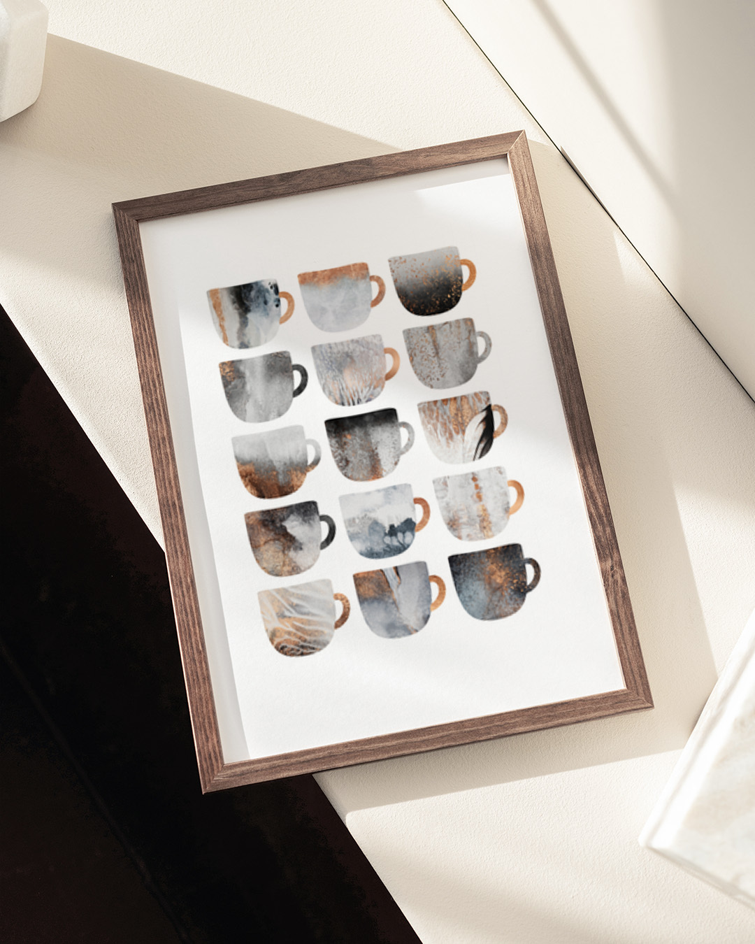 Deze kunstafdruk toont een verzameling uniek getextureerde koffiekopjes, elk met zijn eigen kenmerkende patroon. De zachte grijze en warme bruine tinten geven een verfijnde en gezellige uitstraling. Perfect voor koffieliefhebbers en moderne keukeninrichting.