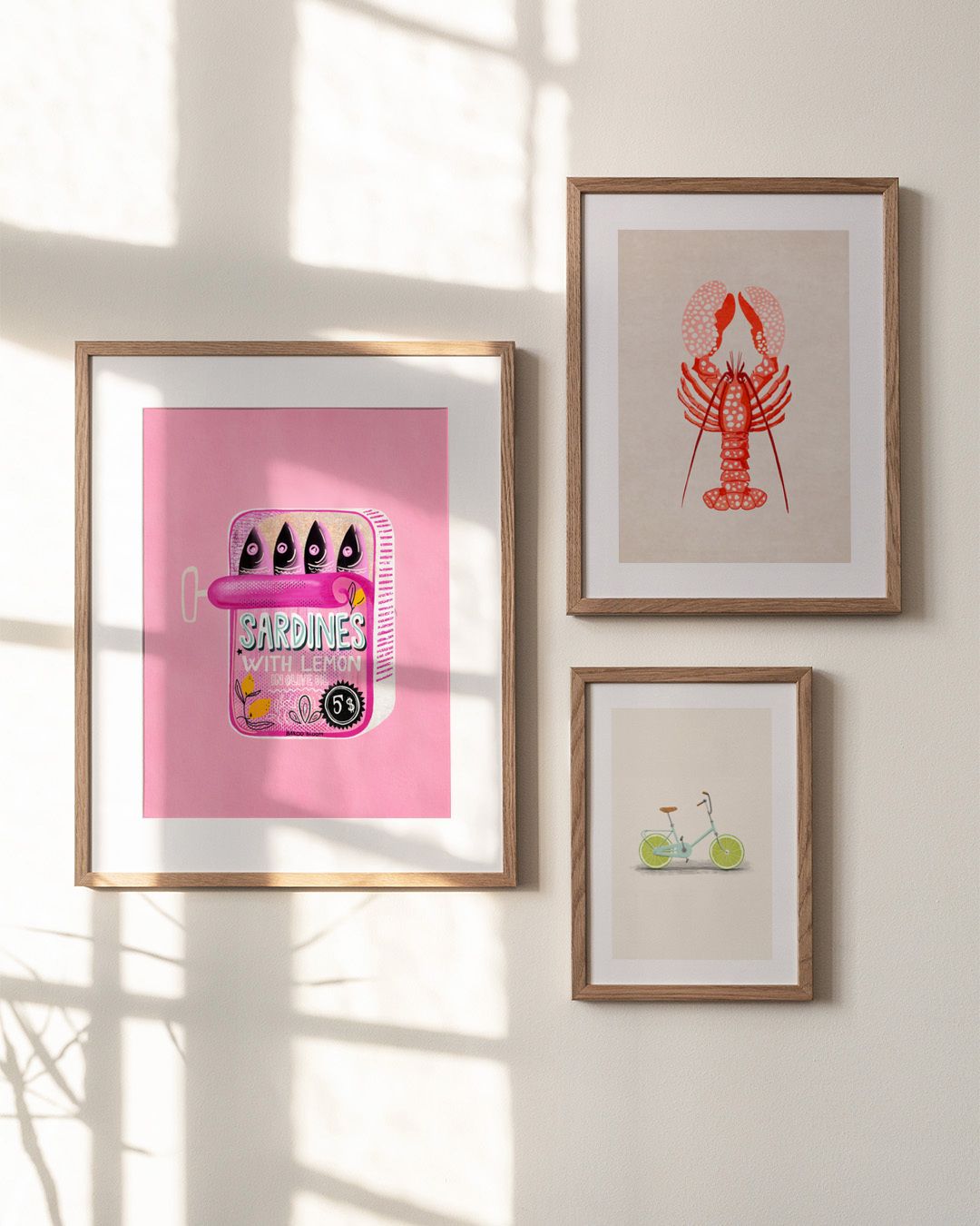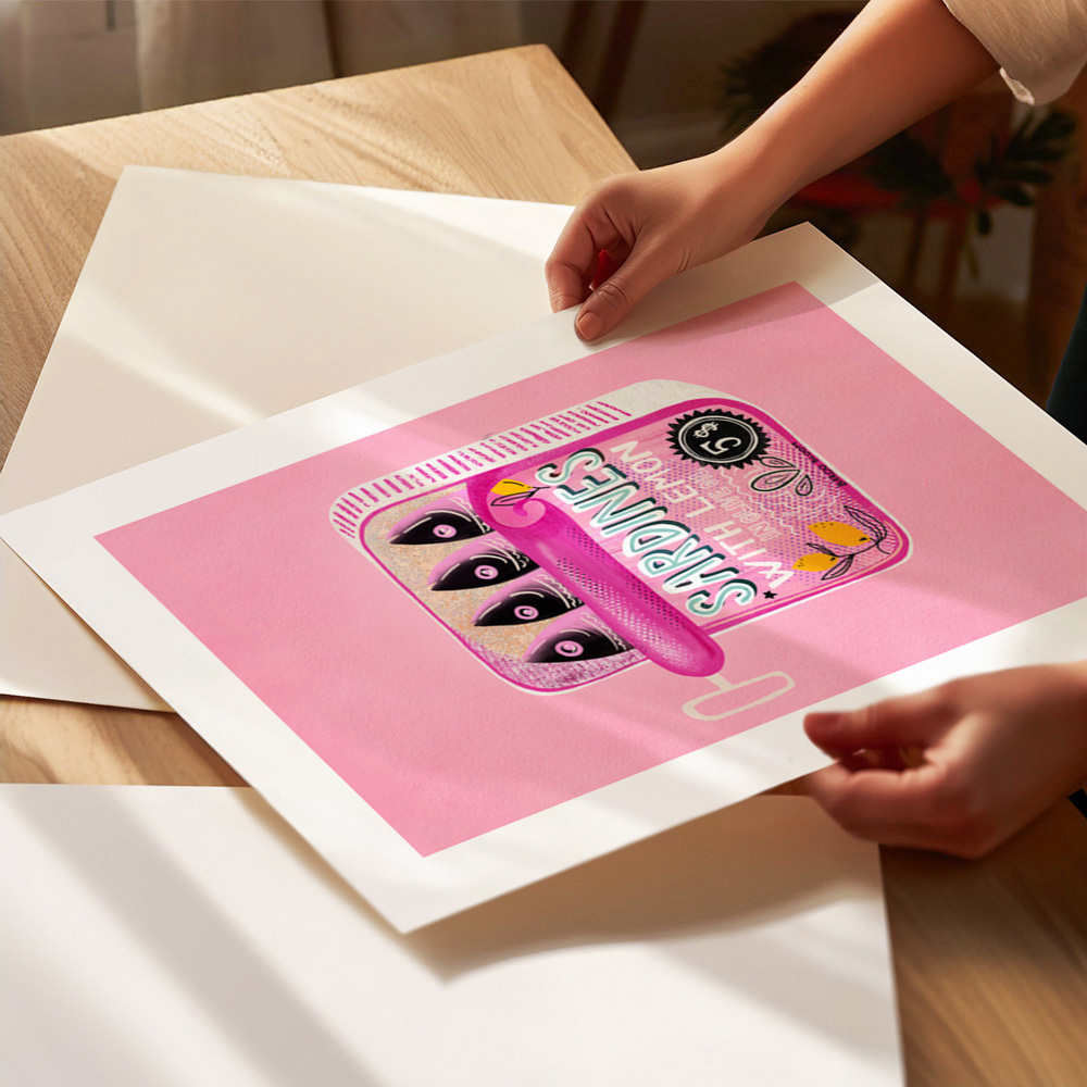Ervaar een humoristische noot met Baroo Blooms kleurrijke sardineblik-illustratie. Met een roze achtergrond voegt dit speelse ontwerp plezier toe aan elke kamer.