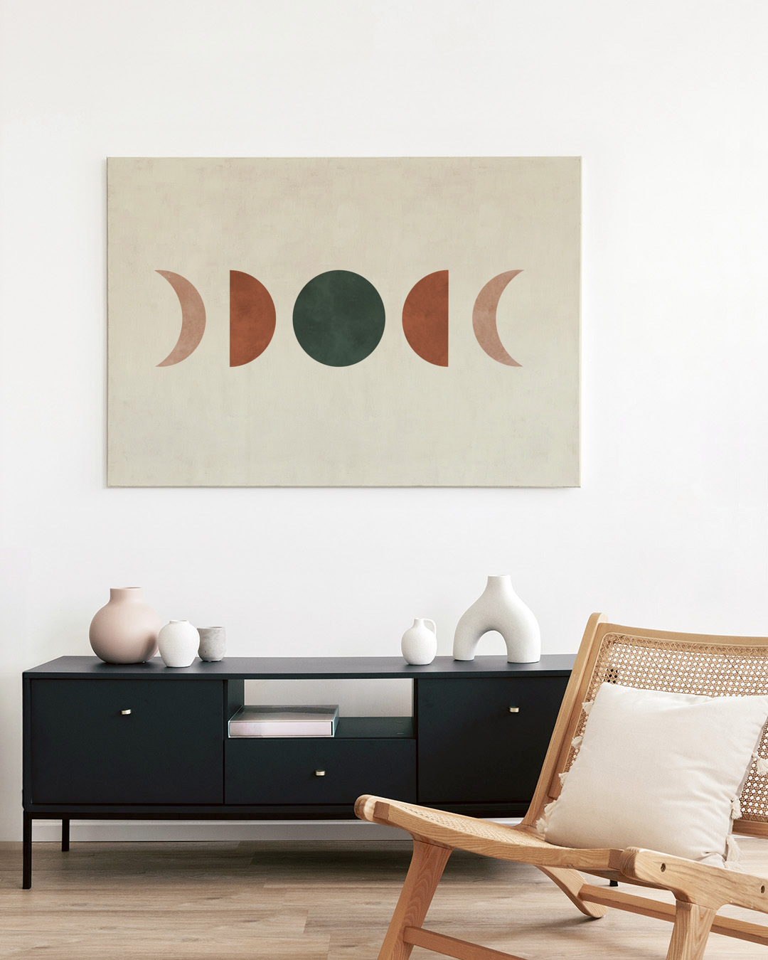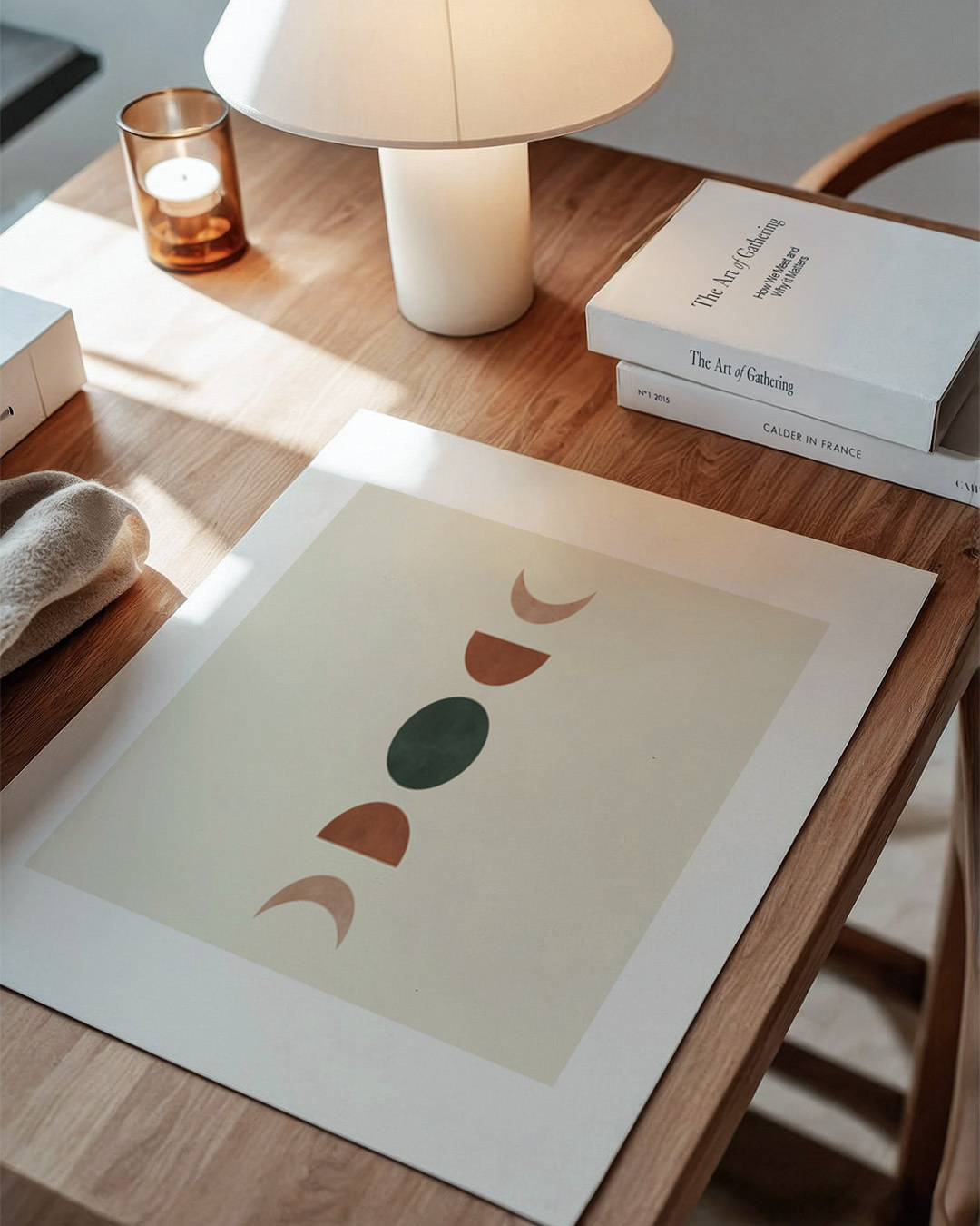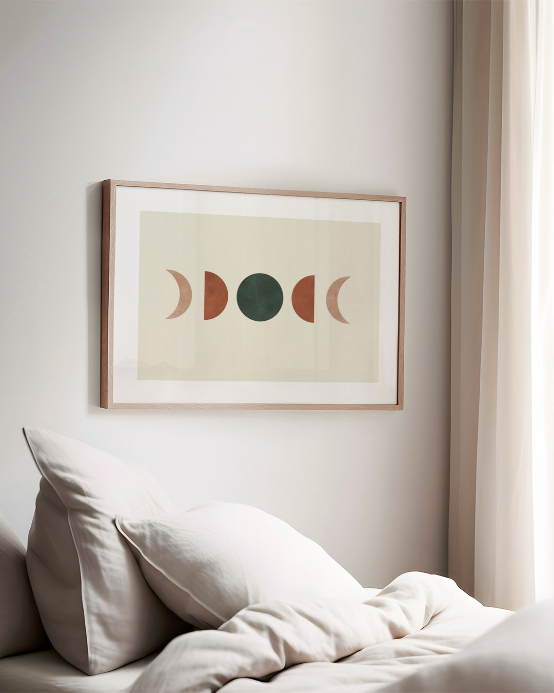Een minimalistisch ontwerp dat de fasen van de maan weergeeft in aardse groene en warme oranje tinten tegen een zachte achtergrond, en de hemelse schoonheid vastlegt in een eigentijdse stijl.
