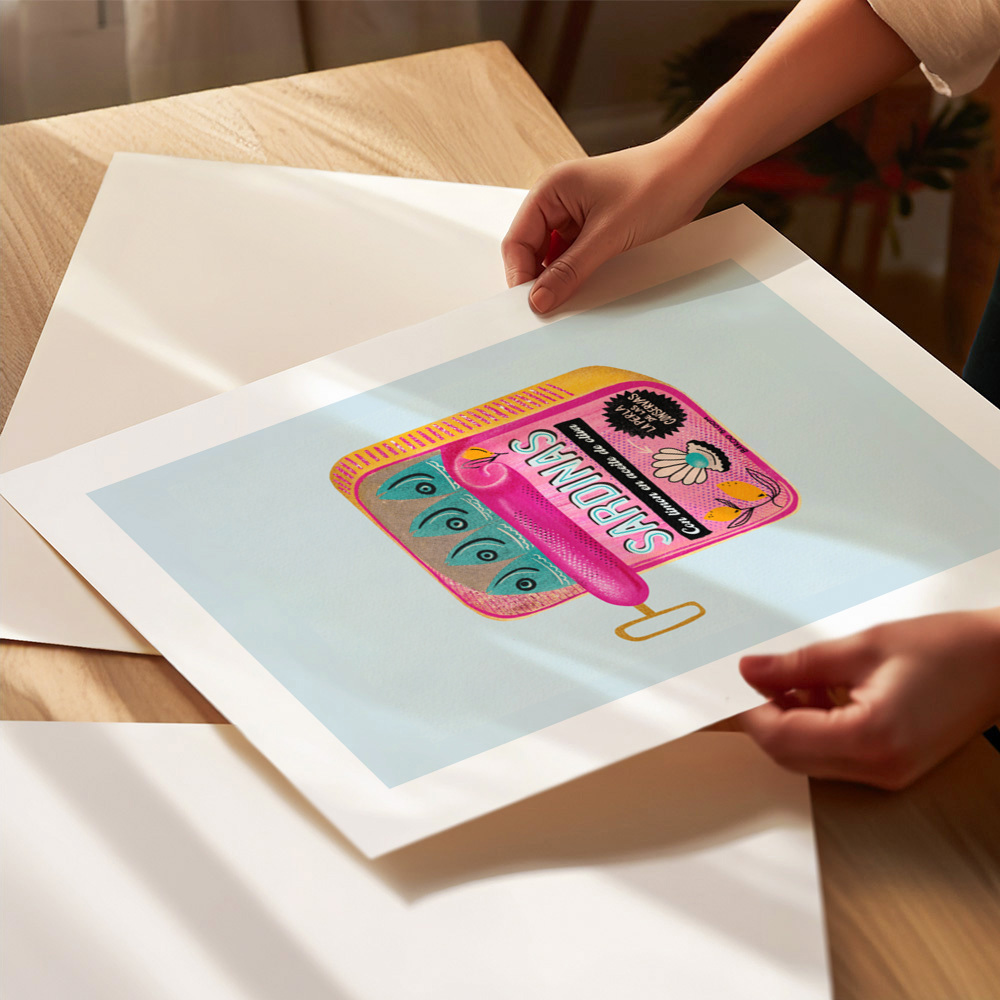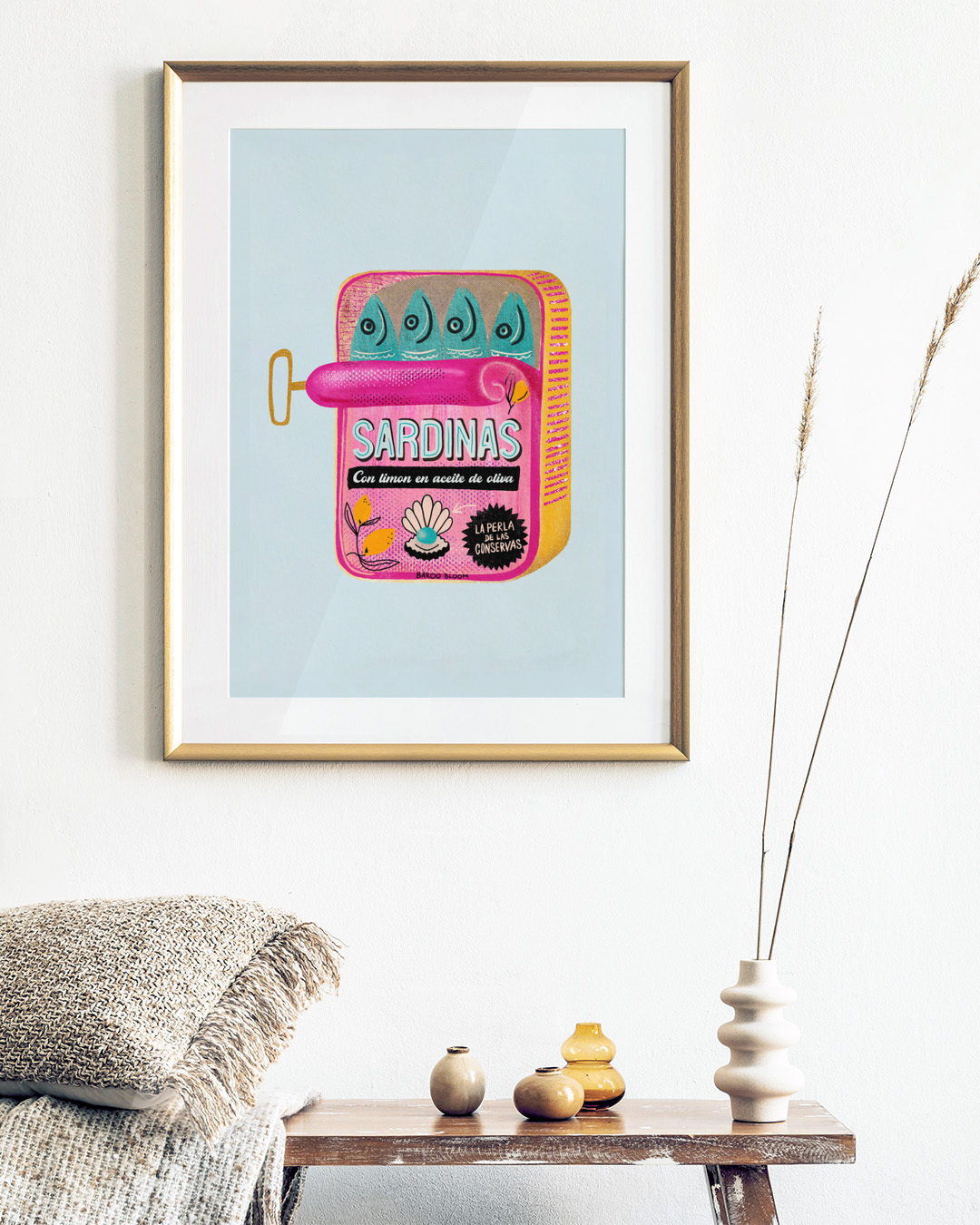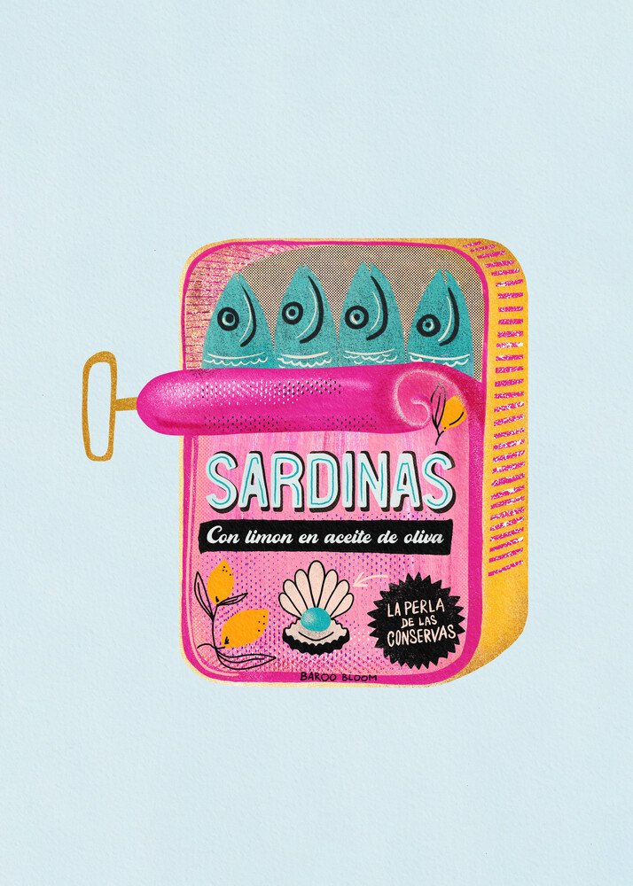 Een levendige en speelse illustratie van Baroo Bloom met een gestileerd sardineblik in felle kleuren. Het ontwerp vangt een speelse en gastronomische uitstraling in zijn unieke en boeiende stijl.
