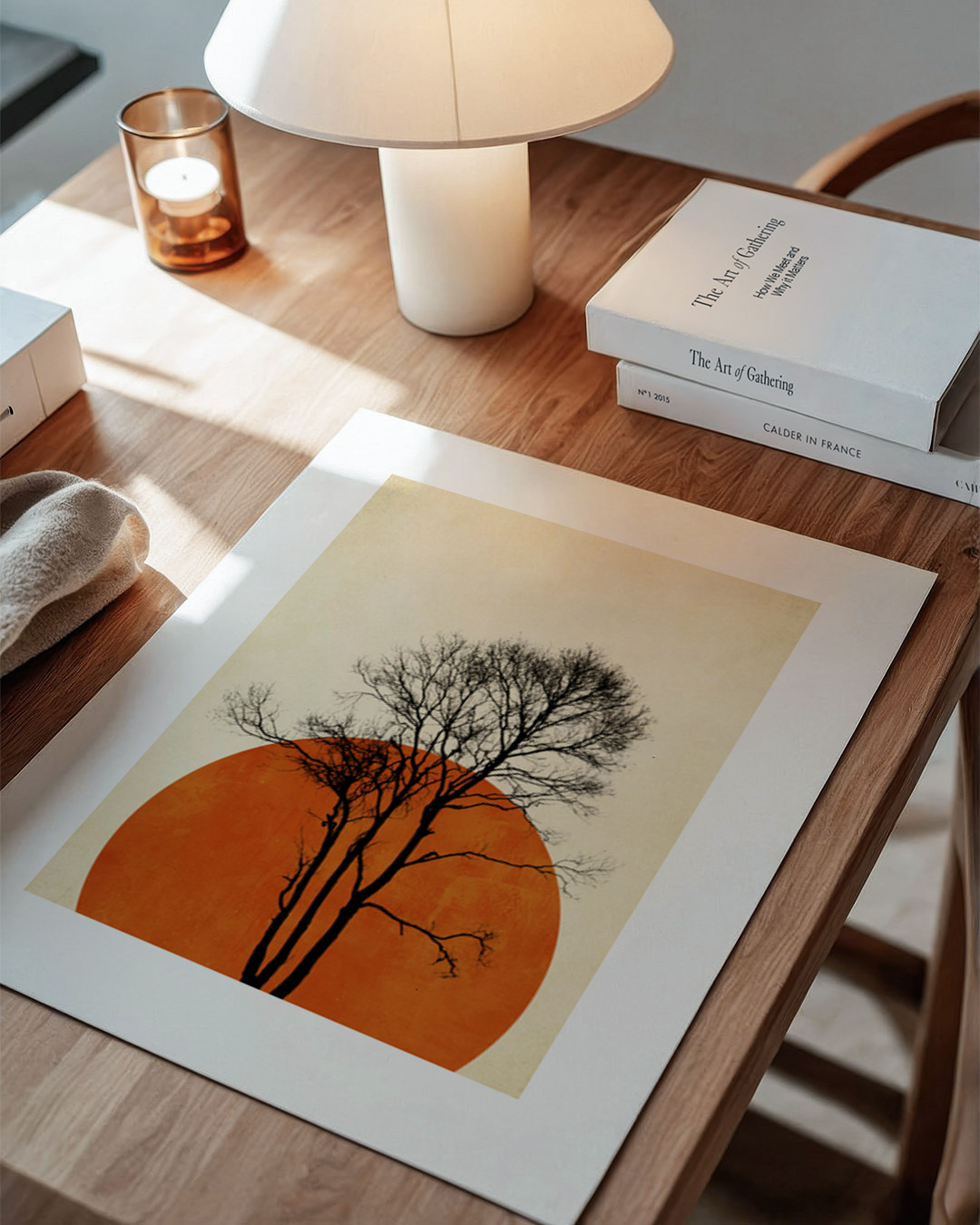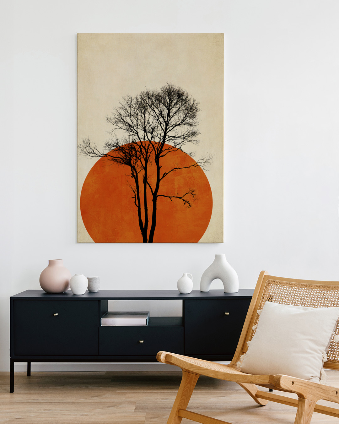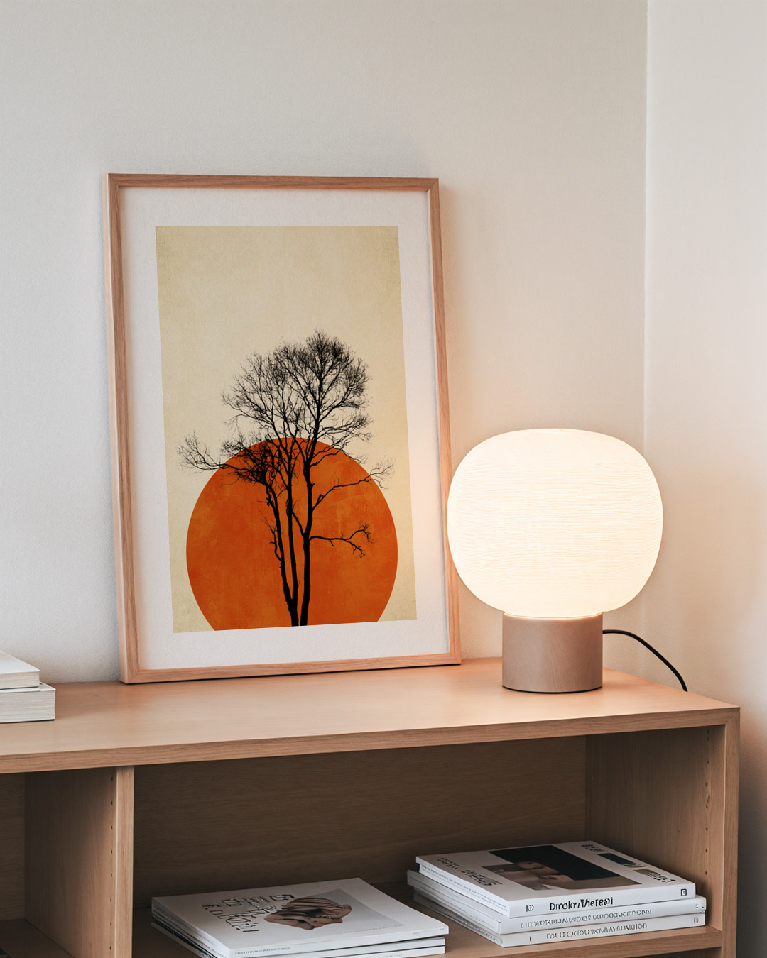 Een opvallende kunstafdruk van Boris Draschoff met een eenzame boom silhouet tegen een gedurfde geometrische oranje cirkel. Perfect voor natuurliefhebbers die op zoek zijn naar minimalistische maar krachtige decor.