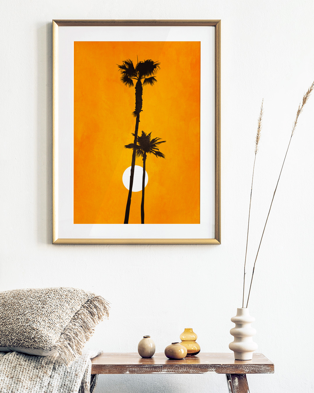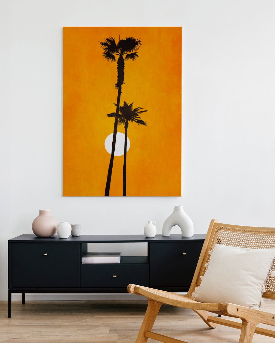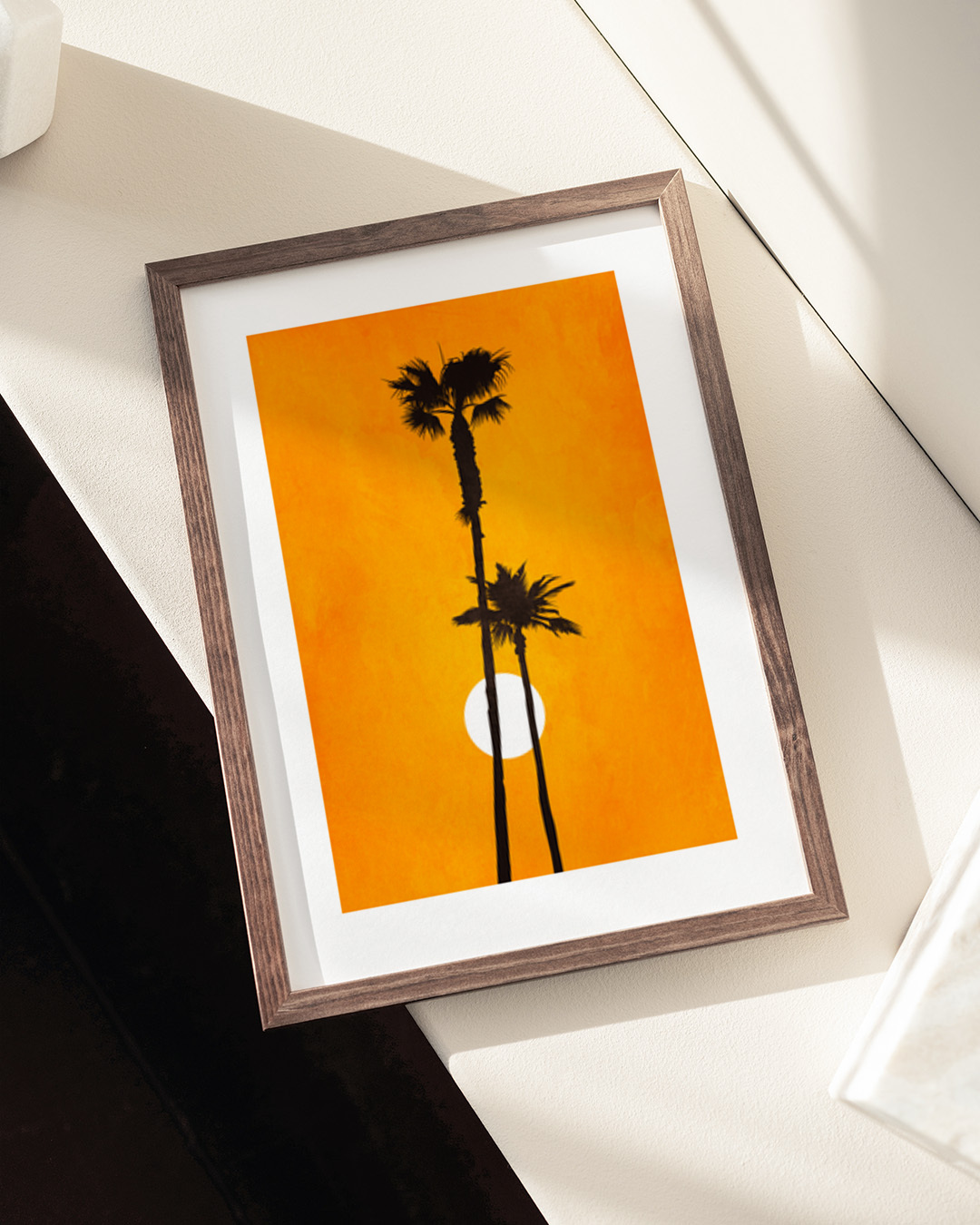 Een illustratie van Boris Draschoff die hoge palmsilhouetten tegen een levendige oranje achtergrond vastlegt. Het ontwerp roept een serene tropische zonsondergang op.