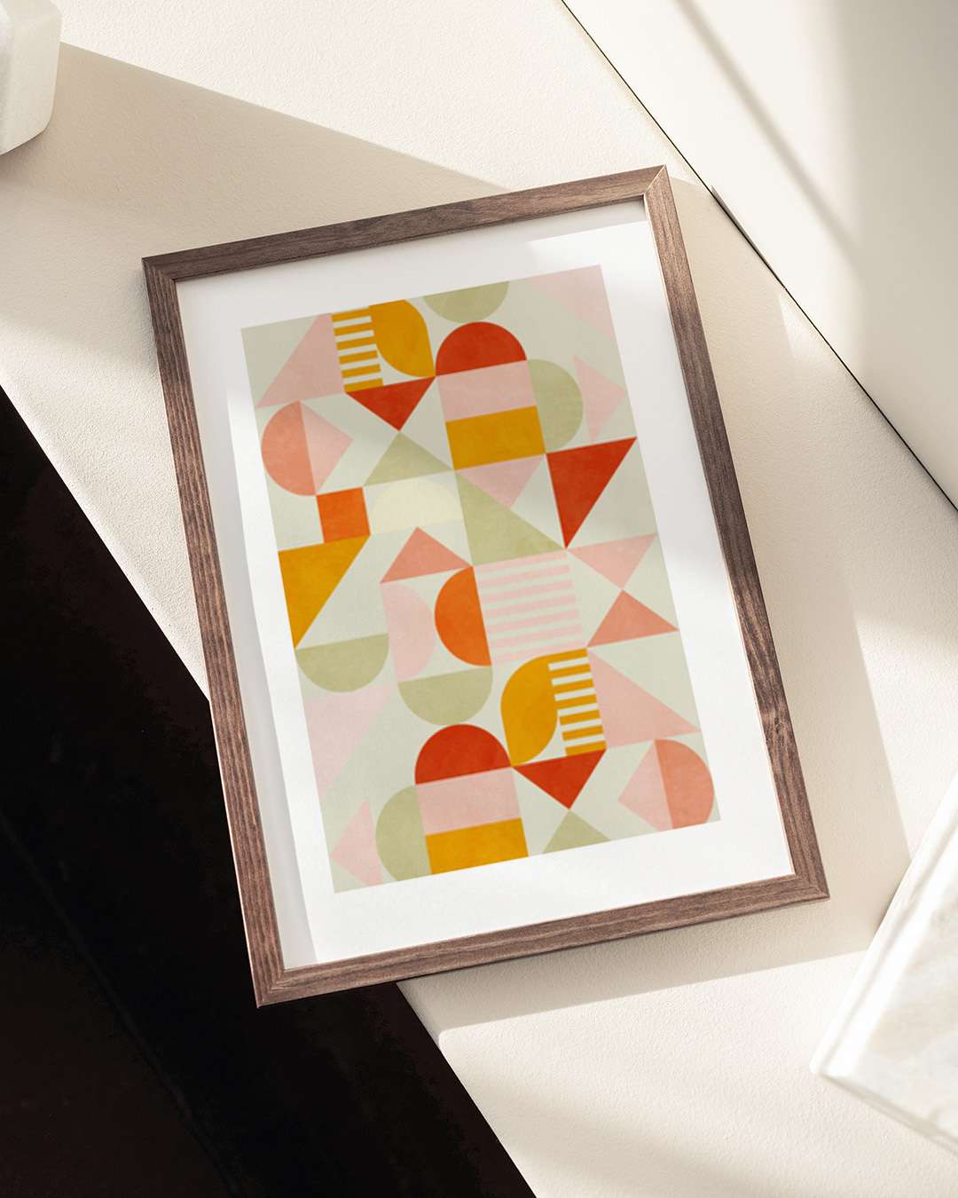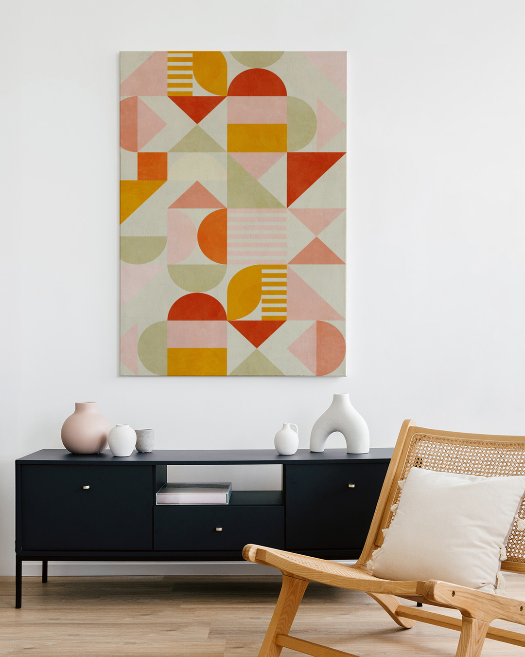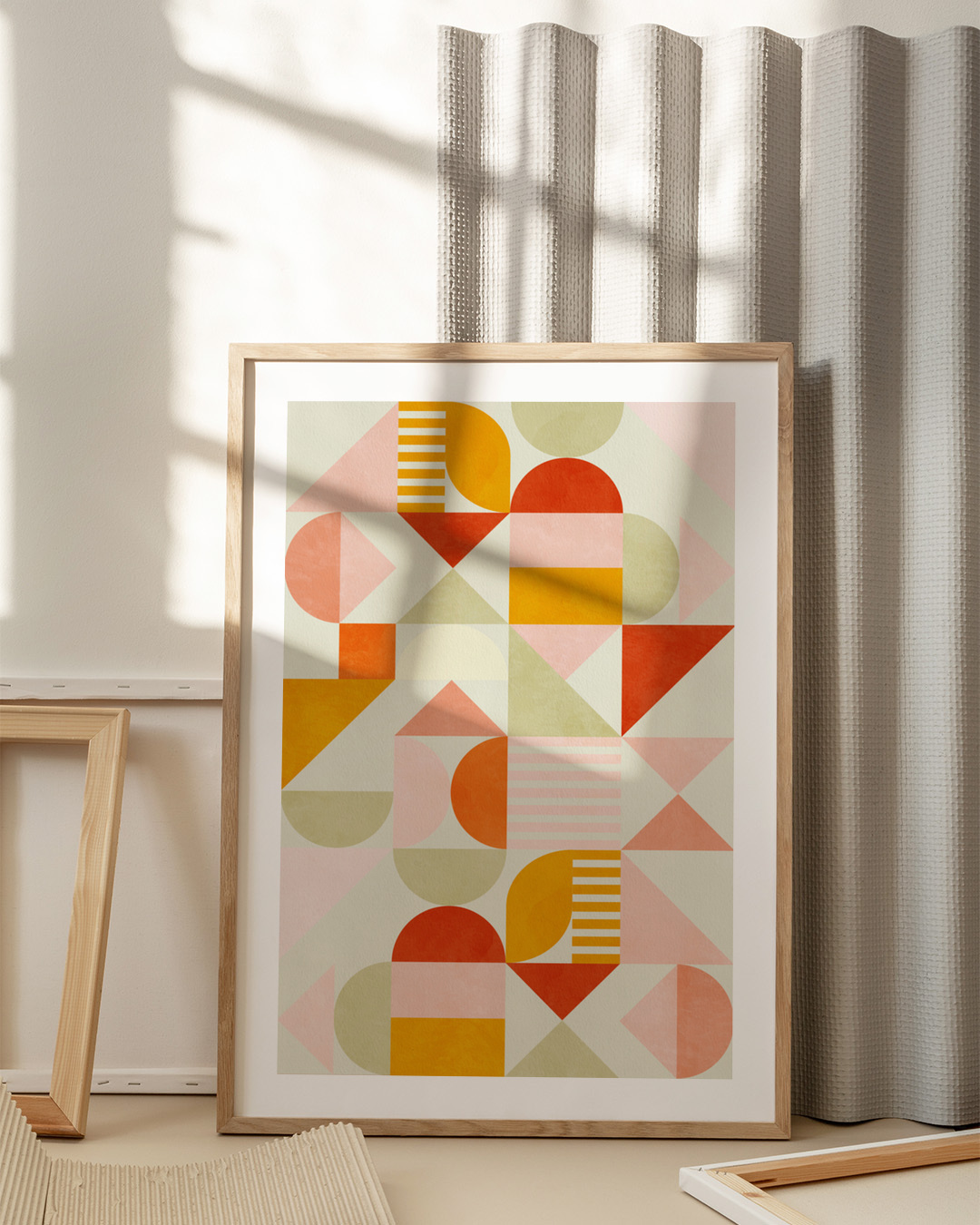 Ana Rut Bre's kunstwerk kenmerkt zich door speelse pasteltinten gerangschikt in geometrische vormen. Dit decoratieve stuk trekt de aandacht met zijn verbluffende symmetrie en levendige kleuren, perfect om een moderne touch aan elke kamer toe te voegen.