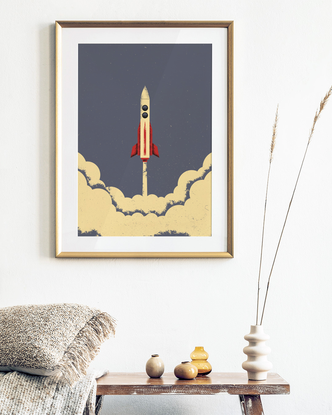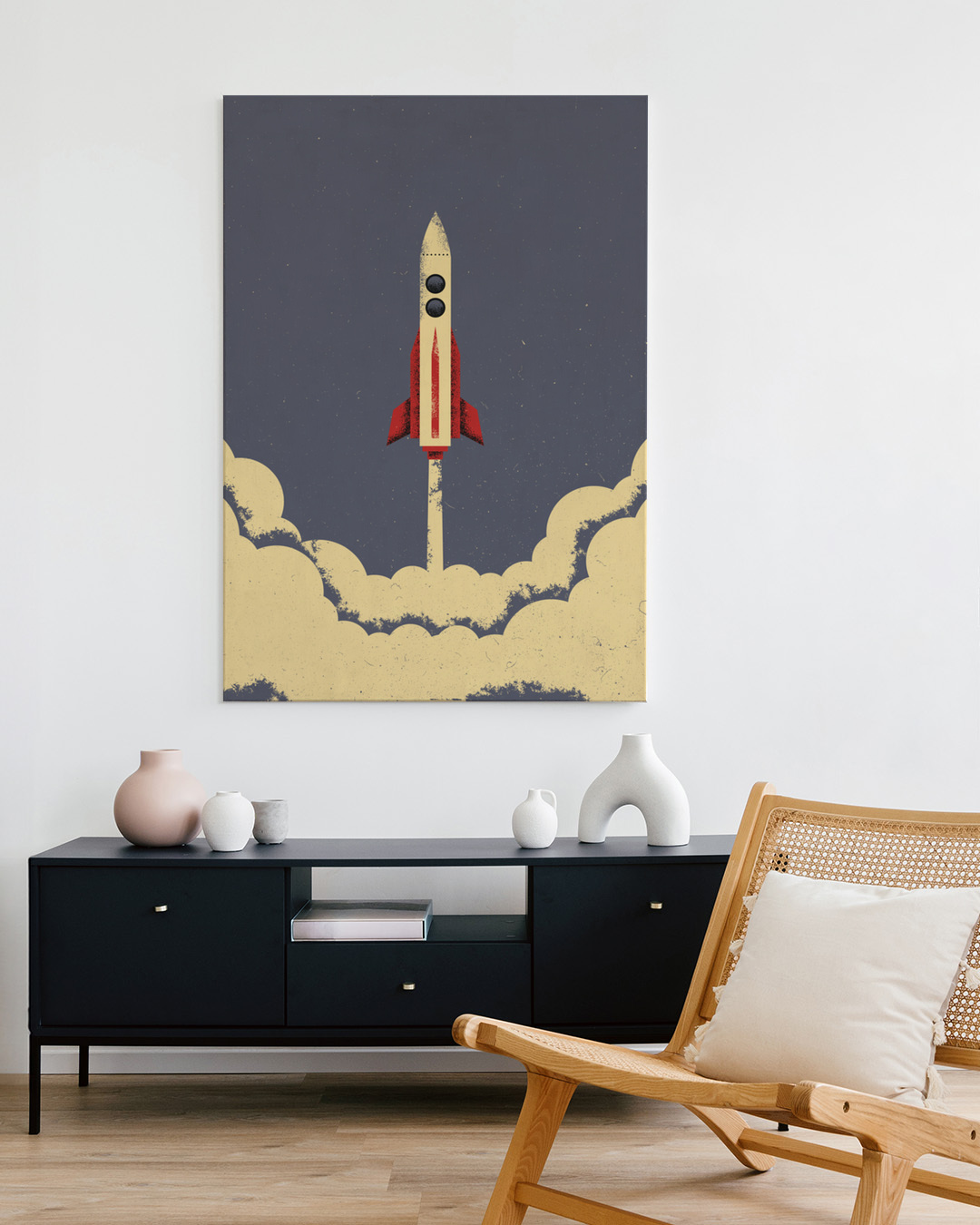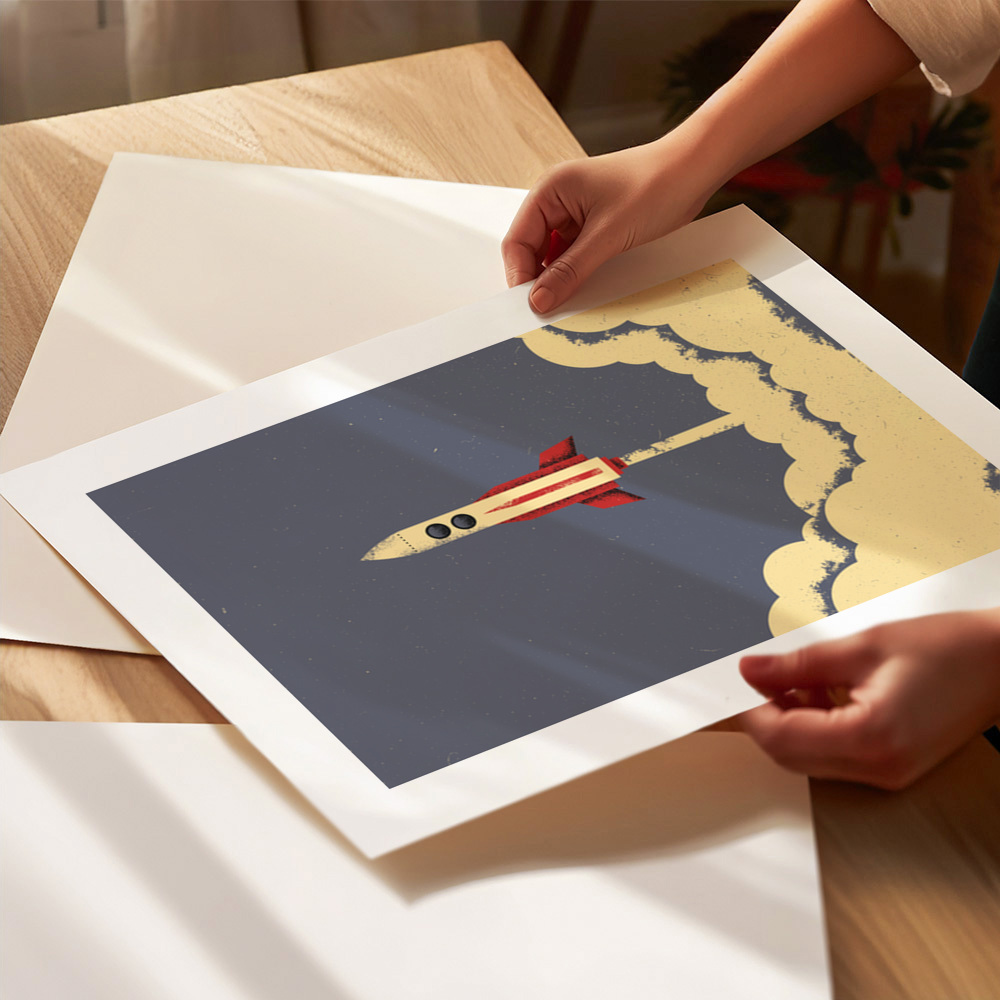 Het werk van Amer Karic toont een retro raket die te midden van wolken de ruimte in schiet. De nostalgische kleurtoon en simpele lijnen bieden een betoverende blik op het tijdperk van ruimteonderzoek.