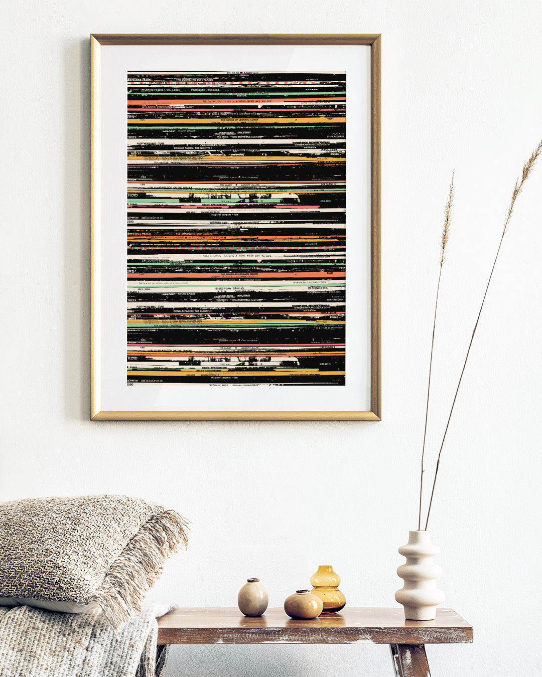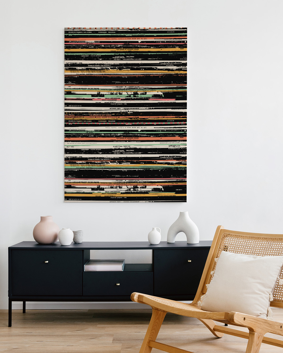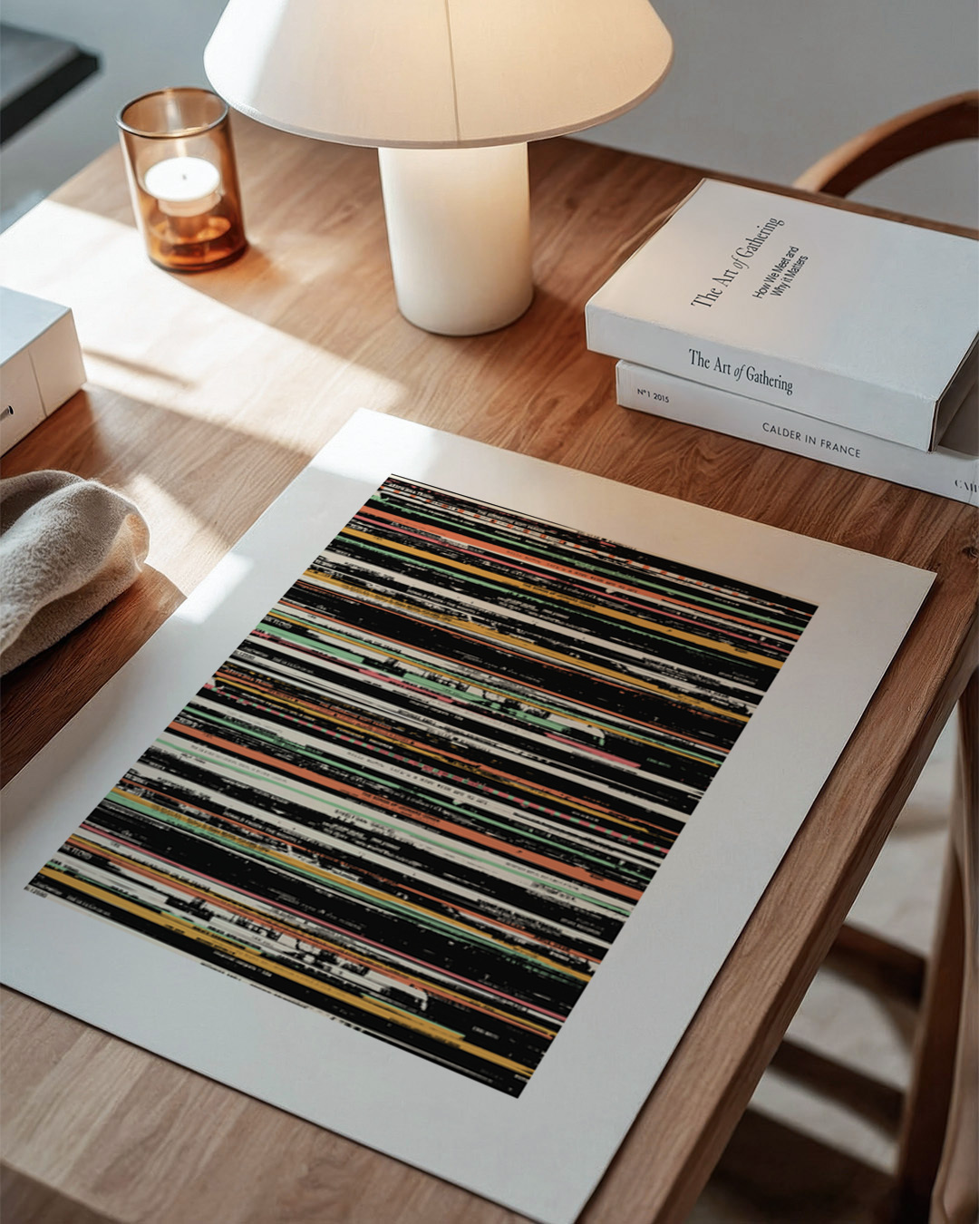 Duik in de retrowereld van muziek met deze gedetailleerde illustratie door Florent Bodart. Stapels vintage vinylplaten maken deze print tot een nostalgische ode aan het gouden tijdperk van LP's.