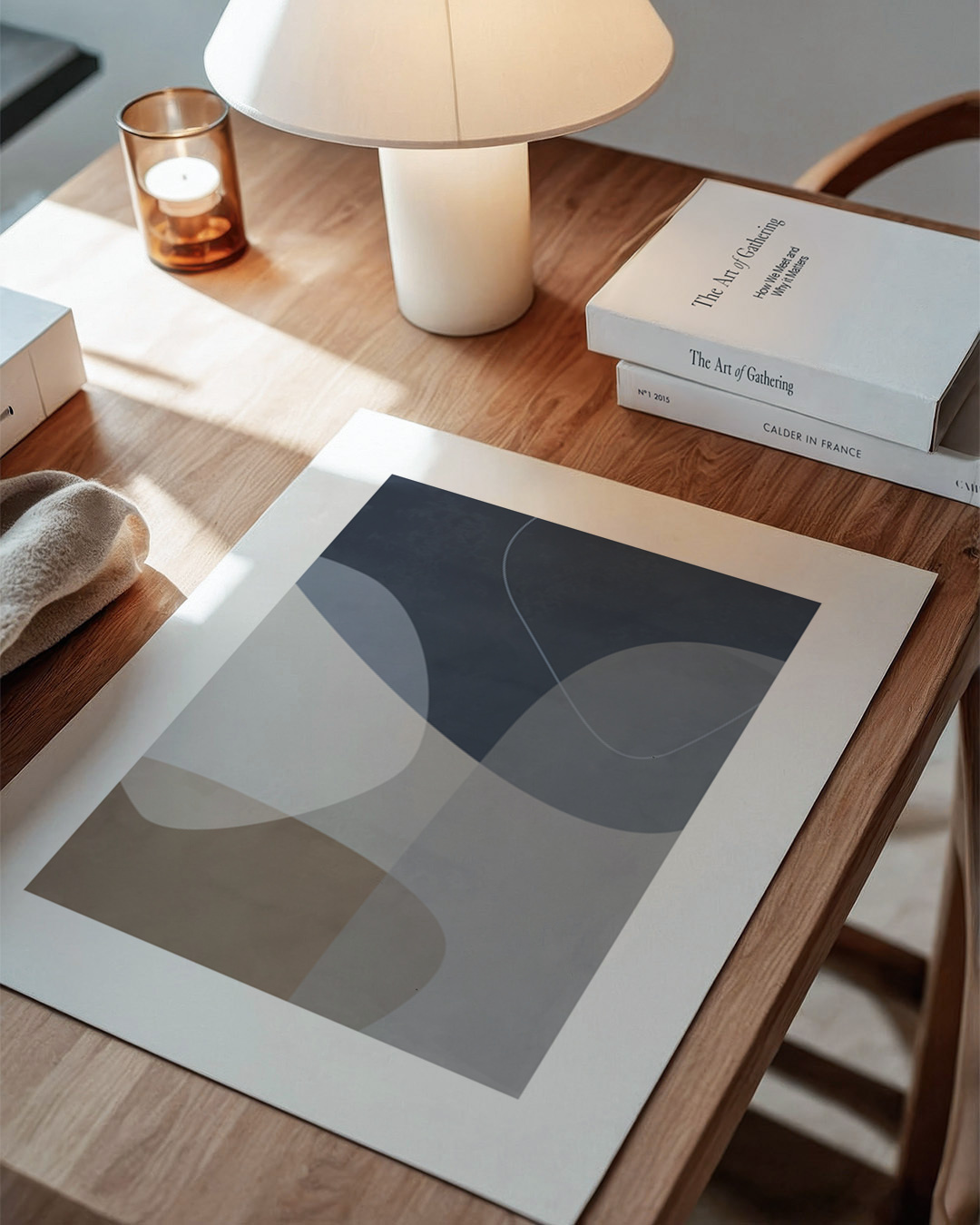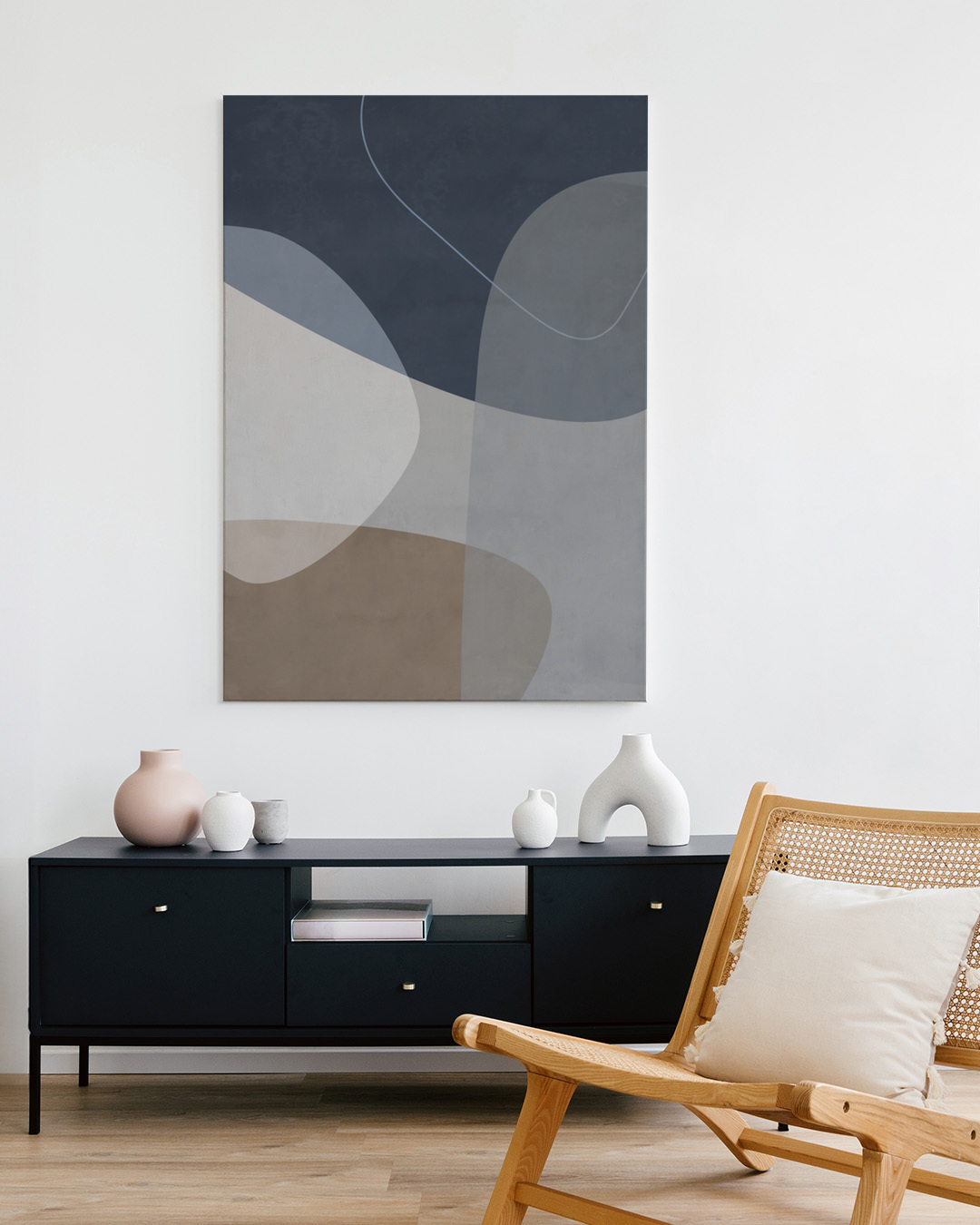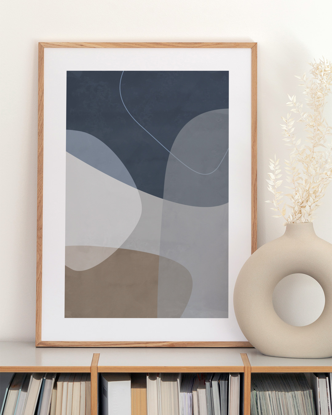 Het ontwerp van Mareike Böhmer omvat rustgevende krommen in kalmerende tinten blauw, turkoois en bruin. Deze serene grafiek brengt een vredige sfeer, ideaal voor een rustige ruimte.
