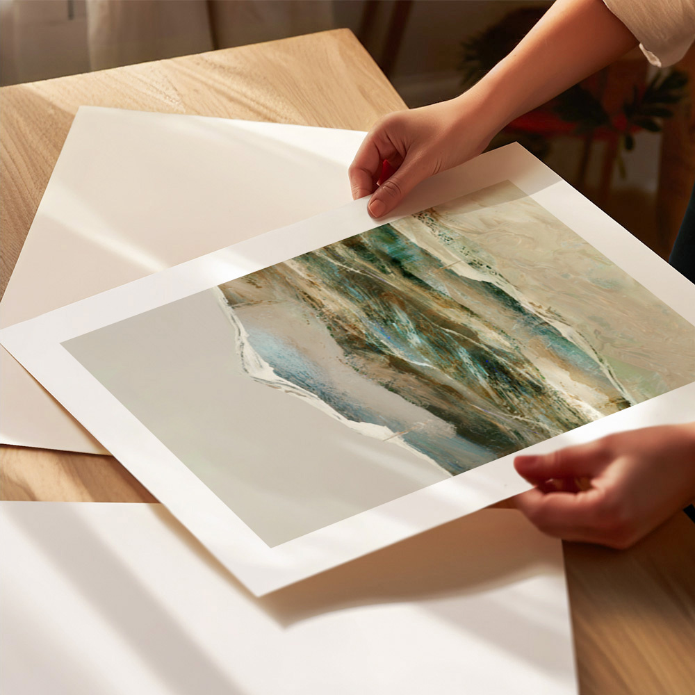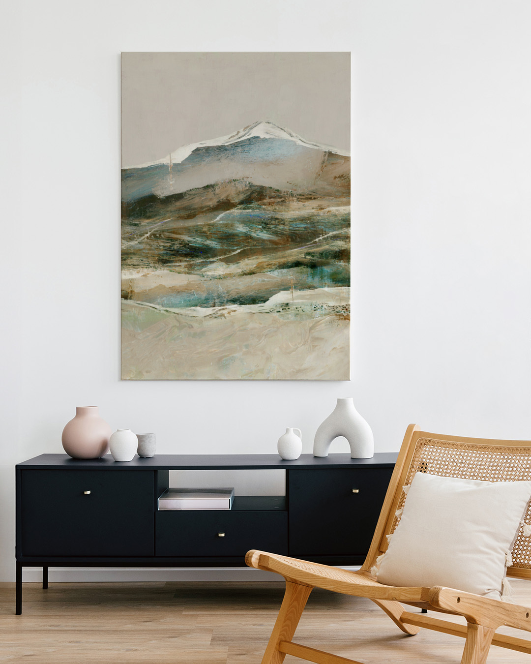 Geniet van de serene schoonheid van Dan Hobdays 'Cordillera' met deze rustgevende aquarel. Het landschap vangt de essentie van torenhoge bergen in een zachte kleurenpalet en brengt rust in elke ruimte.