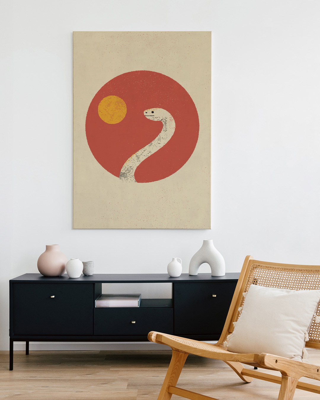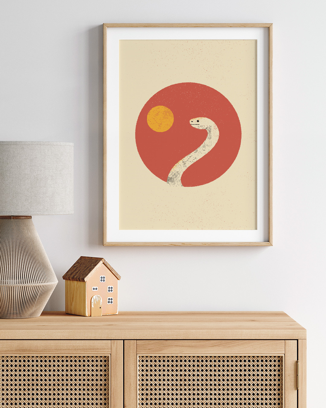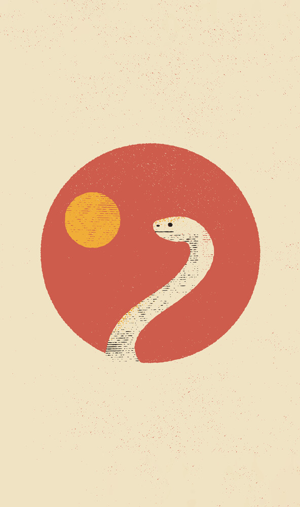 De illustratie van Amer Karic toont een witte slang onder een fel oranje zon. De simplistische stijl en aardetinten geven de design een sereen, woestijnachtig gevoel.