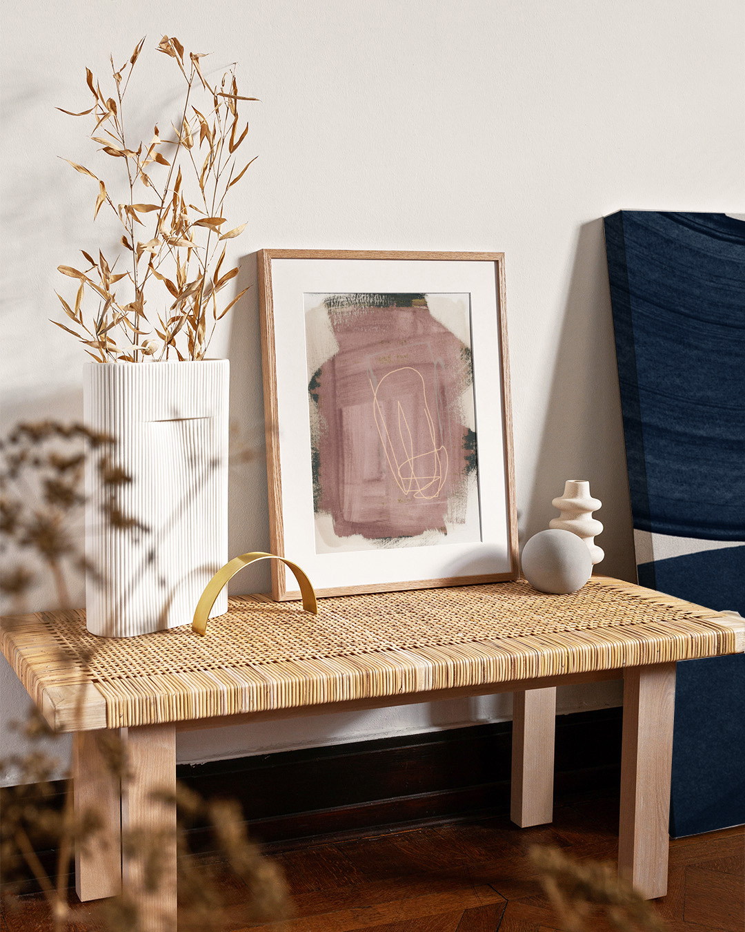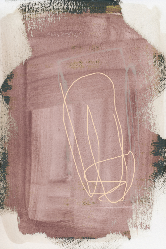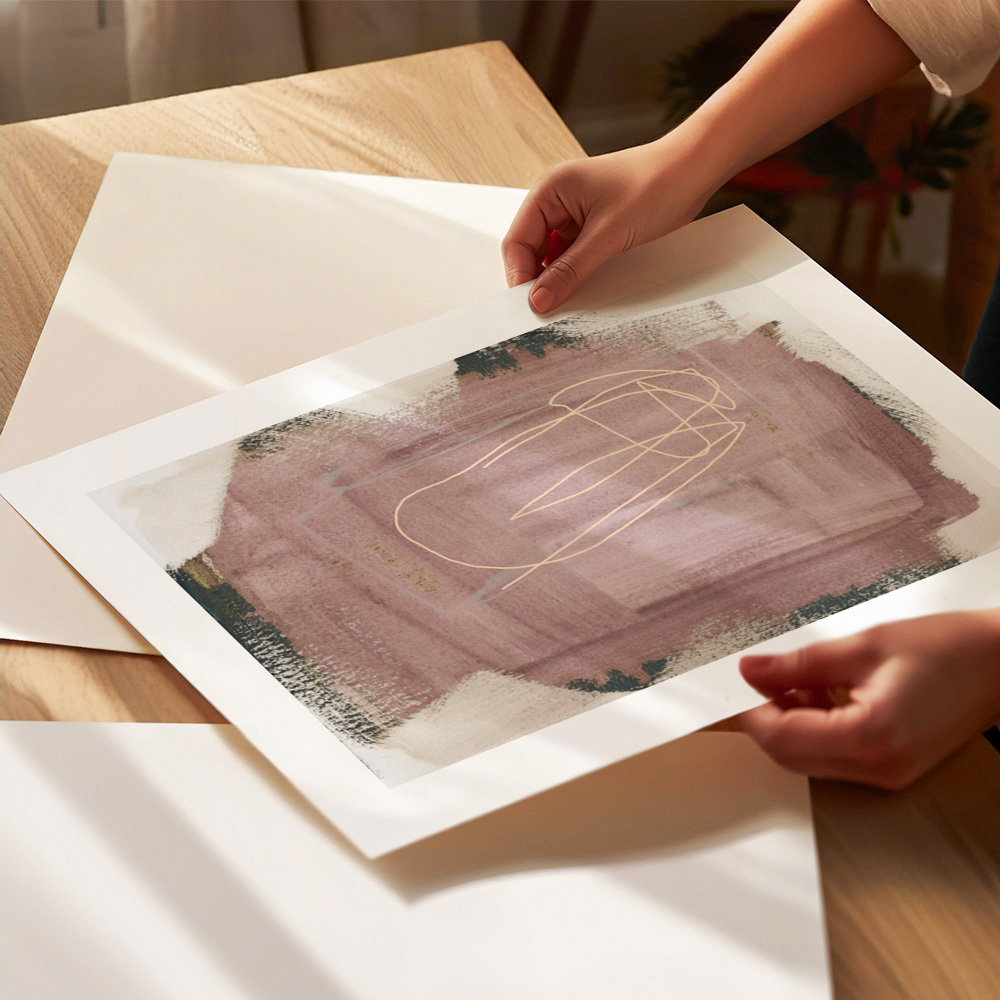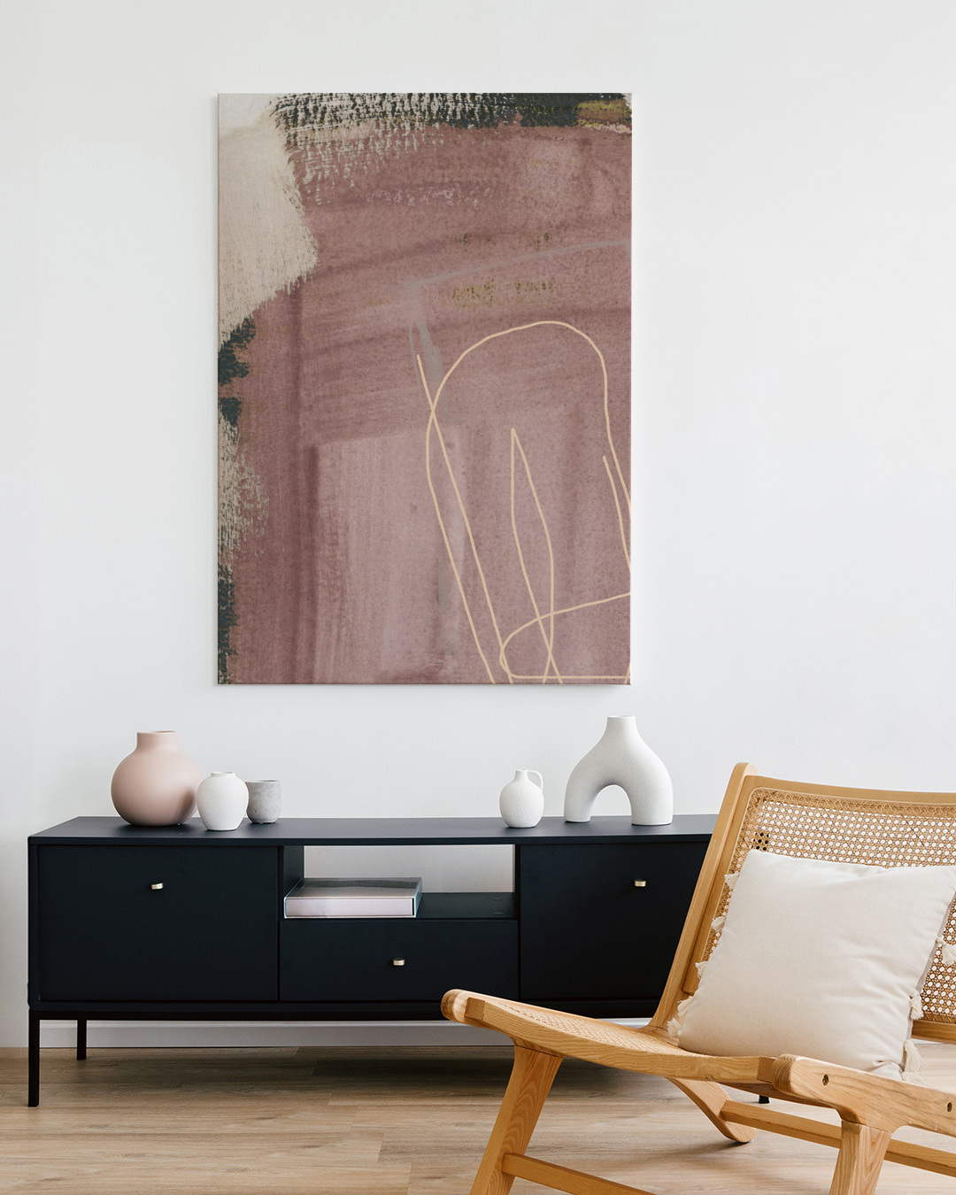 Verken de rustgevende combinatie van abstracte lijnen en aardse penseelstreken in deze compositie van Mareike Böhmer. De zachte oud-roze en beige tinten roepen een gevoel van rust en balans op, waardoor het een perfecte aanvulling is op elke ruimte die naar sereniteit streeft.