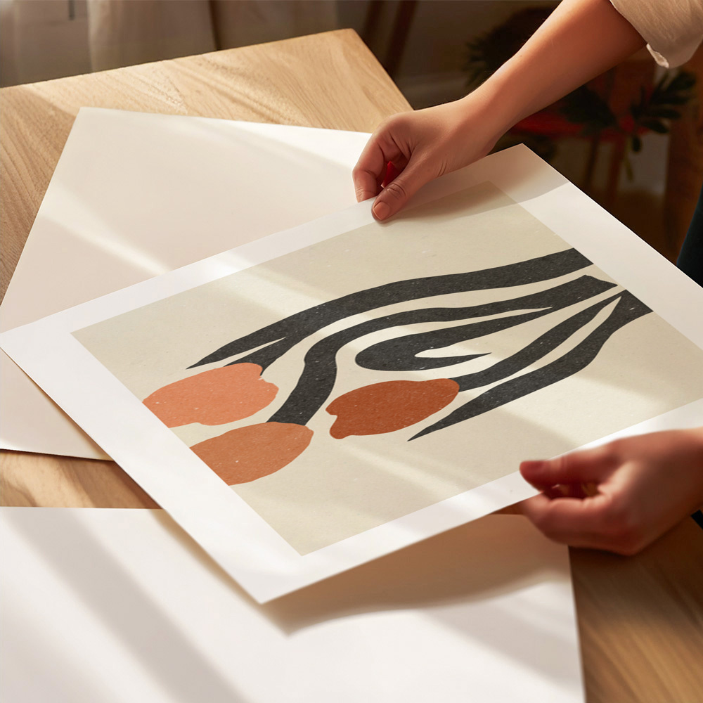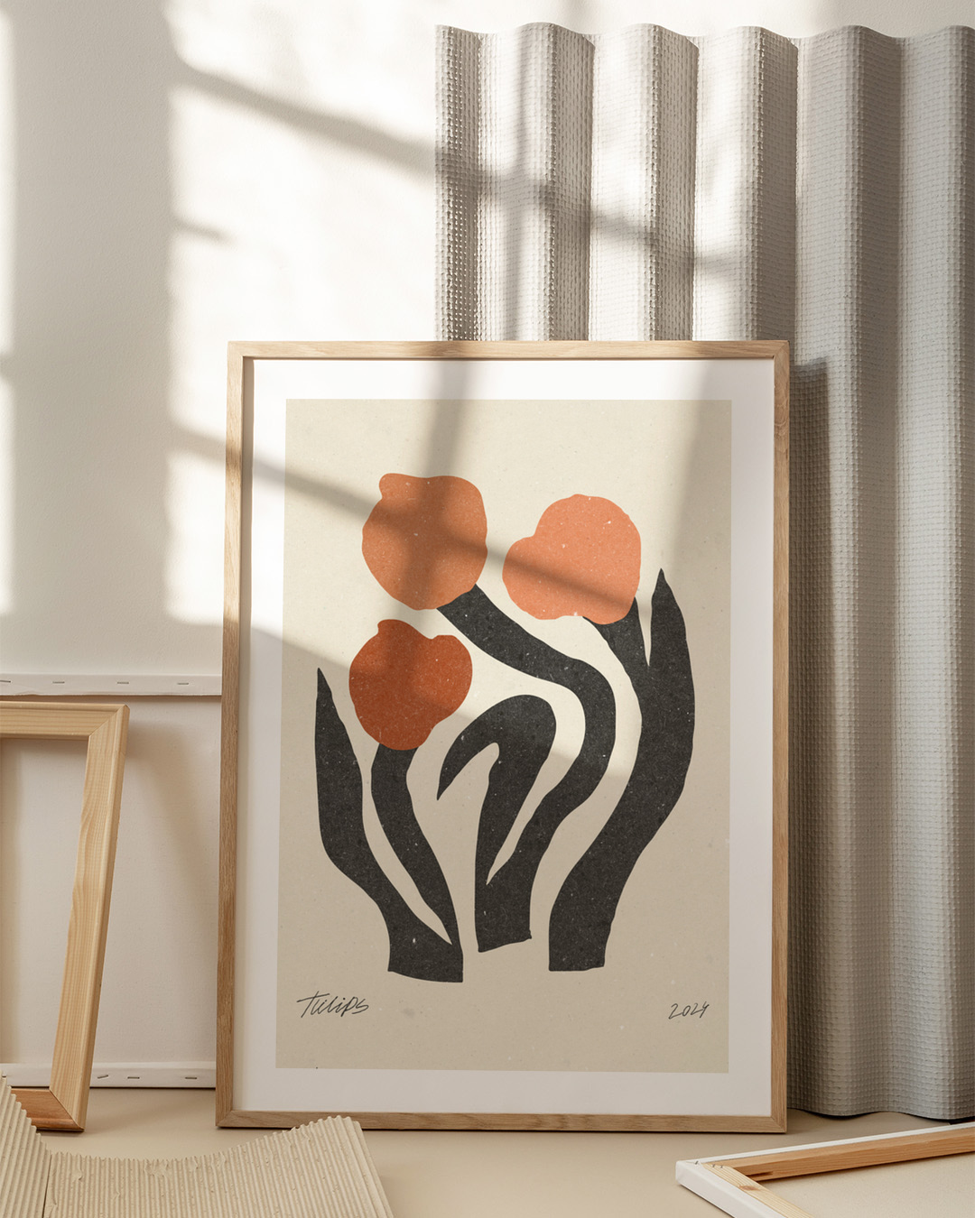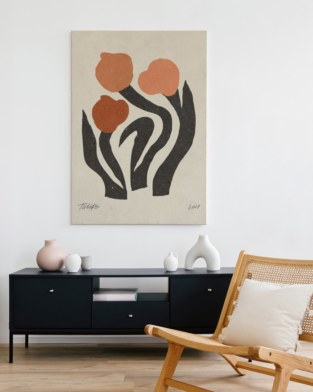 Deze moderne grafische interpretatie van tulpen toont drie gestileerde bloemen in aardetinten tegen een neutrale achtergrond. De gedurfde lijnen en minimalistische ontwerp brengen een frisse kijk op botanische kunst.