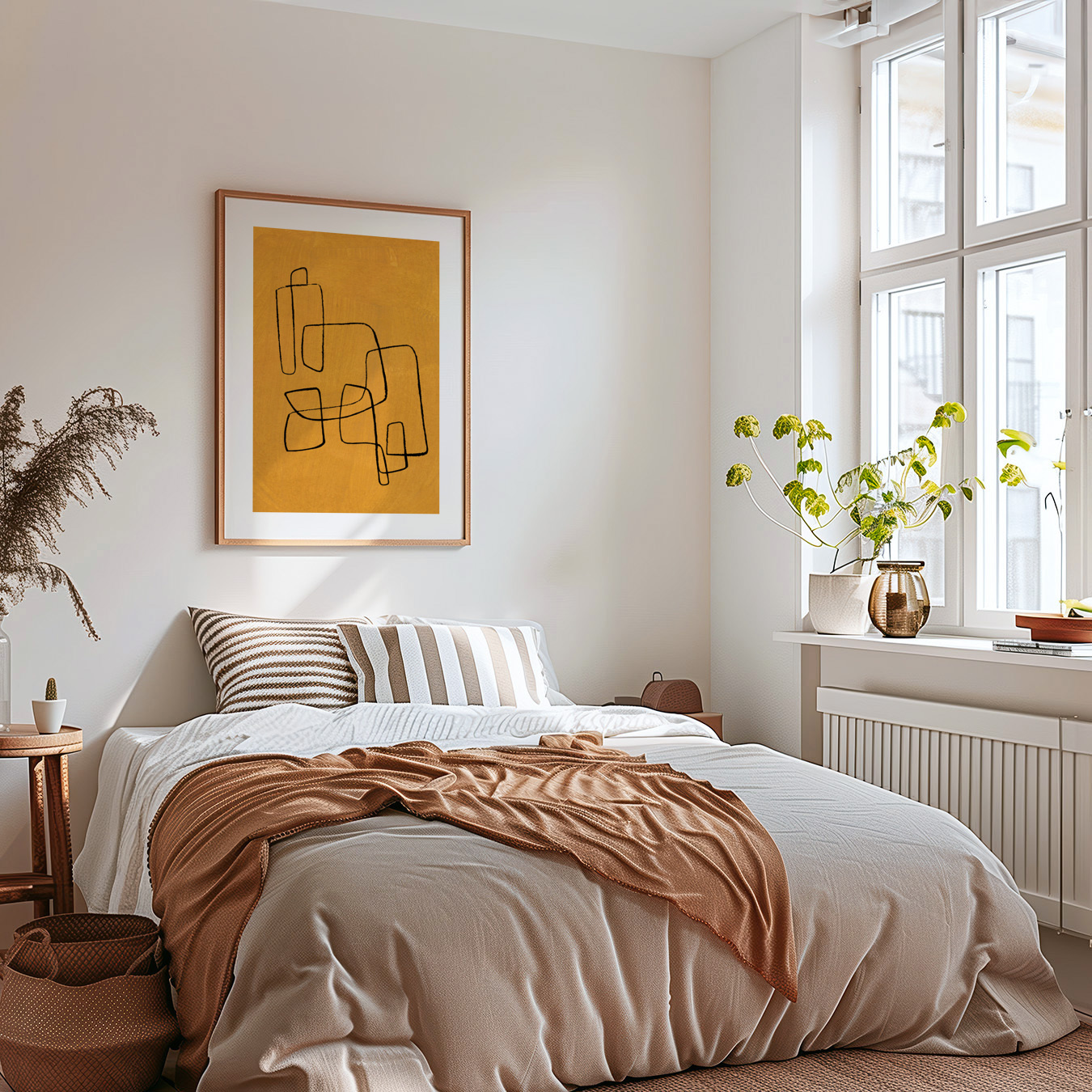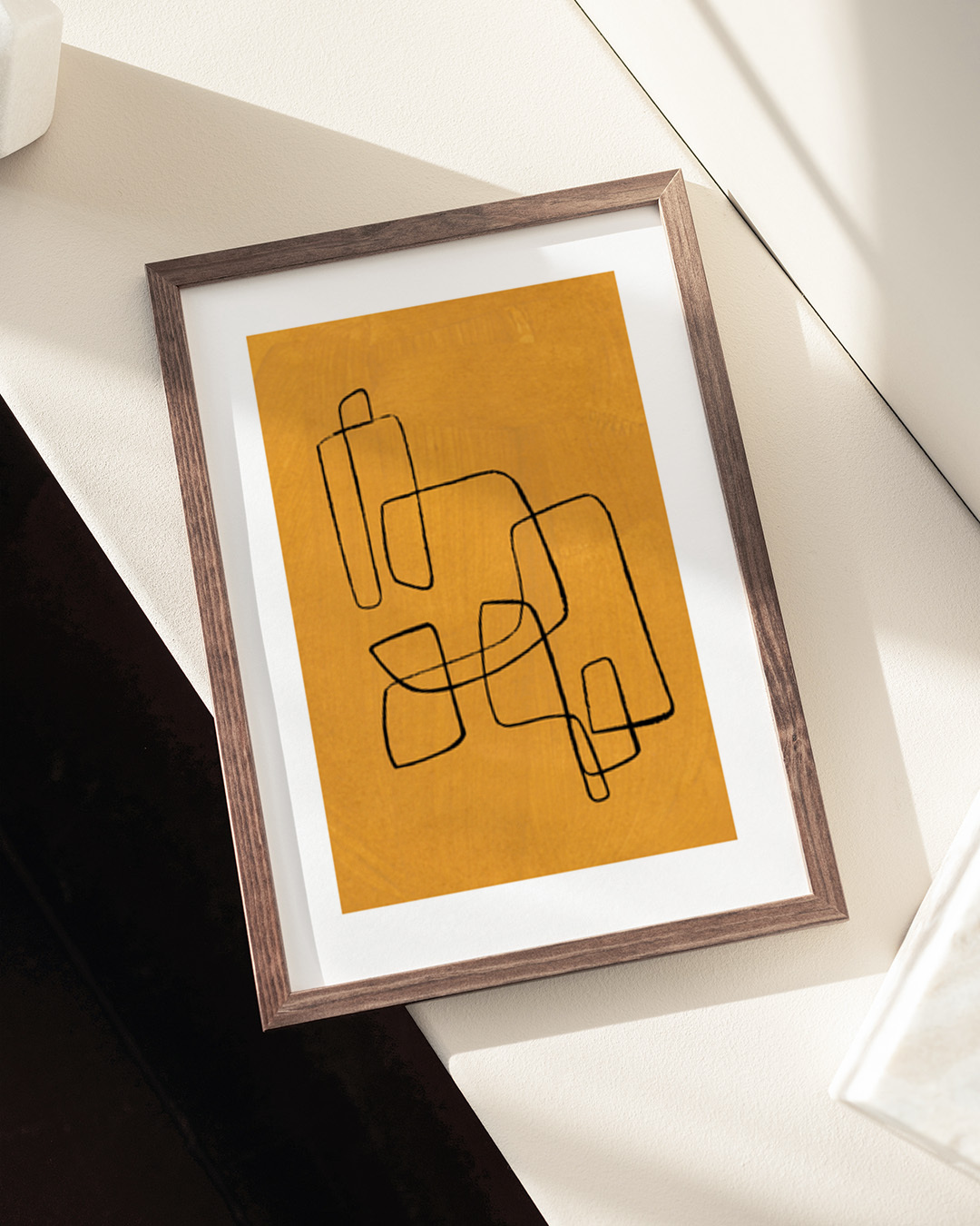 Ontdek het ingewikkelde ontwerp van kruisende lijnen tegen een rijke oranje achtergrond. De zwarte lijnen vormen een dynamisch doolhofachtig patroon, wat diepte toevoegt vanuit elke hoek. Perfect voor minimalisten.