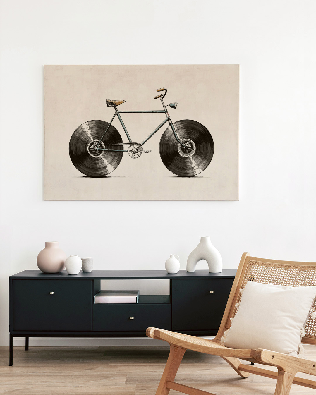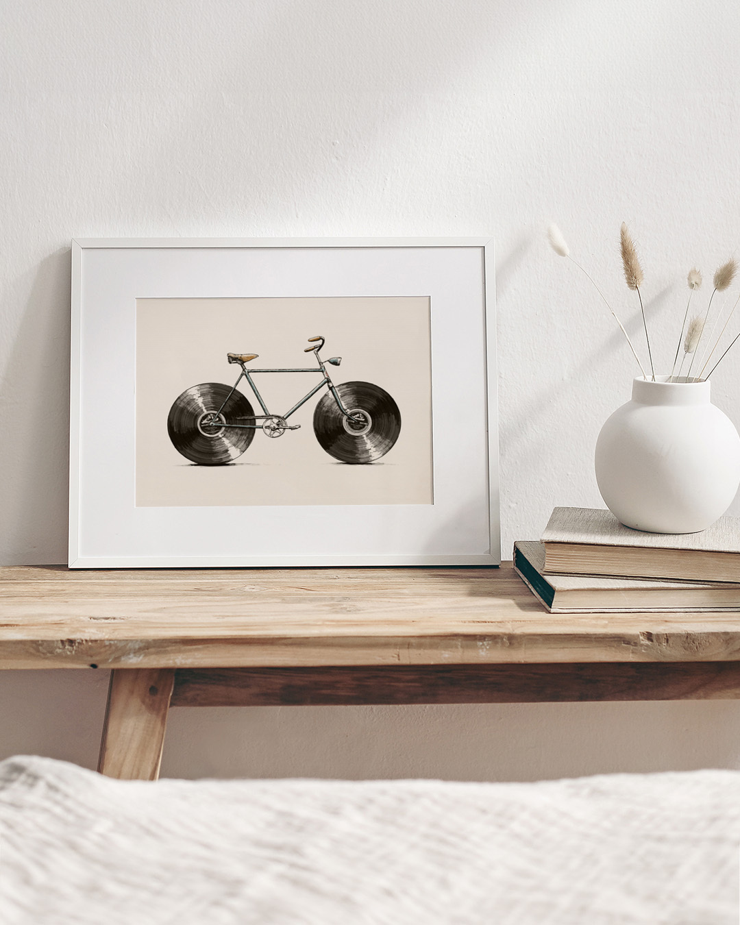 Florent Bodarts speelse ontwerp toont een vintage fiets met vinylplaten als wielen, waardoor retro charme en moderne creativiteit samenkomen. Deze beige getinte illustratie voegt een vleugje nostalgie toe aan elke ruimte.