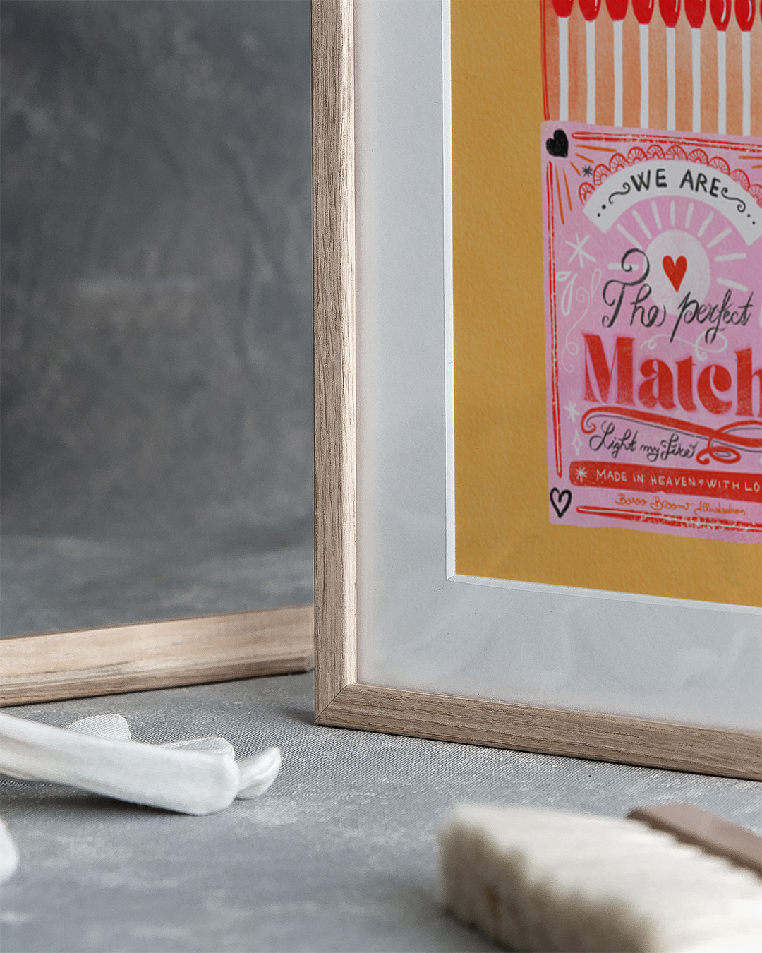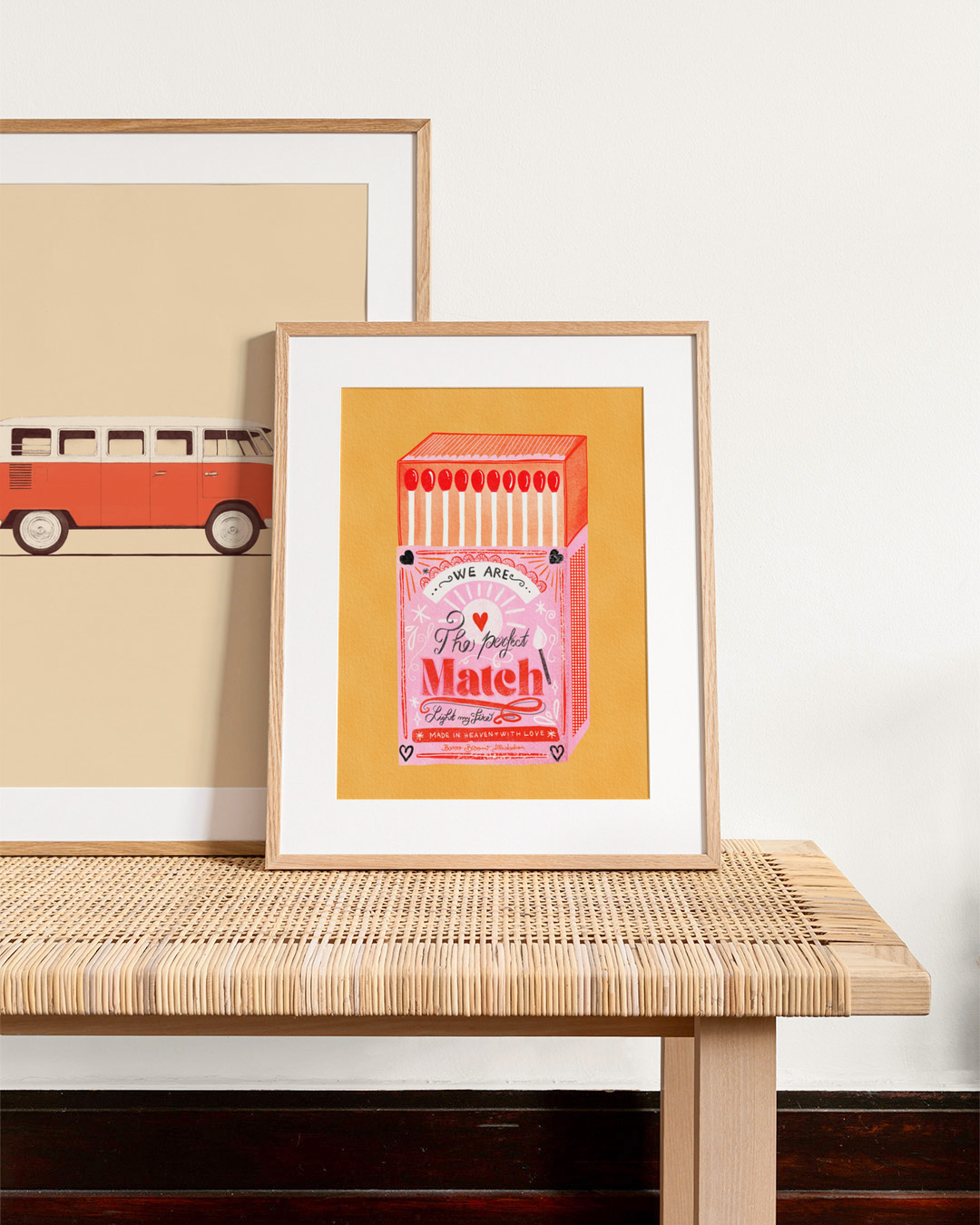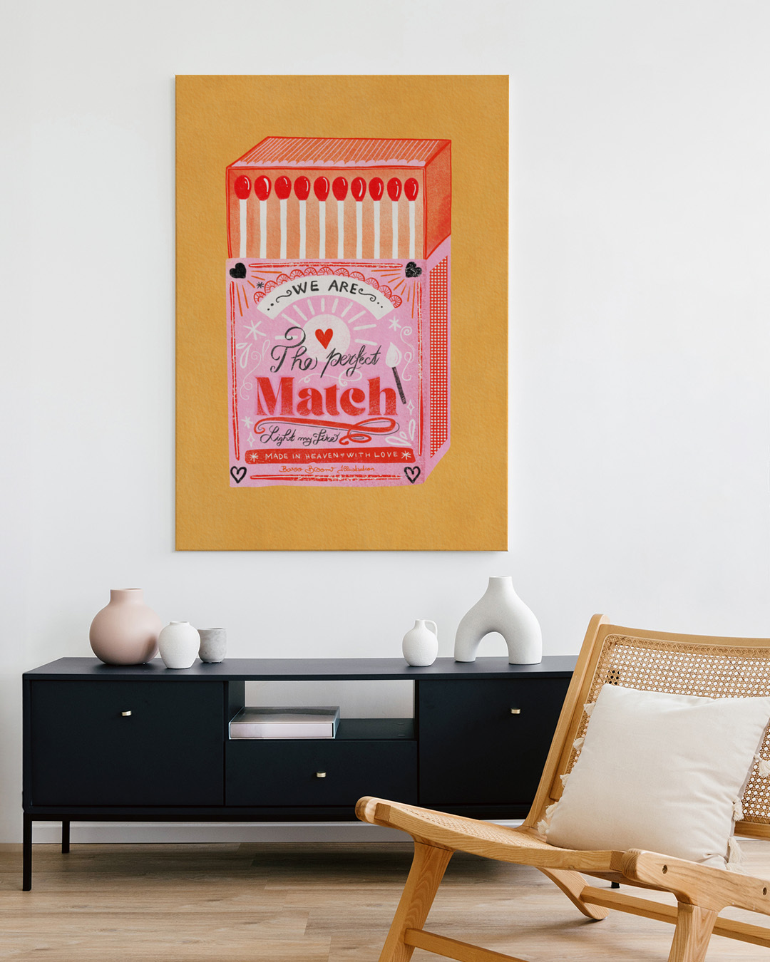Een charmante vintage illustratie van een luciferdoosje met de tekst 'The Perfect Match.' Gemaakt door Baroo Bloom, deze stuk roept nostalgie en grilligheid op.
