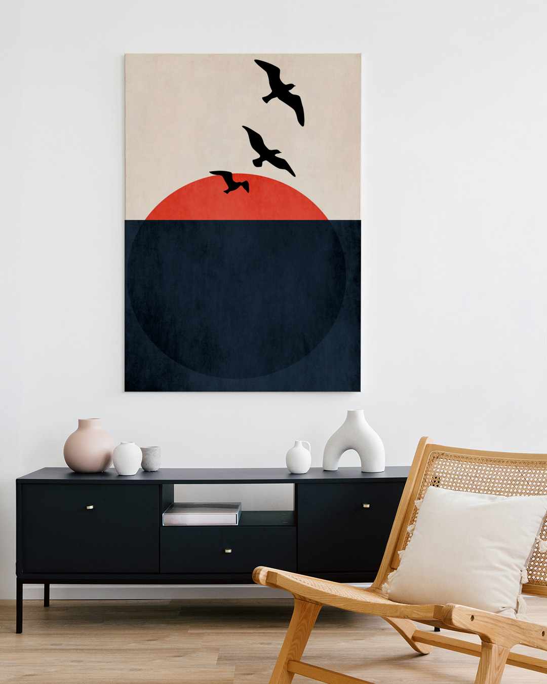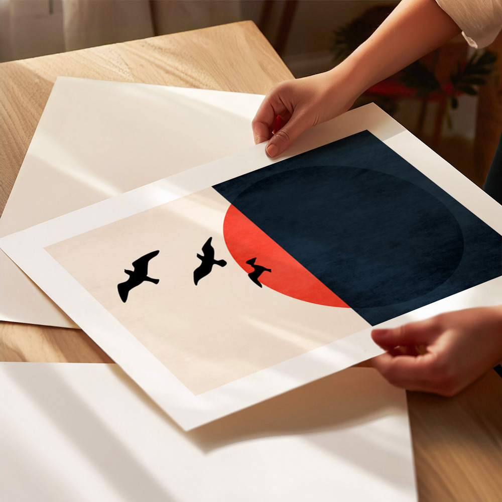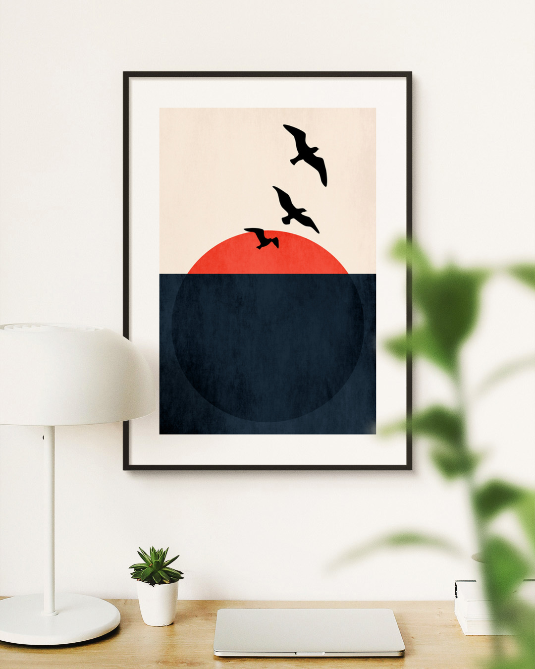 Een boeiende kunstprint van Boris Draschoff, met een contrasterend ontwerp van vliegende vogels en een ondergaande zon. Perfect om elegantie en rust in elke ruimte te brengen.