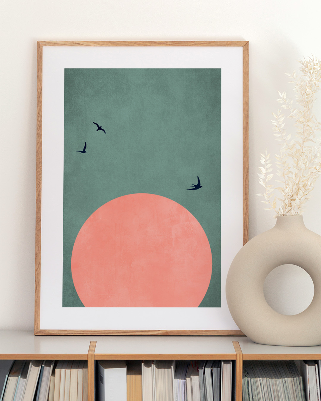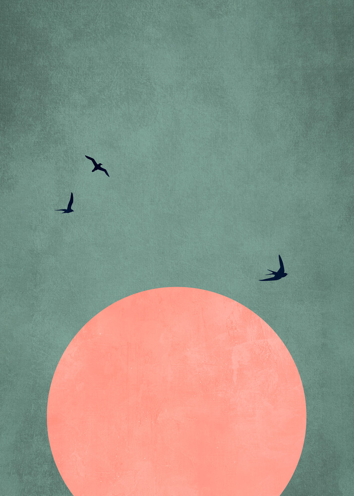 Ervaar de sereniteit van de natuur met Boris Draschoffs weergave van vogels die hoog vliegen tegen een zachte zonsondergang. Illustratie van serene rust, met silhouetten tegen de levendige roze zon die boeien en tot reflectie uitnodigen.