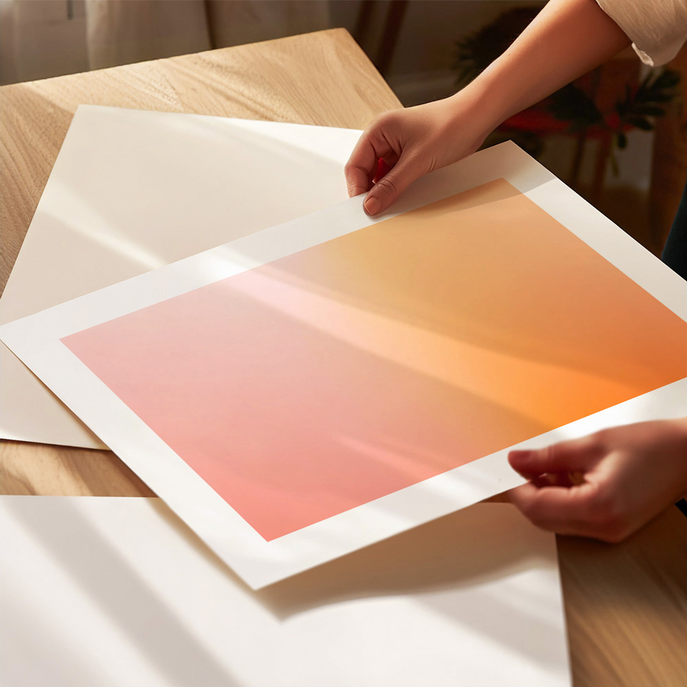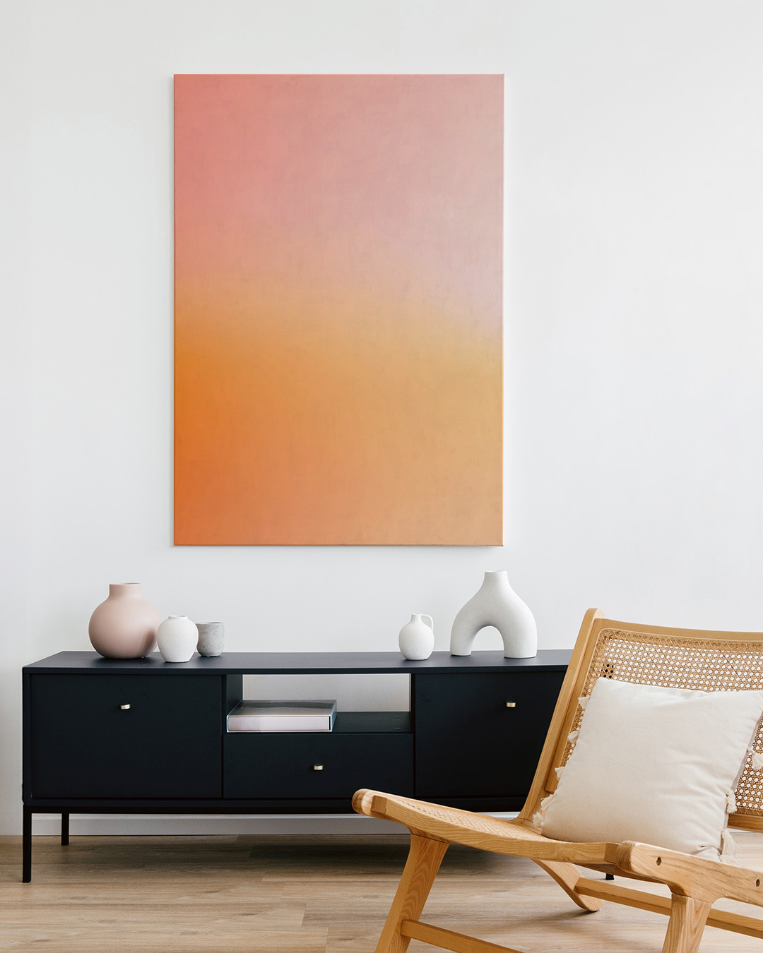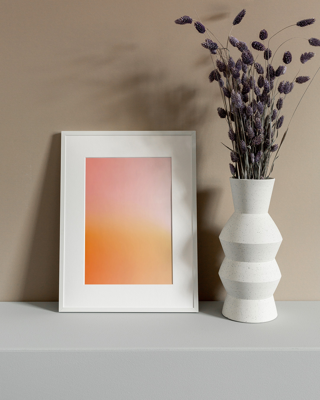 Vang de warmte van een gloedvolle zonsondergang met deze abstracte kunstdruk, met tinten van oranje en roze. Perfect om een gezellige uitstraling aan je ruimte toe te voegen.