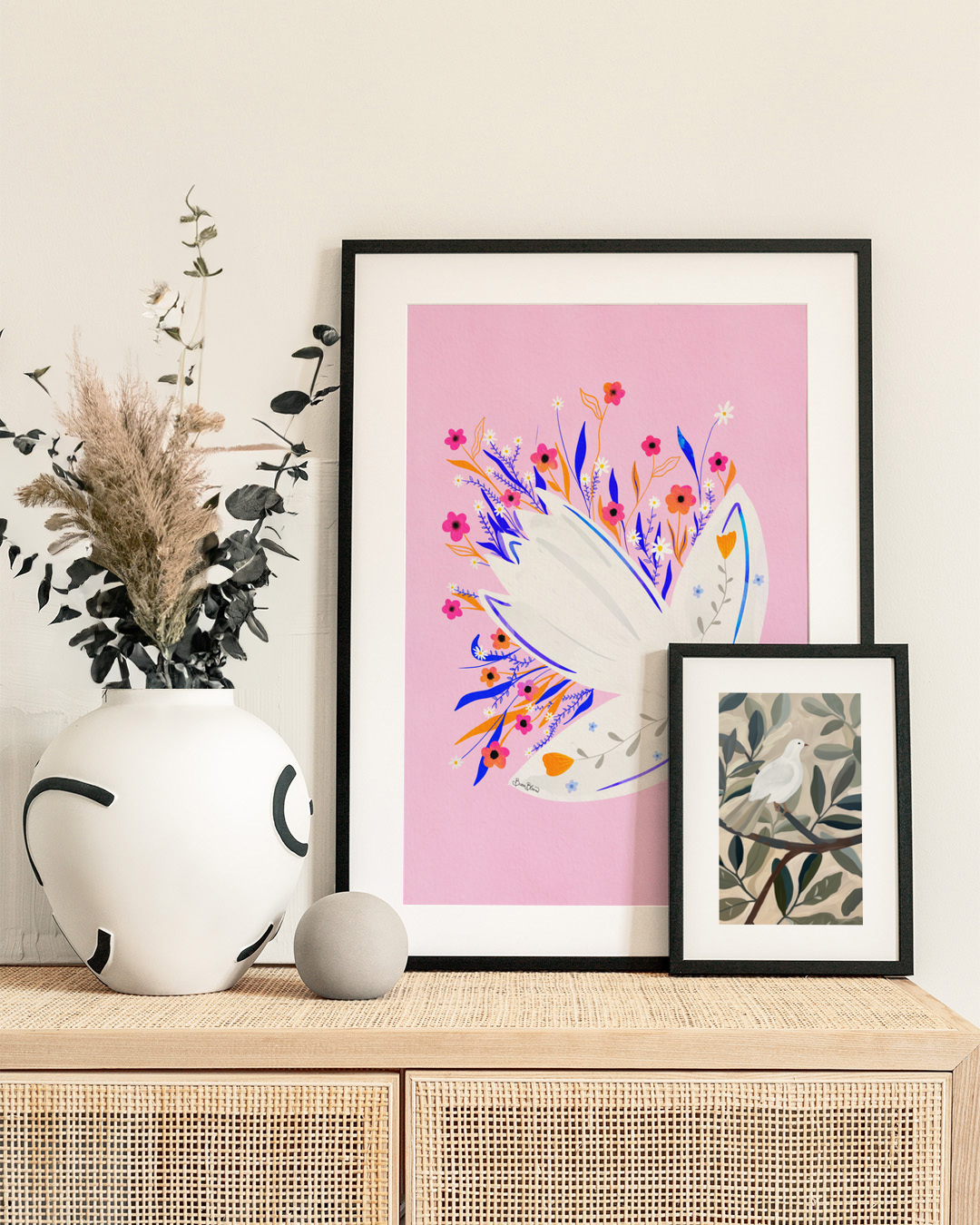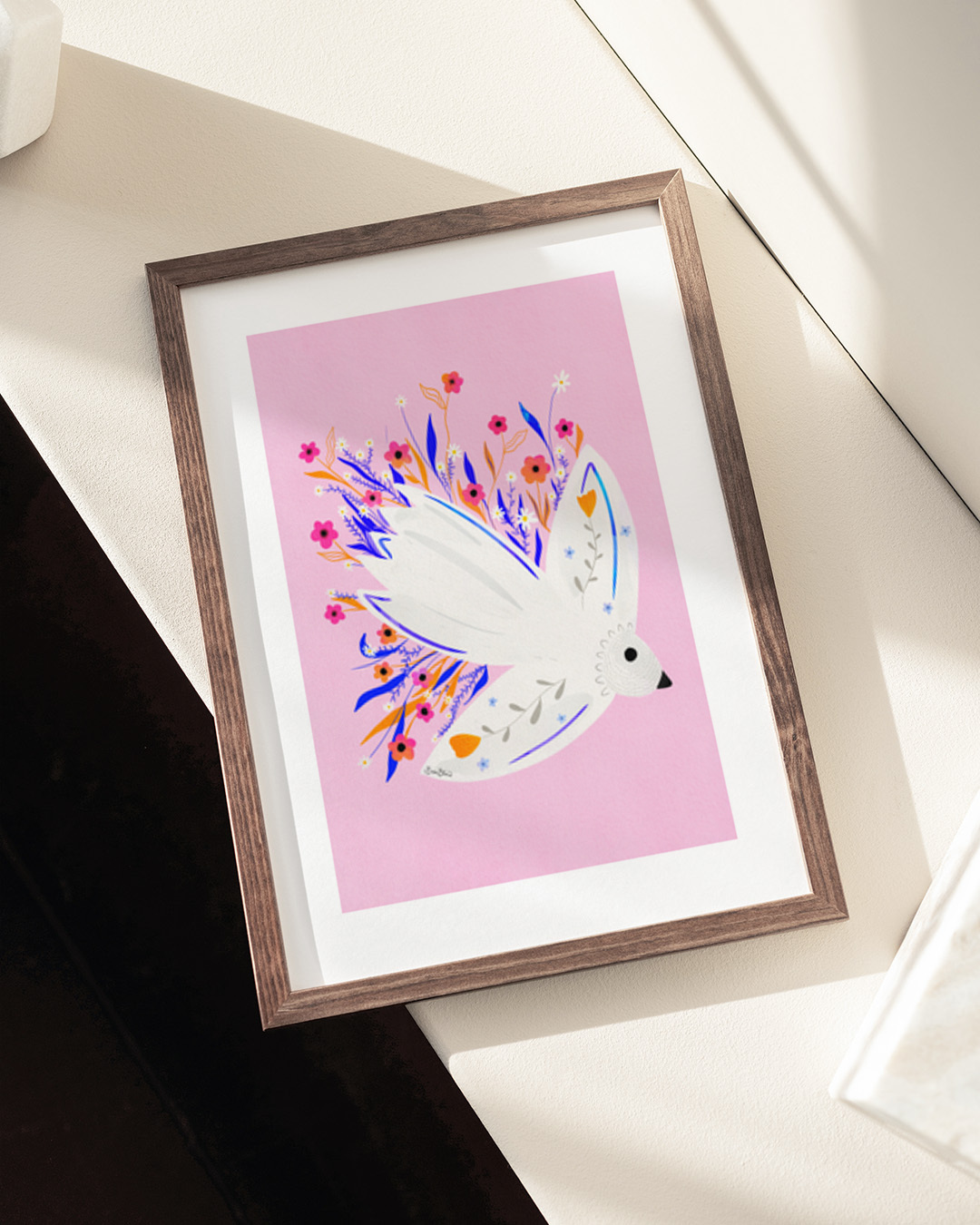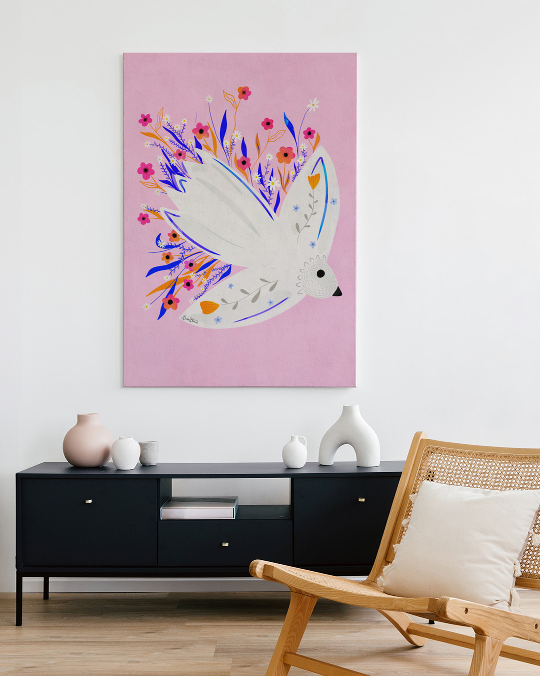 De charmante illustratie van Baroo Bloom toont een witte vogel die zweeft tussen levendige bloemen op een zachte roze achtergrond. Perfect voor kleur en speelsheid in elke ruimte.