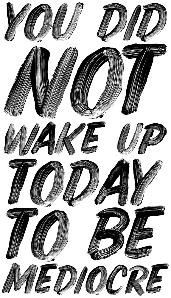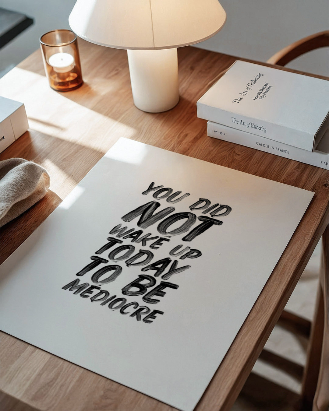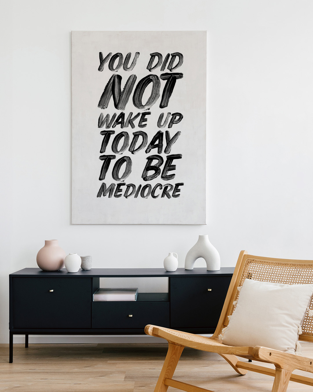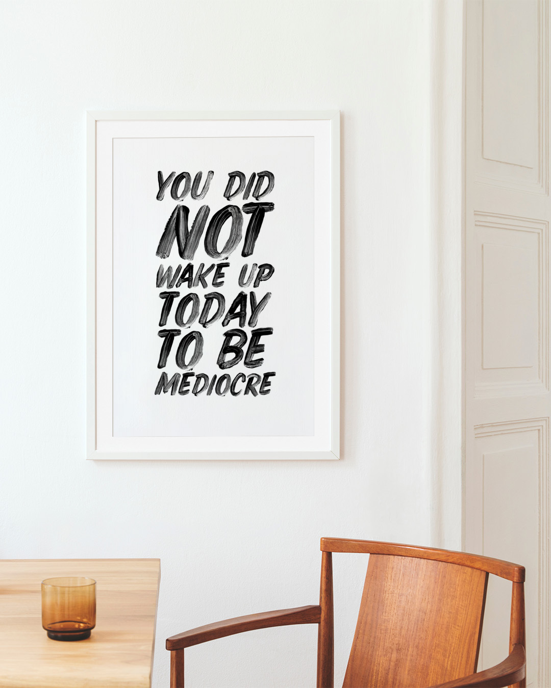 Begin de dag met Brett Wilsons motiverende kunstwerk dat je aanspoort om middelmatigheid te overstijgen. Een monochrome tekstafdruk met krachtige streken, het dient als dagelijkse herinnering om boven gemiddelde levens te stijgen.