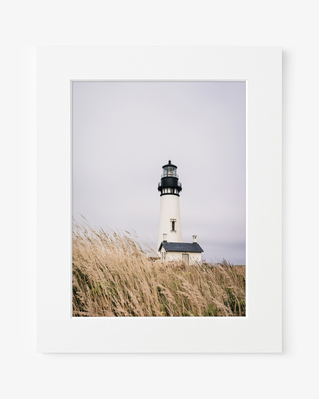 Vang de serene schoonheid van Kathrin Pienaars vuurtoren te midden van hoog gras. De neutrale tonen en minimalistische stijl roepen een gevoel van rust en maritiem erfgoed op in dit kustlandschap.