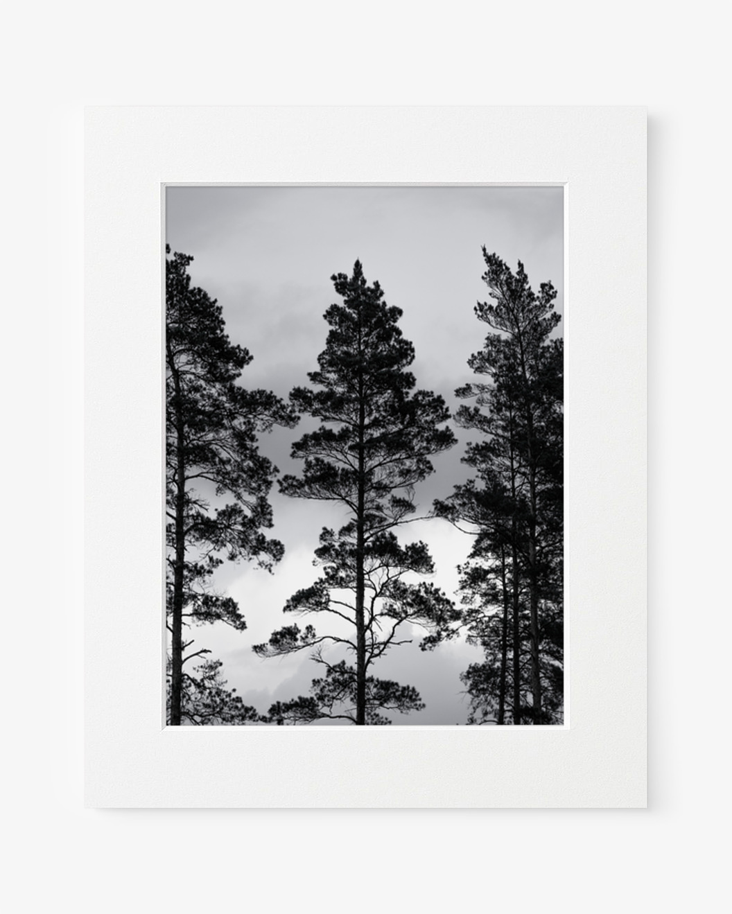 Ontdek de serene schoonheid in Mareike Böhmers weergave van hoge bomen die dramatisch gesilhouetteerd zijn tegen een bewolkte lucht in deze verbluffende zwart-witfoto.