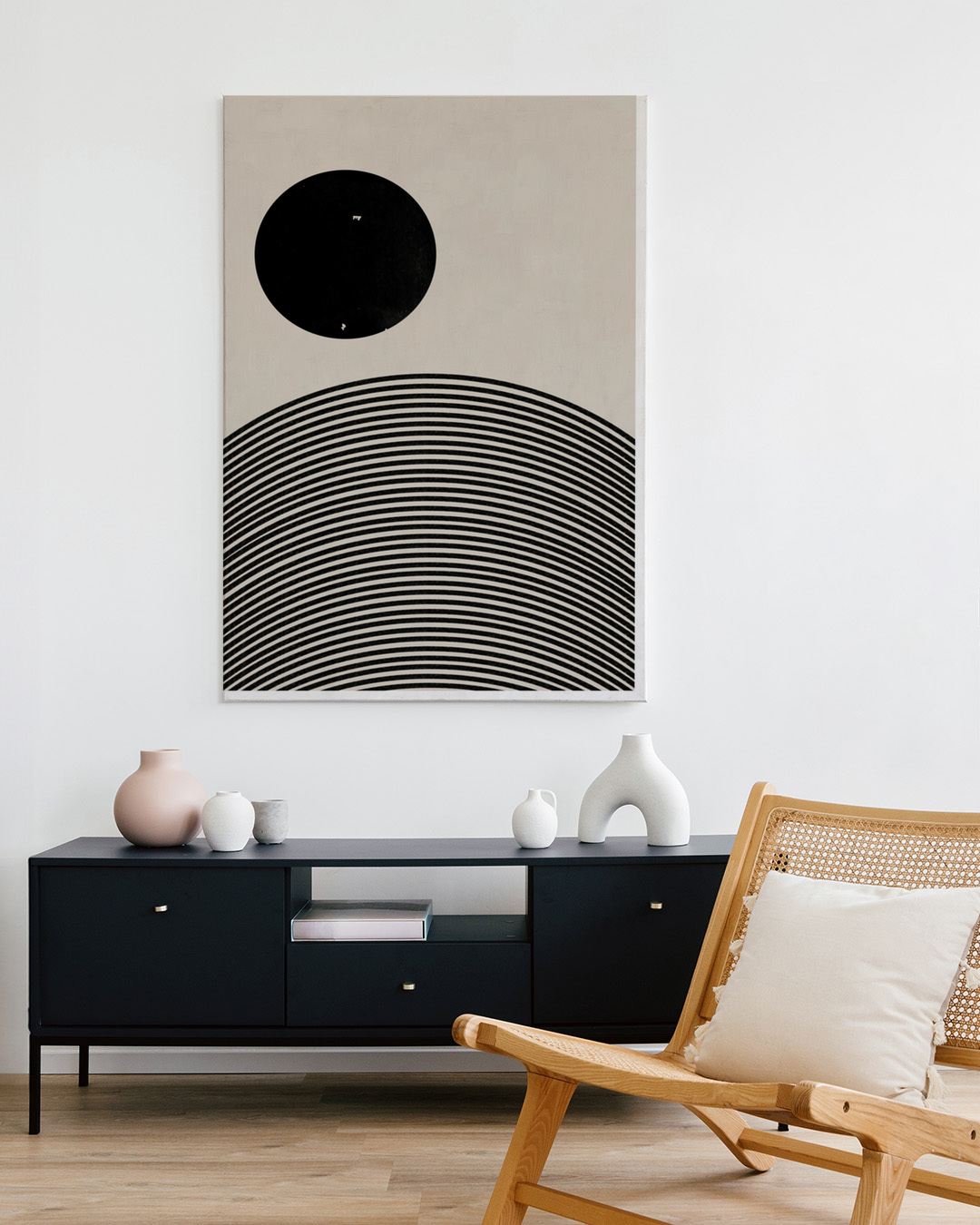 The stretched canvas is fitted with a sleek float frame in genuine wood for an elegant finish and extra dimension. The space between the canvas and the frame creates a floating effect.