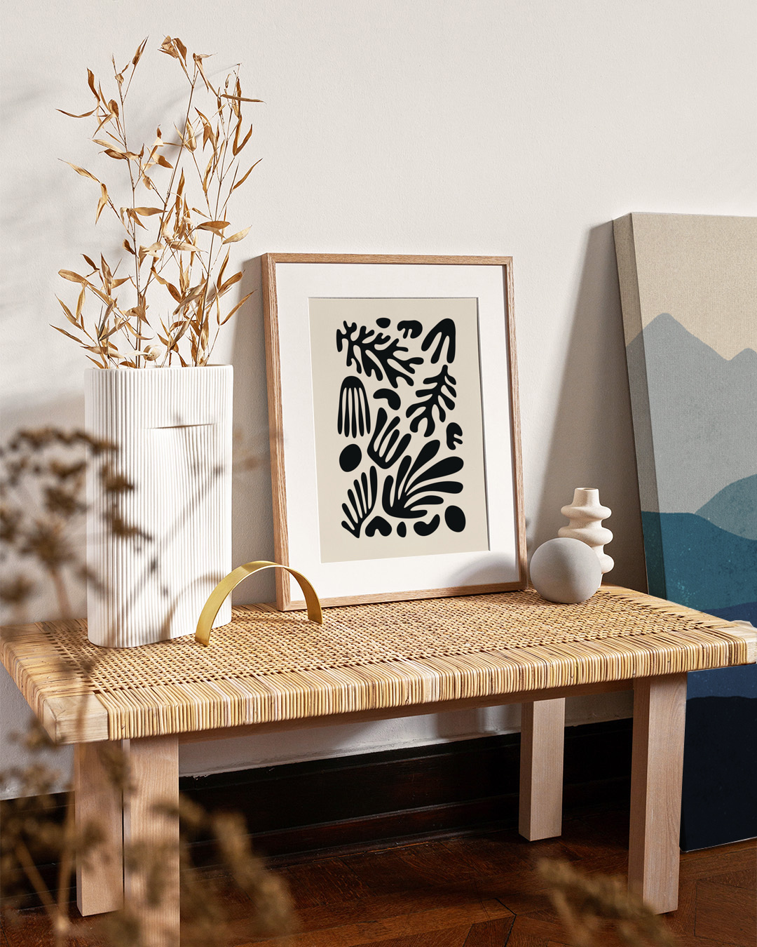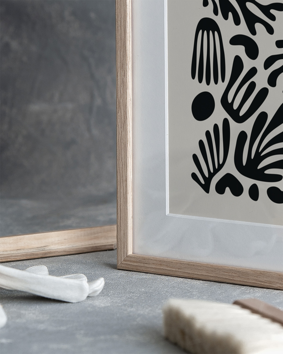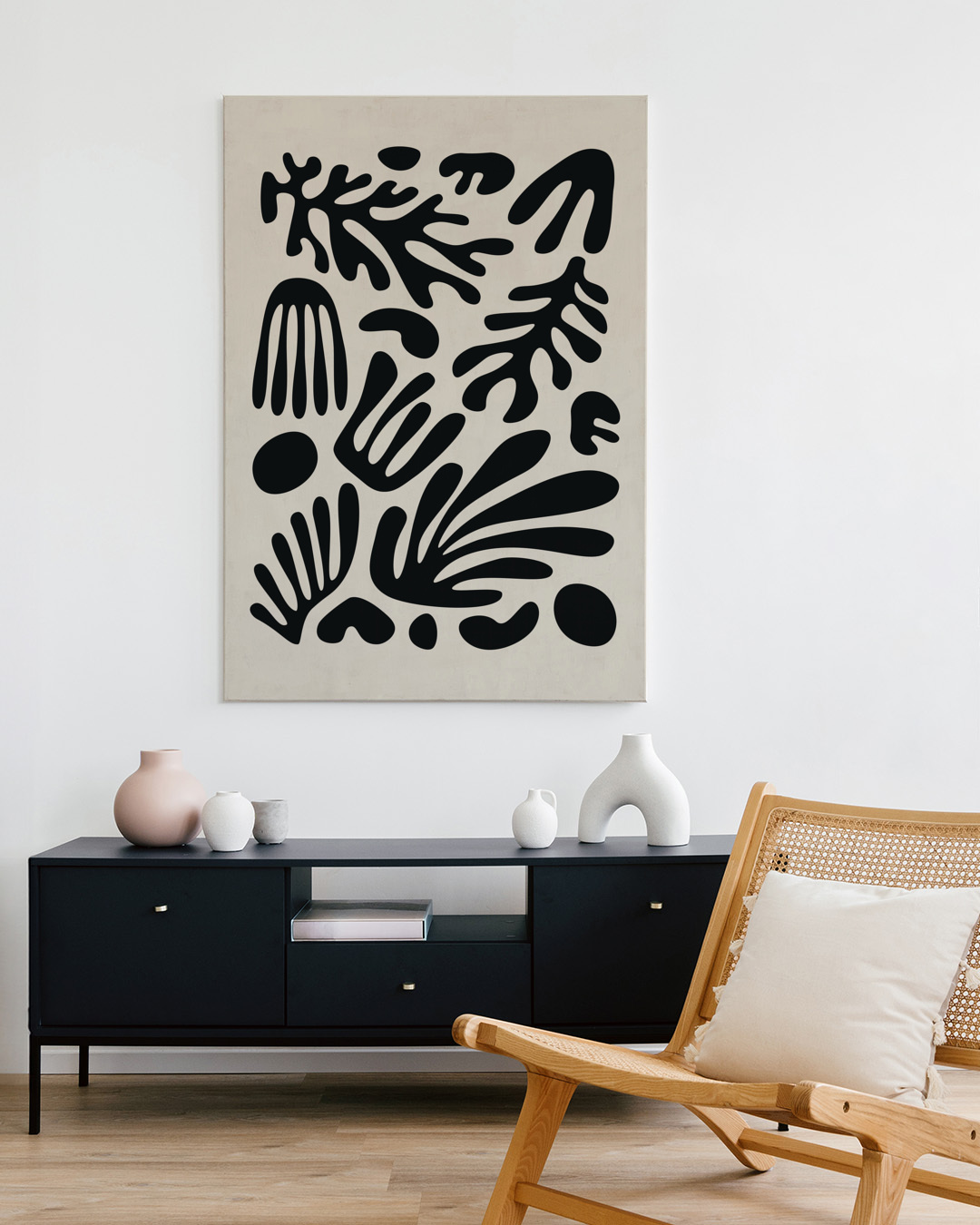 A mesmerizing art print inspired by Henri Matisse, featuring a collection of striking black organic cutouts against a soft beige background. The interplay between form and space captures the essence of fluid, dynamic movement, making it an inspiring focal piece.