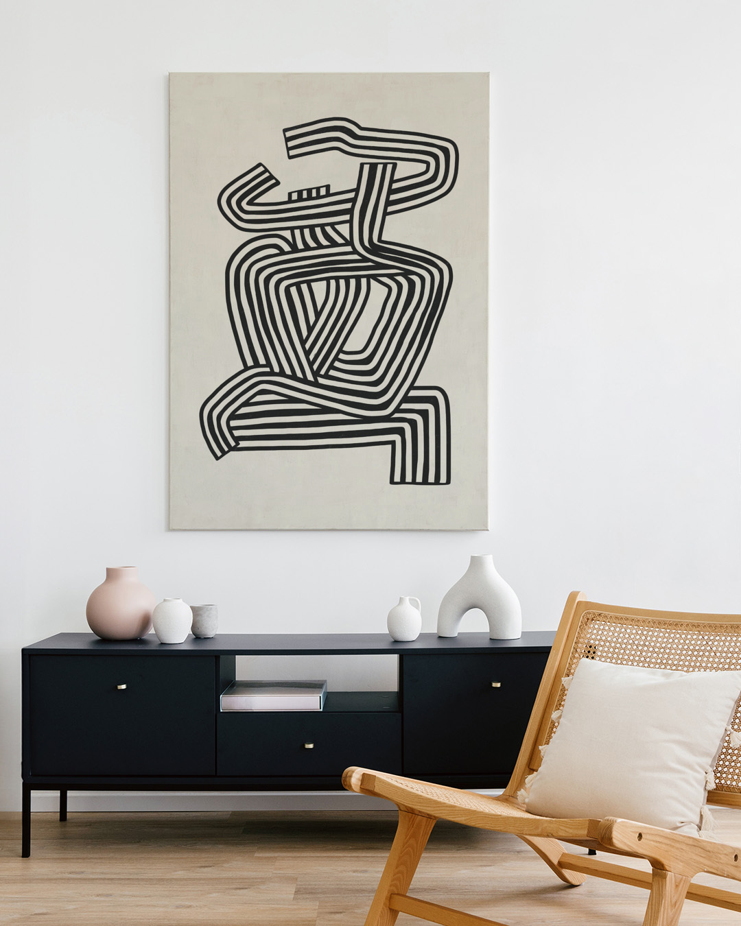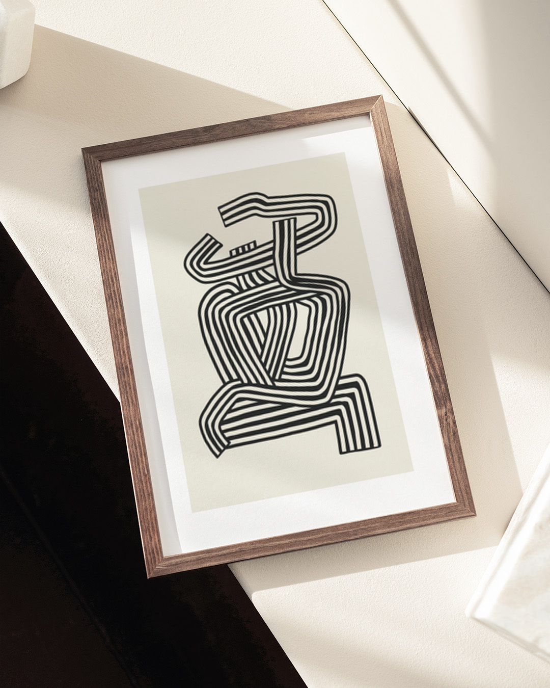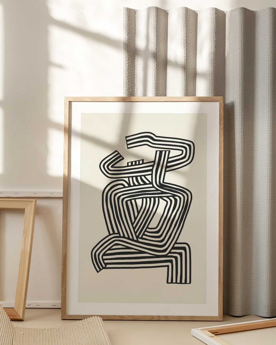 A strikingly intricate line art piece featuring black intertwined stripes on a beige background, creating an abstract portrayal that invites personal interpretation.