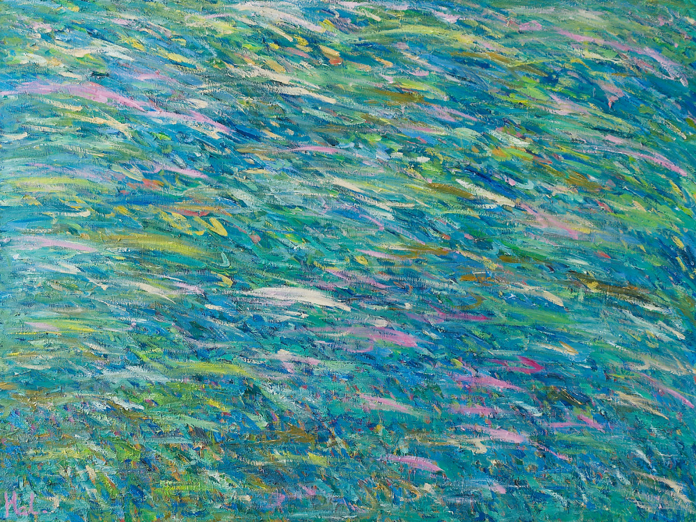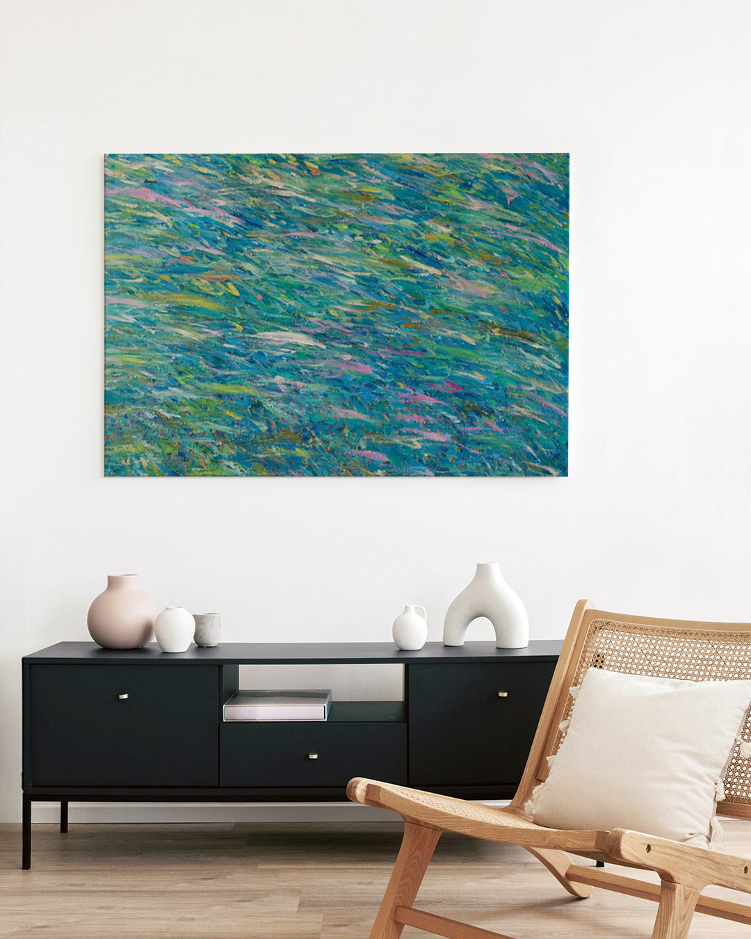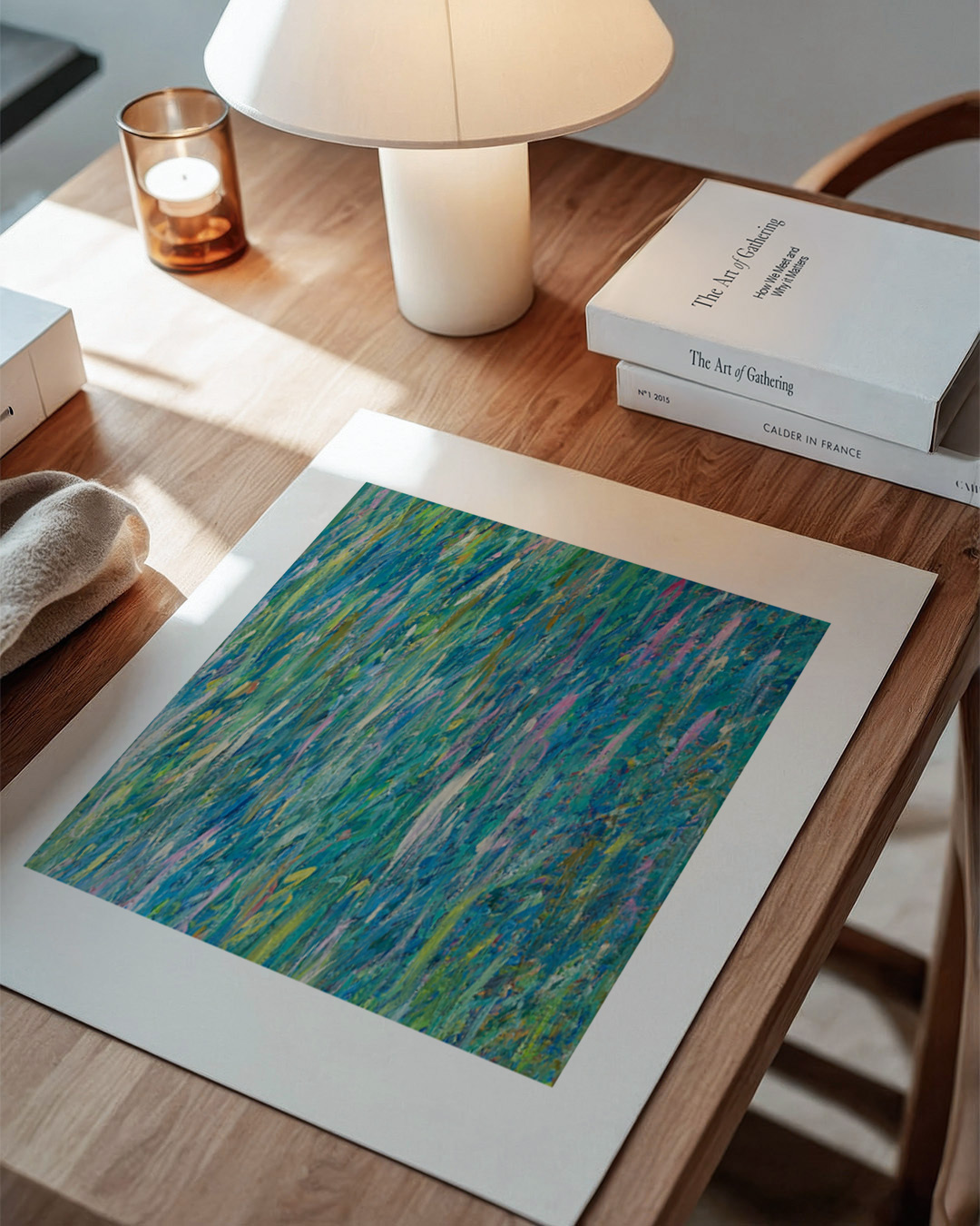 A soothing abstract artwork depicting harmonious waves in shades of blue and green, creating a calming and serene atmosphere. Perfect for adding a touch of tranquility to your space.