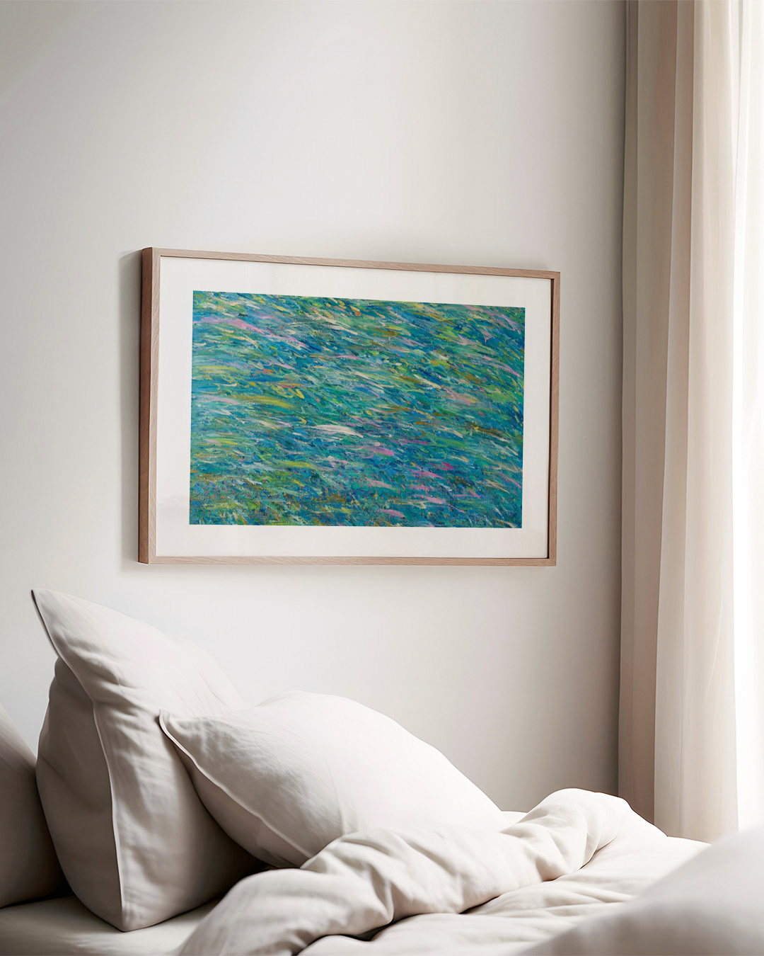The stretched canvas is fitted with a sleek float frame in genuine wood for an elegant finish and extra dimension. The space between the canvas and the frame creates a floating effect.
