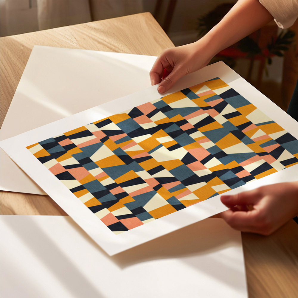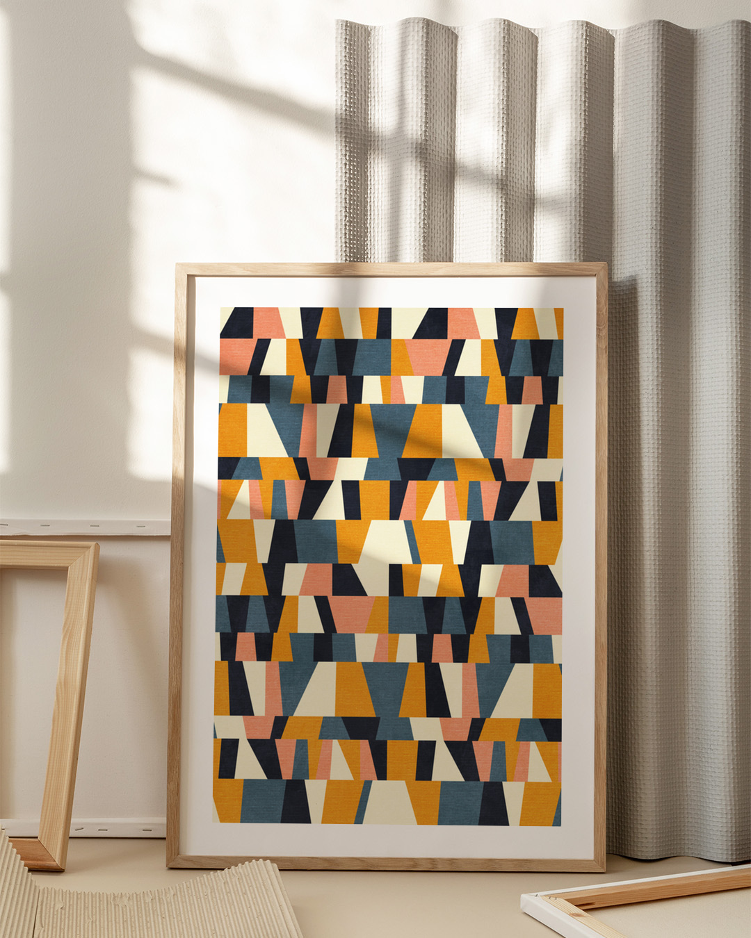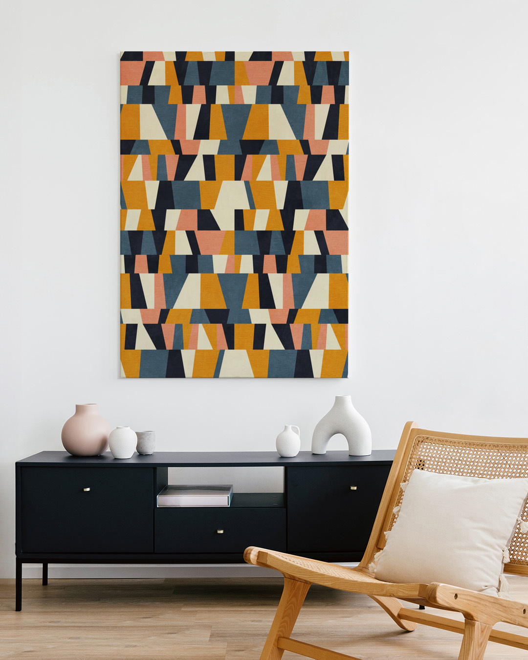 Ana Rut Bre's abstract design features a captivating geometric pattern in blue and pink, creating a dynamic mosaic of shapes for any modern space.