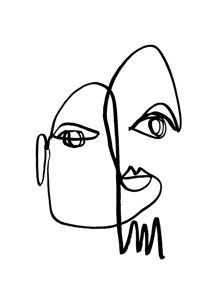 A striking black line drawing depicting intertwined faces, showcasing an abstract representation of human expressions on a white background.