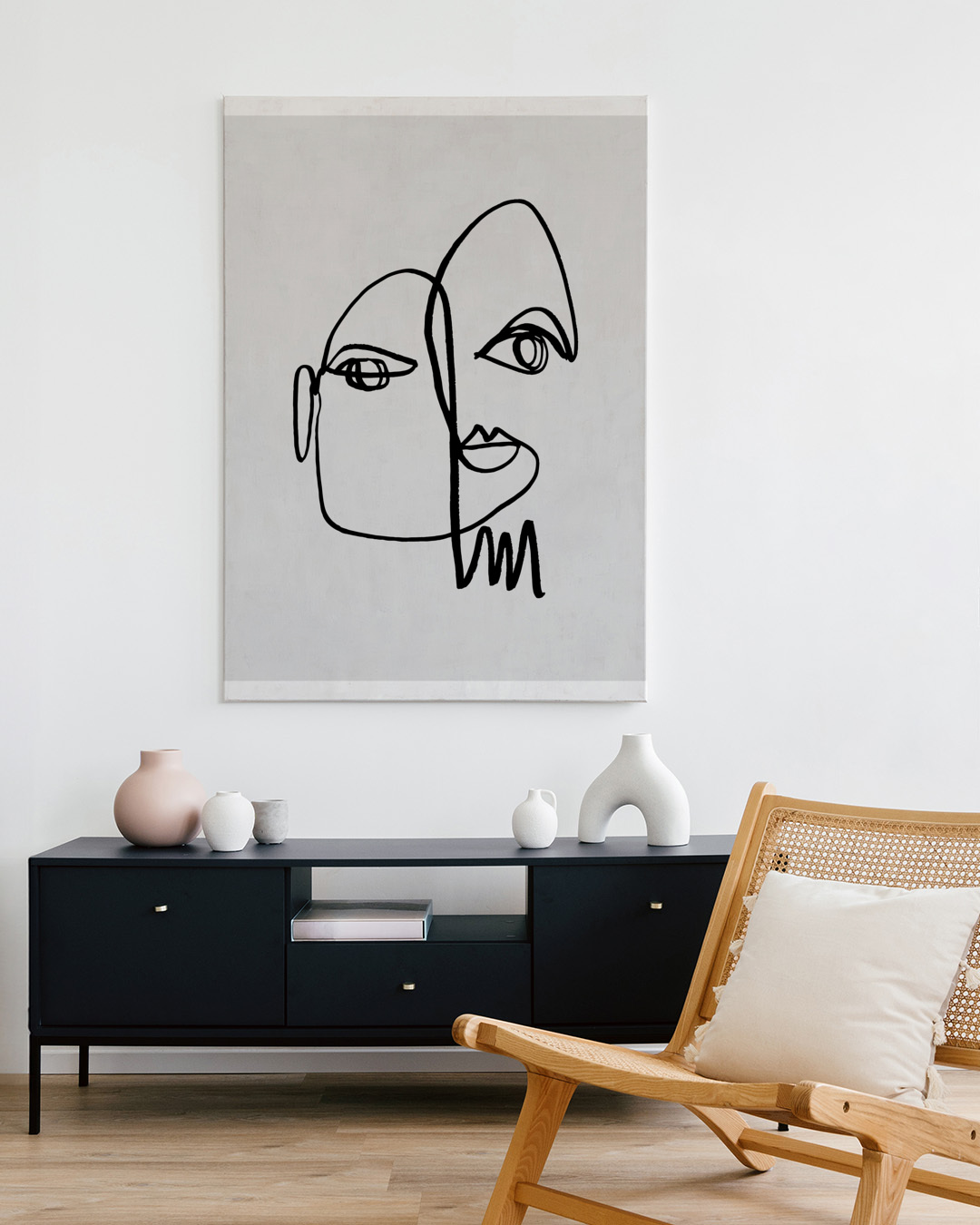 The stretched canvas is fitted with a sleek float frame in genuine wood for an elegant finish and extra dimension. The space between the canvas and the frame creates a floating effect.