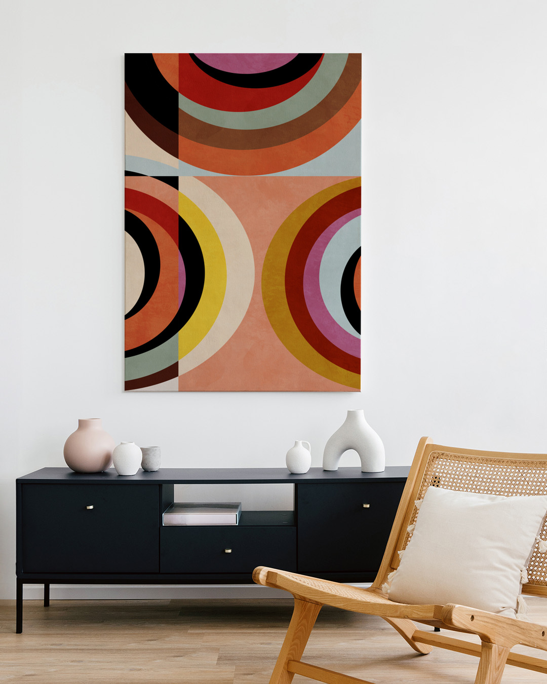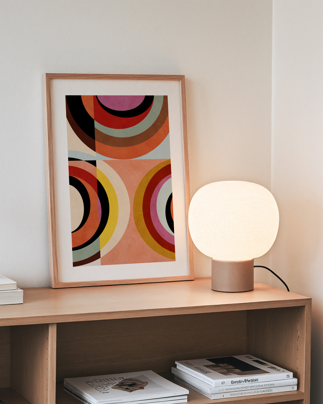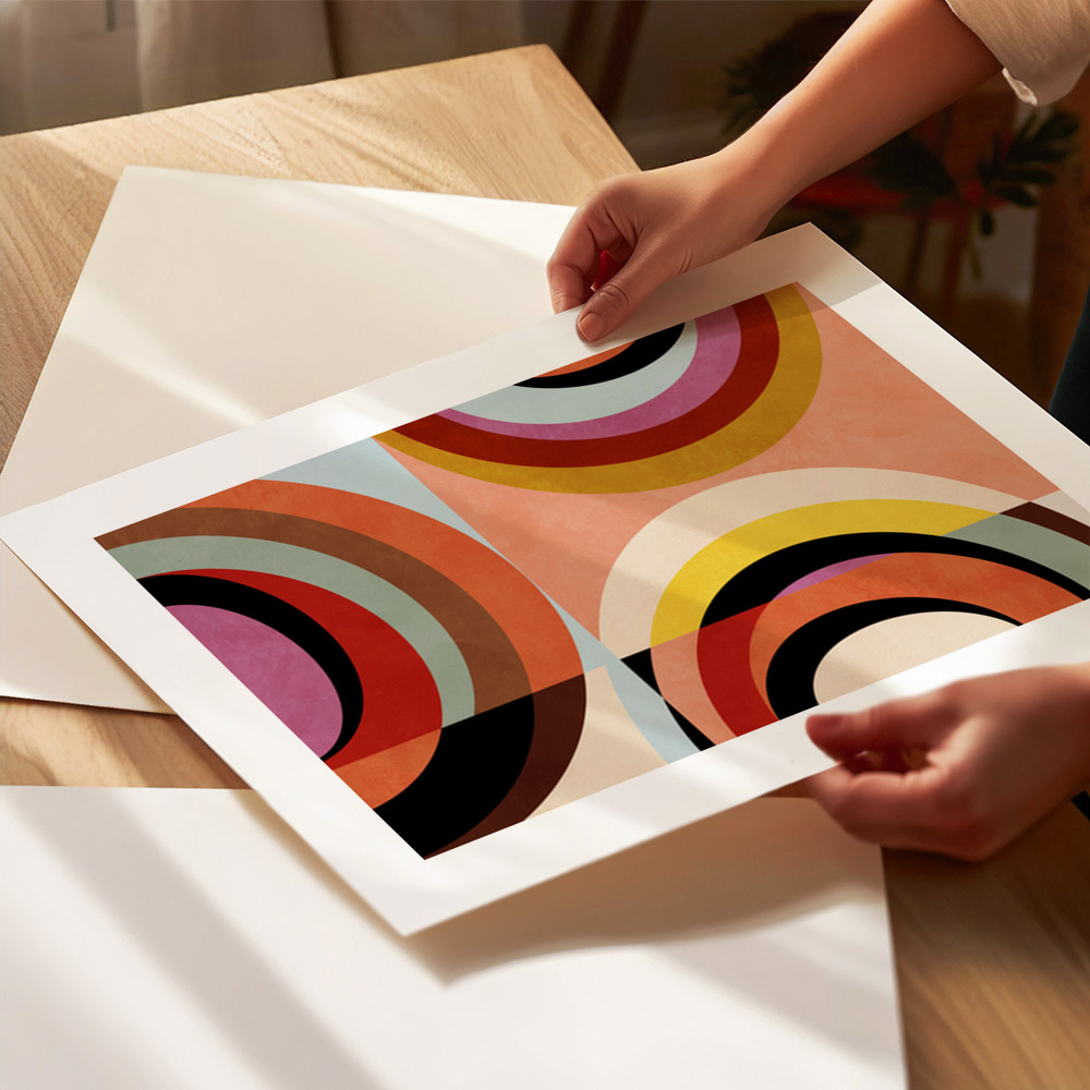 A captivating geometric art print inspired by Bauhaus design principles, featuring interlocking colourful circles. Ana Rut Bre skillfully employs warm reds, yellows, and hints of lilac to create a harmonious composition that's both striking and elegant.