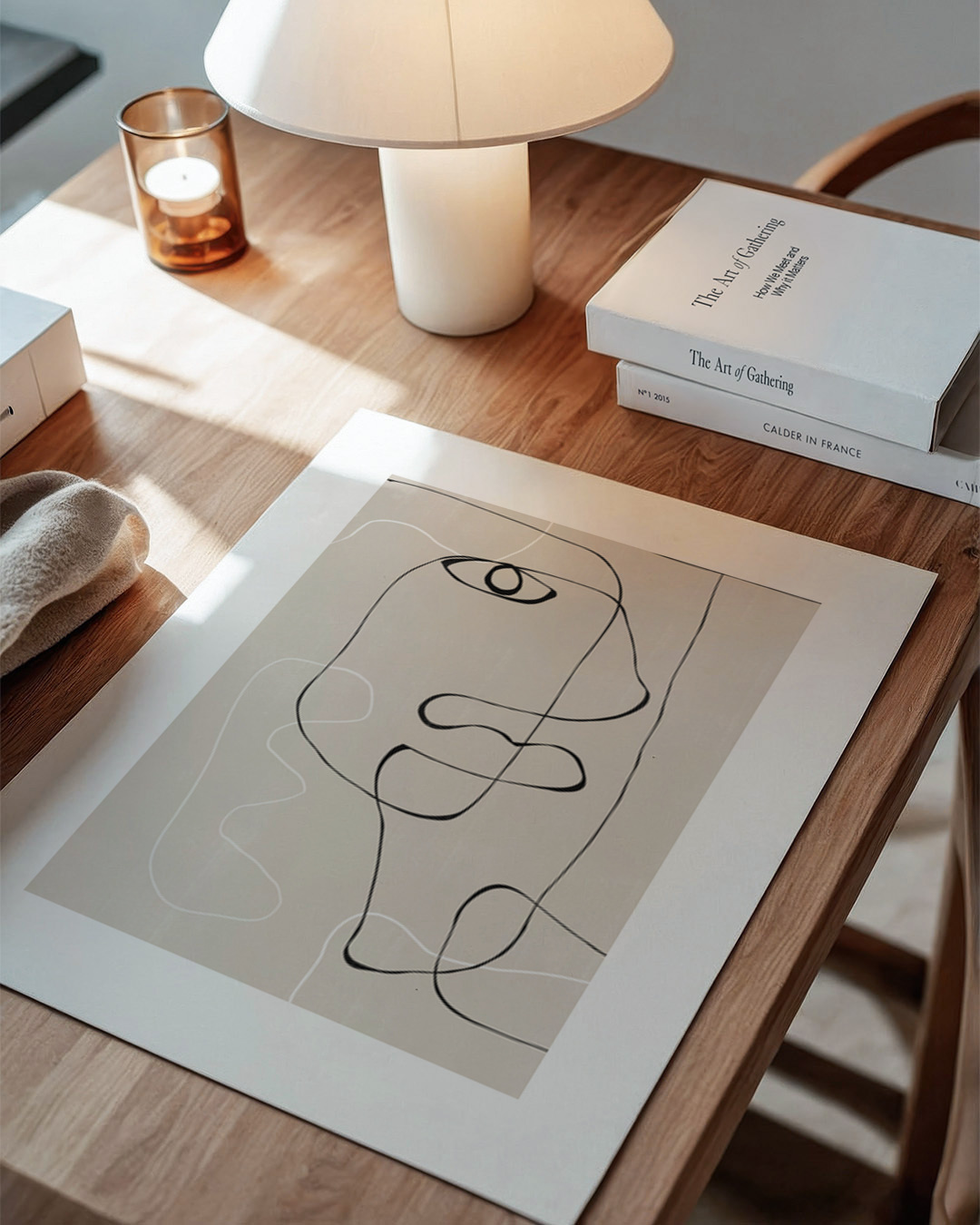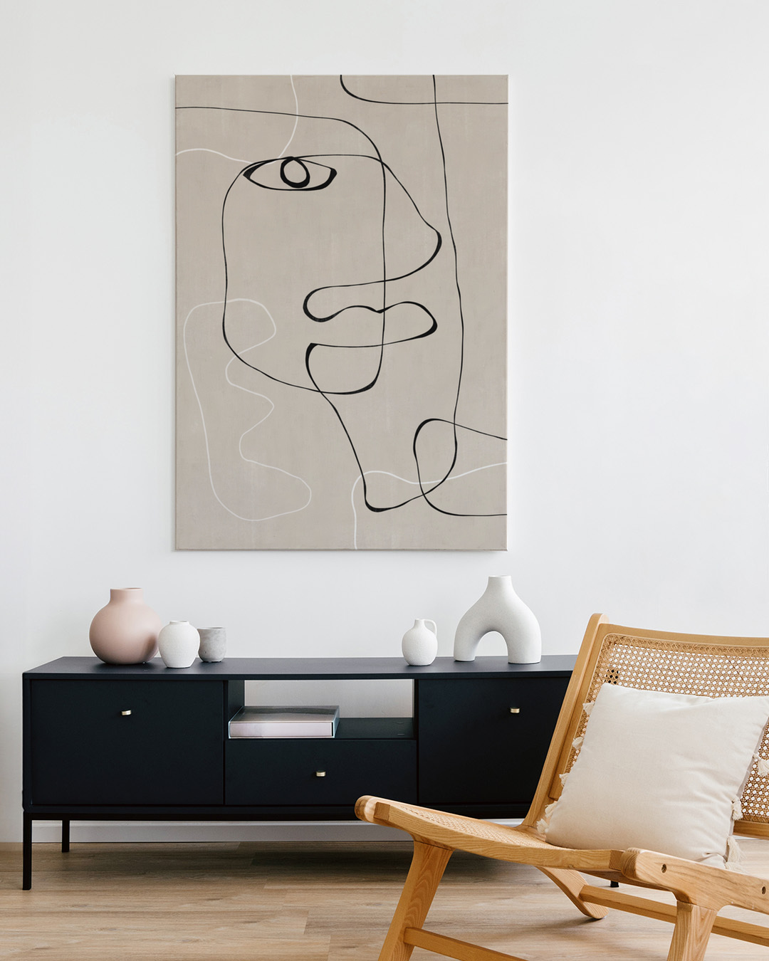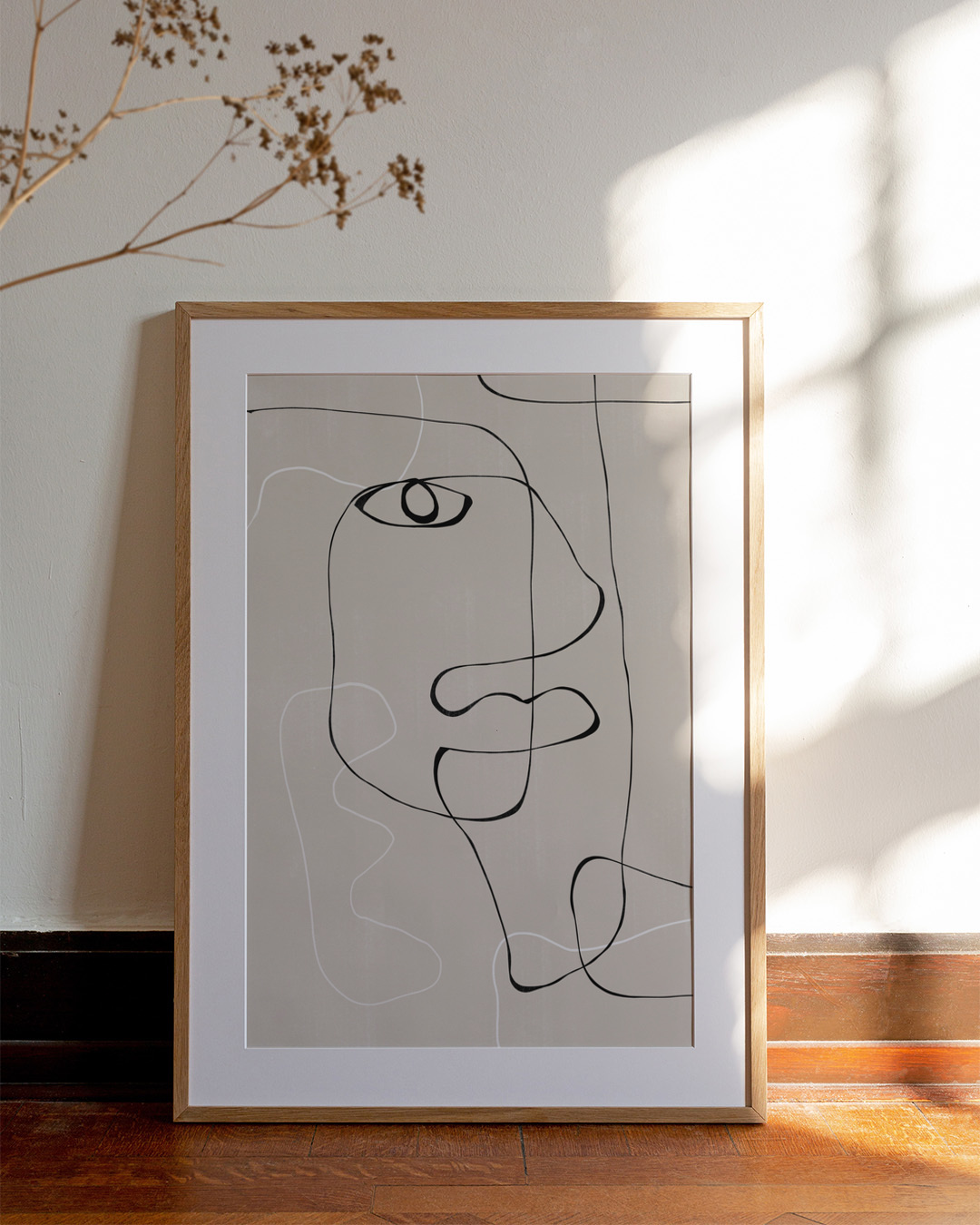 This minimalist line drawing by Miuus Studio features a black line forming an abstract face on a soft beige background. The simplicity and elegance of the design make it an eye-catching addition to modern interiors.