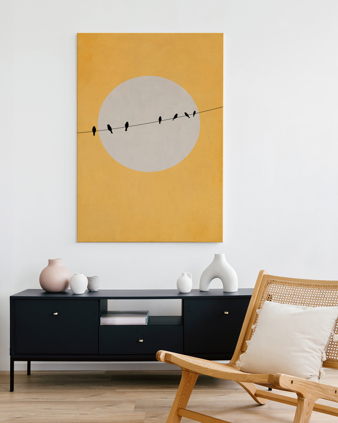 The stretched canvas is fitted with a sleek float frame in genuine wood for an elegant finish and extra dimension. The space between the canvas and the frame creates a floating effect.