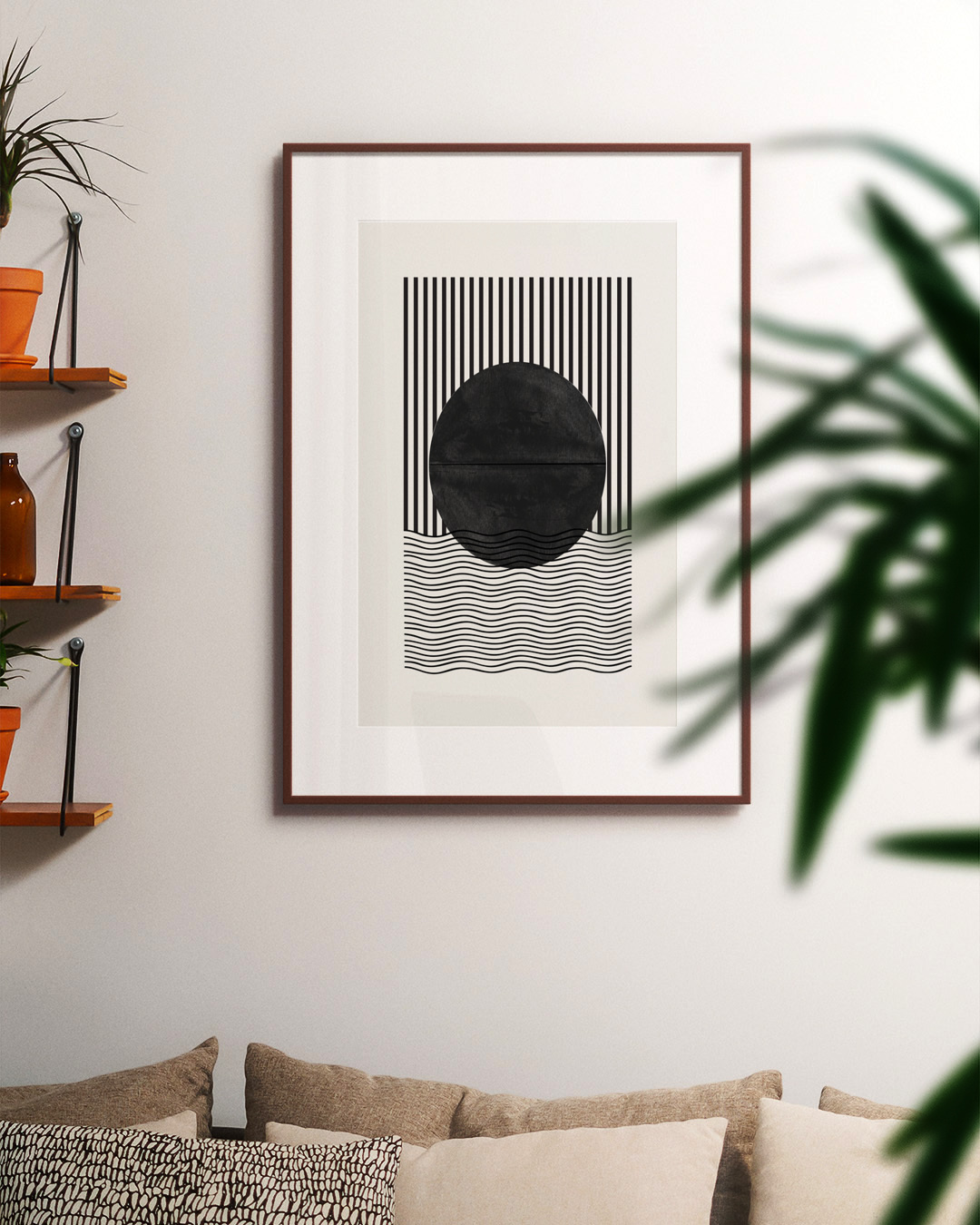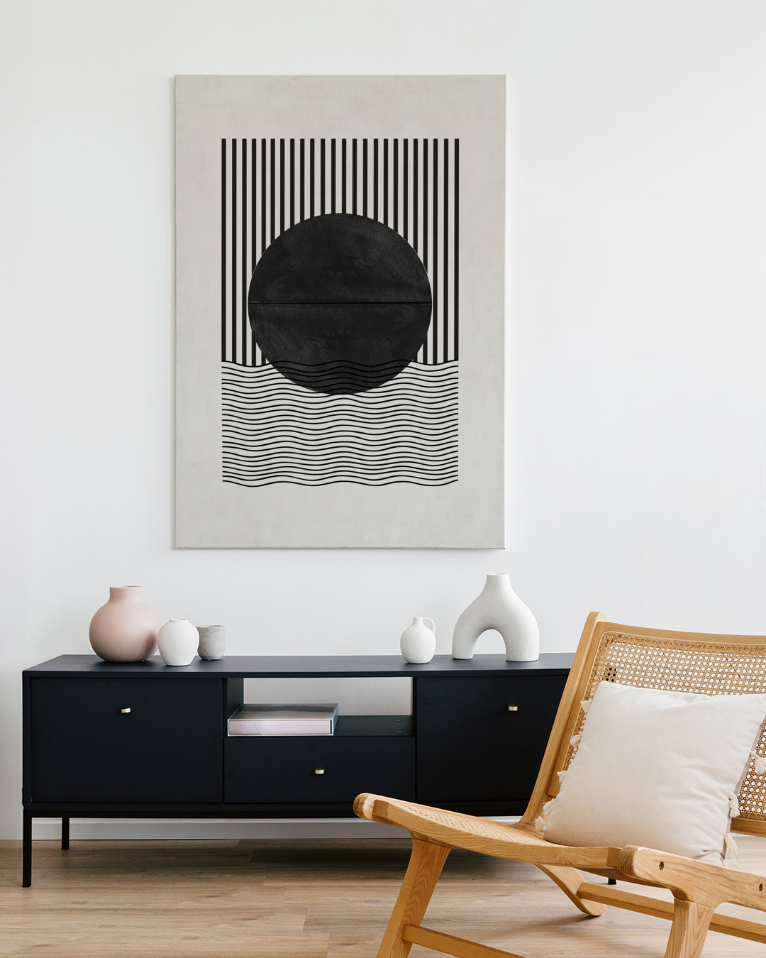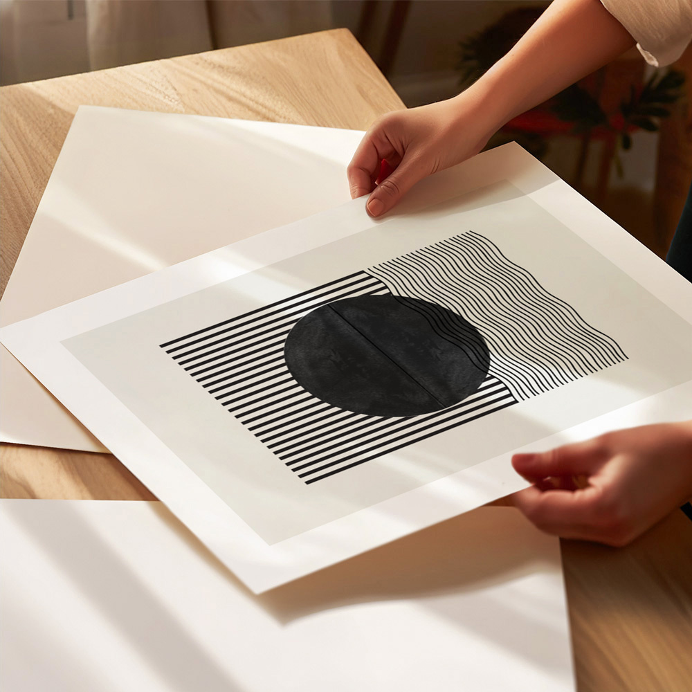 Miuus Studio presents an abstract art print distinguished by its elegant black and white geometric pattern. The linear elements and striking contrast make it ideal for modern interiors, harmonizing sophistication and simplicity.