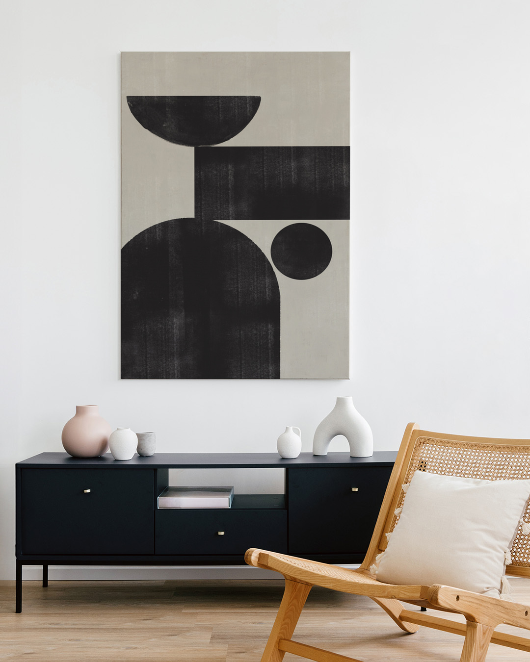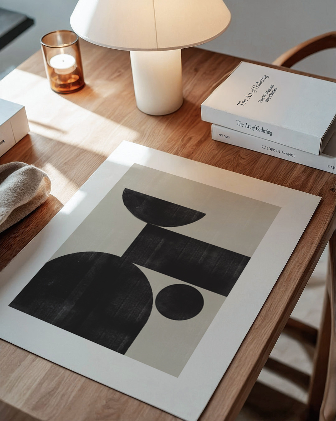 A minimalist piece by Miuus Studio featuring bold black geometric forms on a subtle light background, perfect for modern spaces. This piece emphasizes balance and simplicity with its striking contrasts.