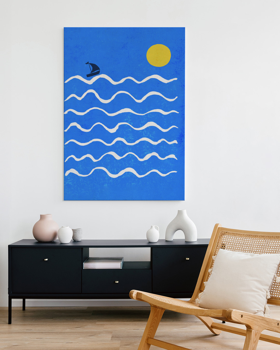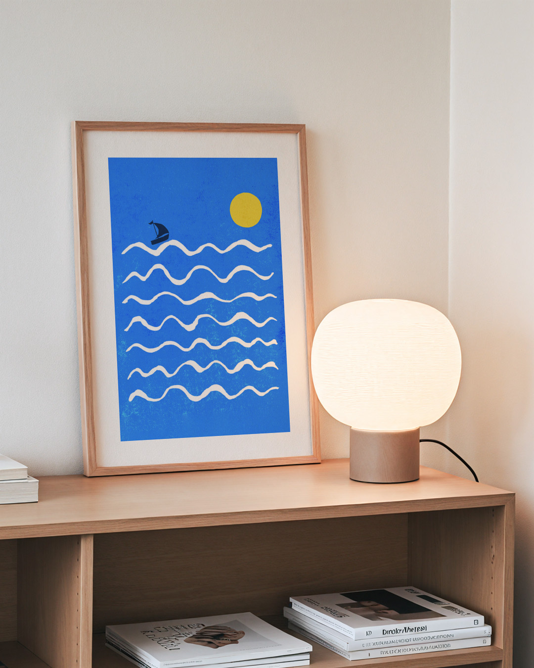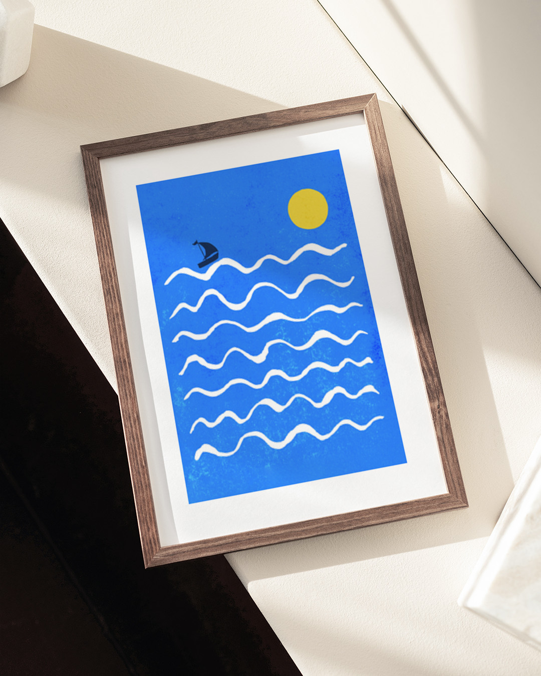 A delightful art print featuring a small sailboat navigating a vibrant blue sea under a bright yellow sun. The graphic lines of the waves convey a sense of serene oceanic adventure, capturing the essence of nautical journeys.