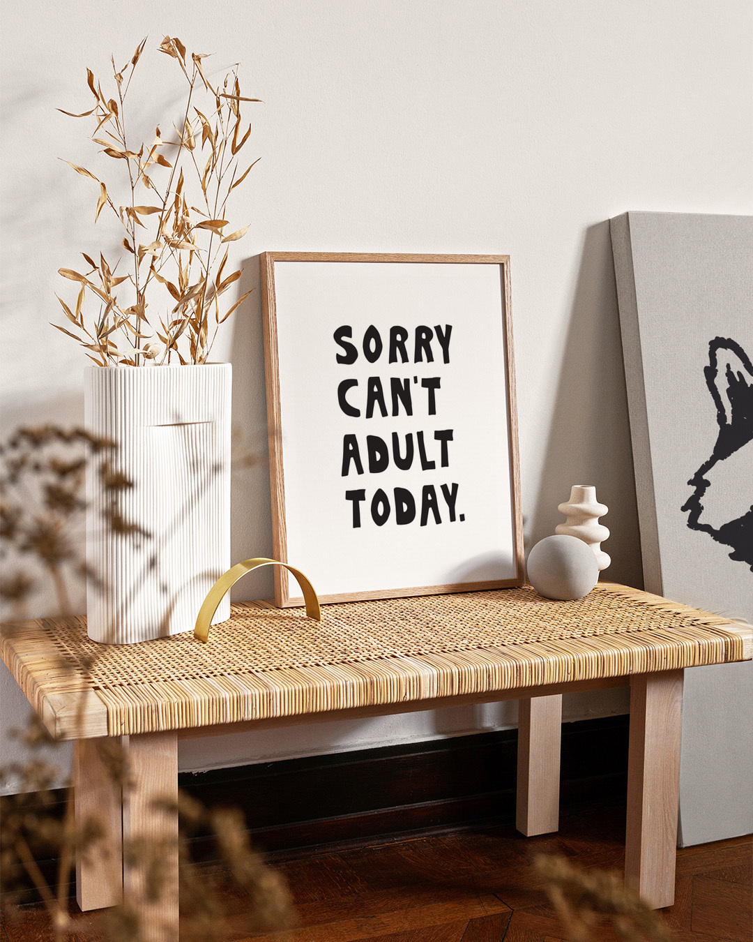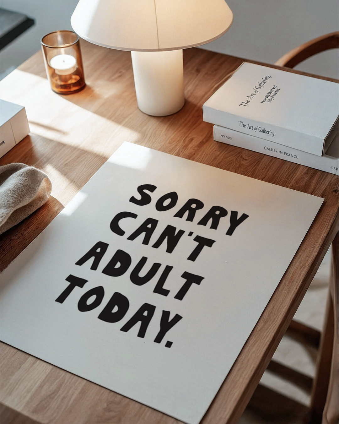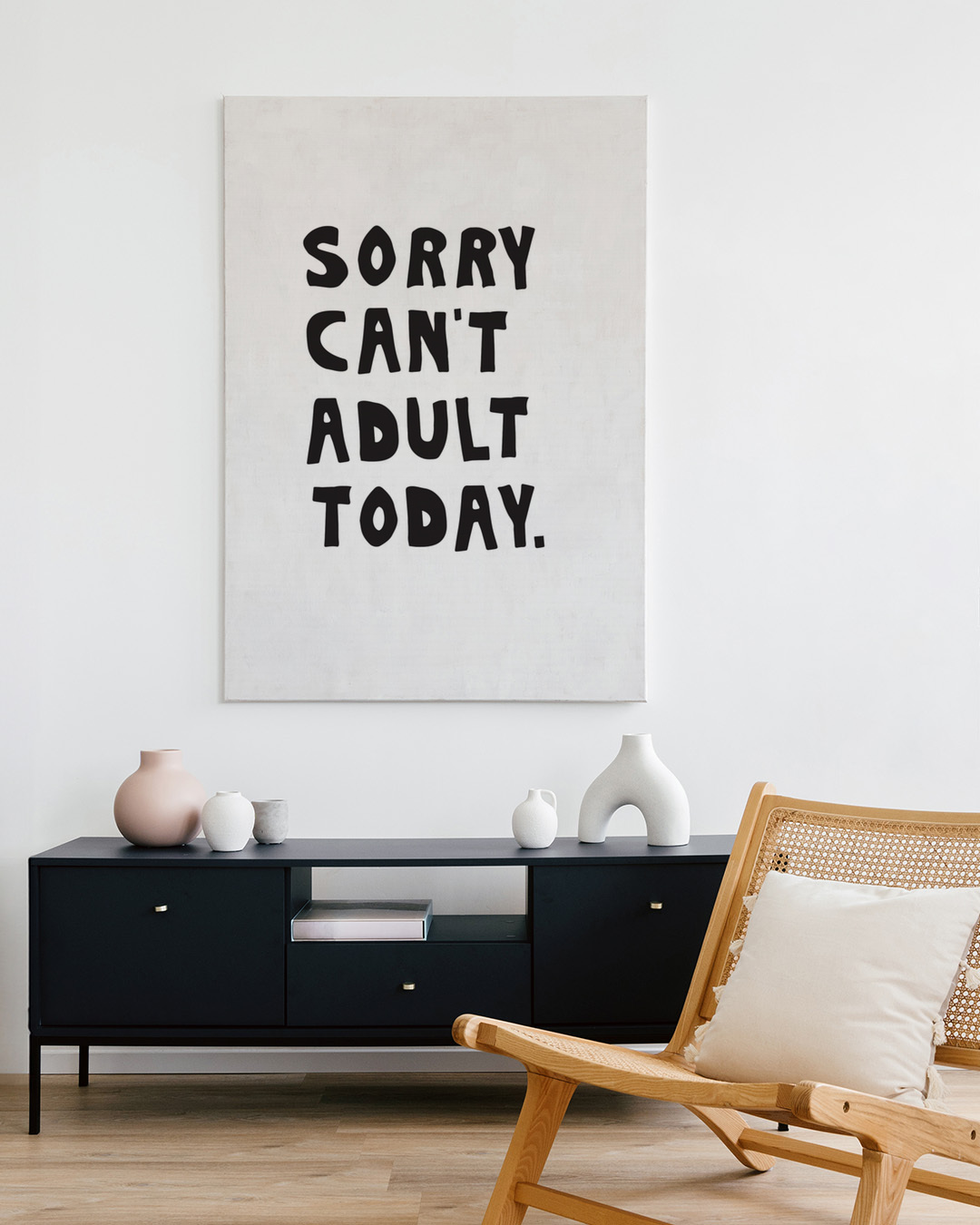Embrace the humorous side of life with this playful textual print featuring 'Sorry can't adult today'. A perfect touch of humour for your space with bold black typography on a contrasting background.