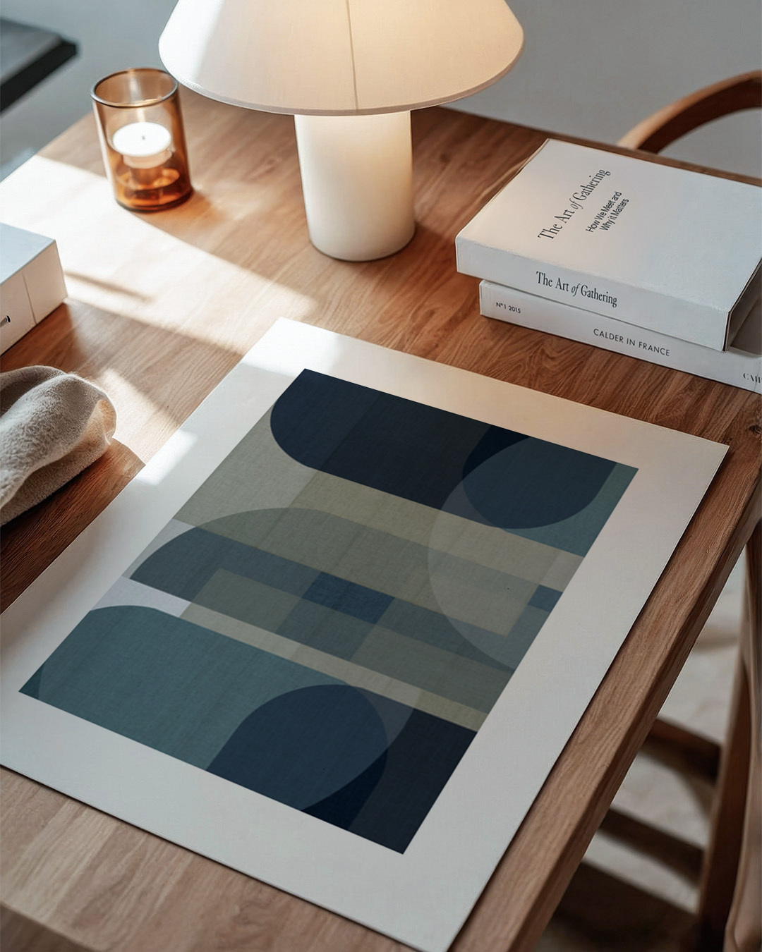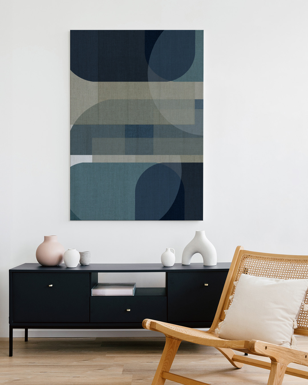 A mesmerizing blend of woven textures in varying shades of blue and gray, creating a serene geometric composition perfect for modern spaces.
