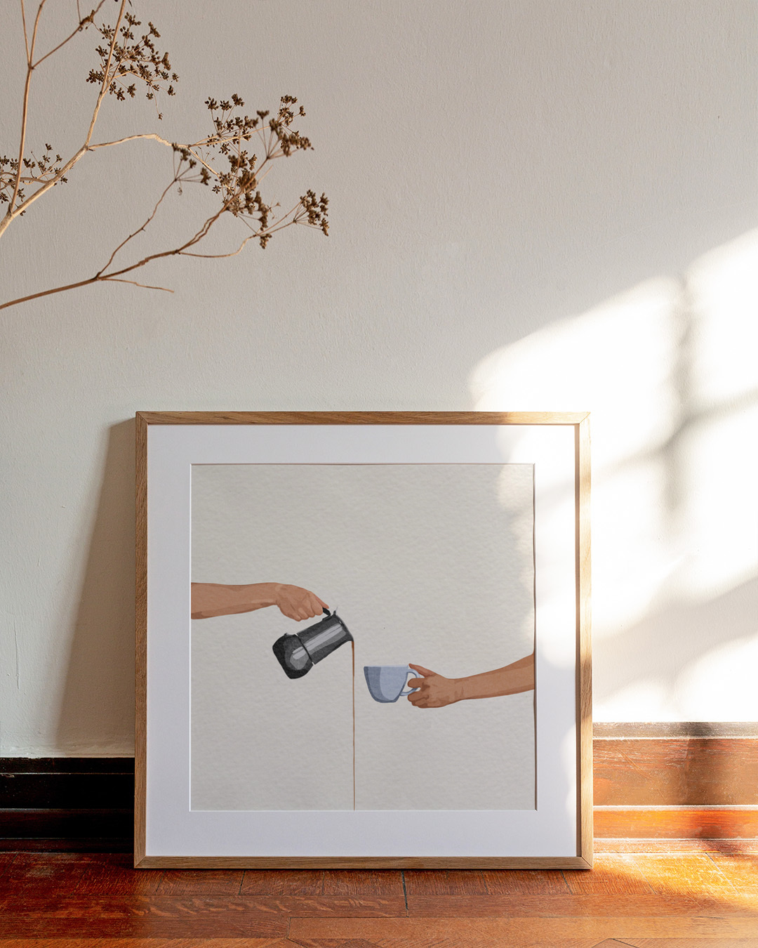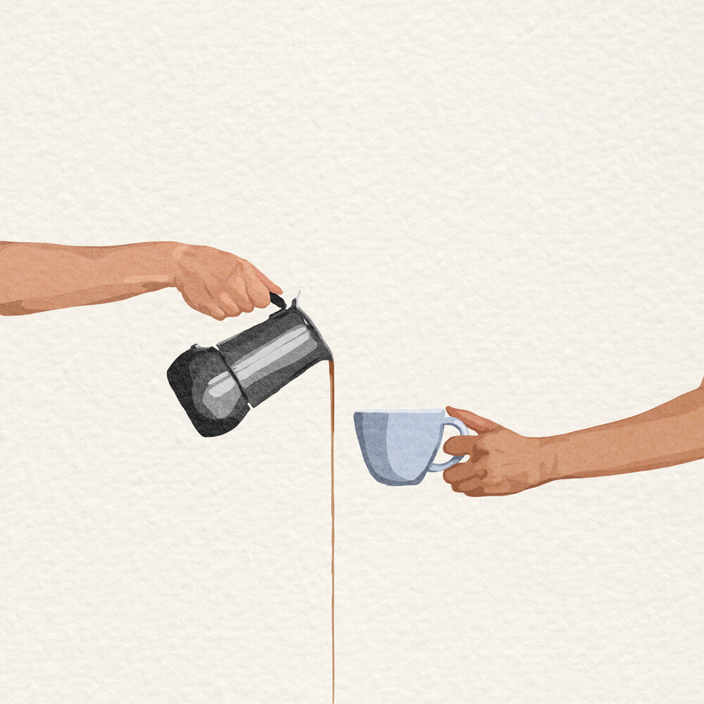 Giselle Dekel's humorous illustration showcases a playful scene where coffee is intentionally poured beside the cup. It's a whimsical depiction that adds a fun twist to the everyday act of pouring coffee.