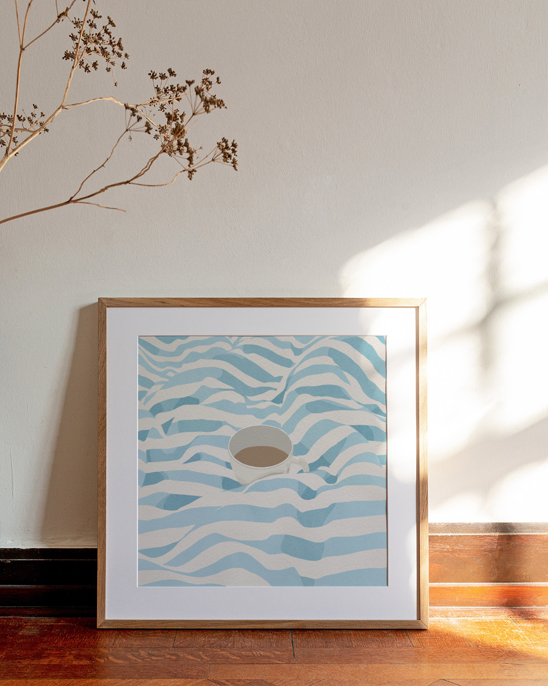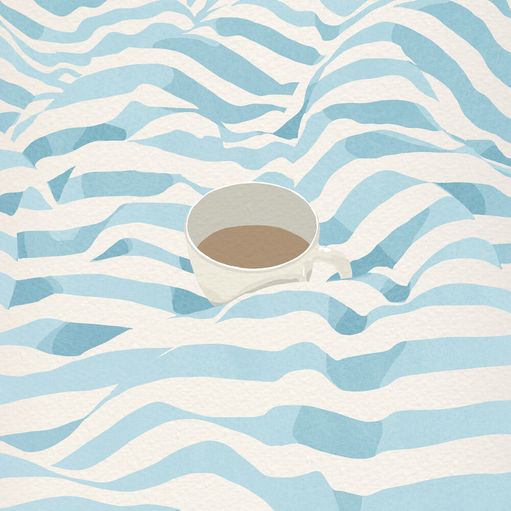 A cozy illustration by Giselle Dekel featuring a cup of coffee nestled within soft, blue-striped bedding. The artwork evokes warmth and relaxation, making it perfect for any comfort-loving coffee enthusiast.
