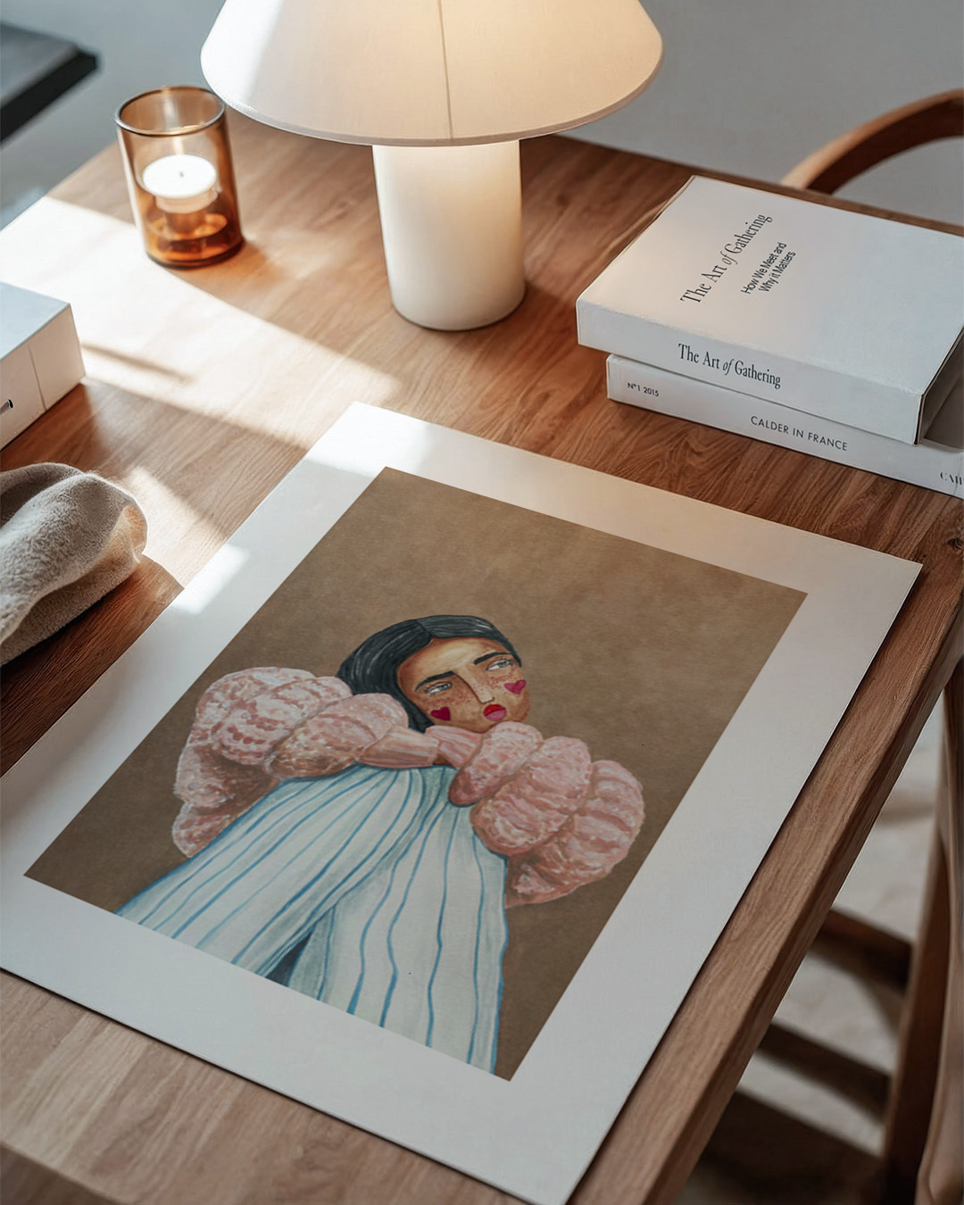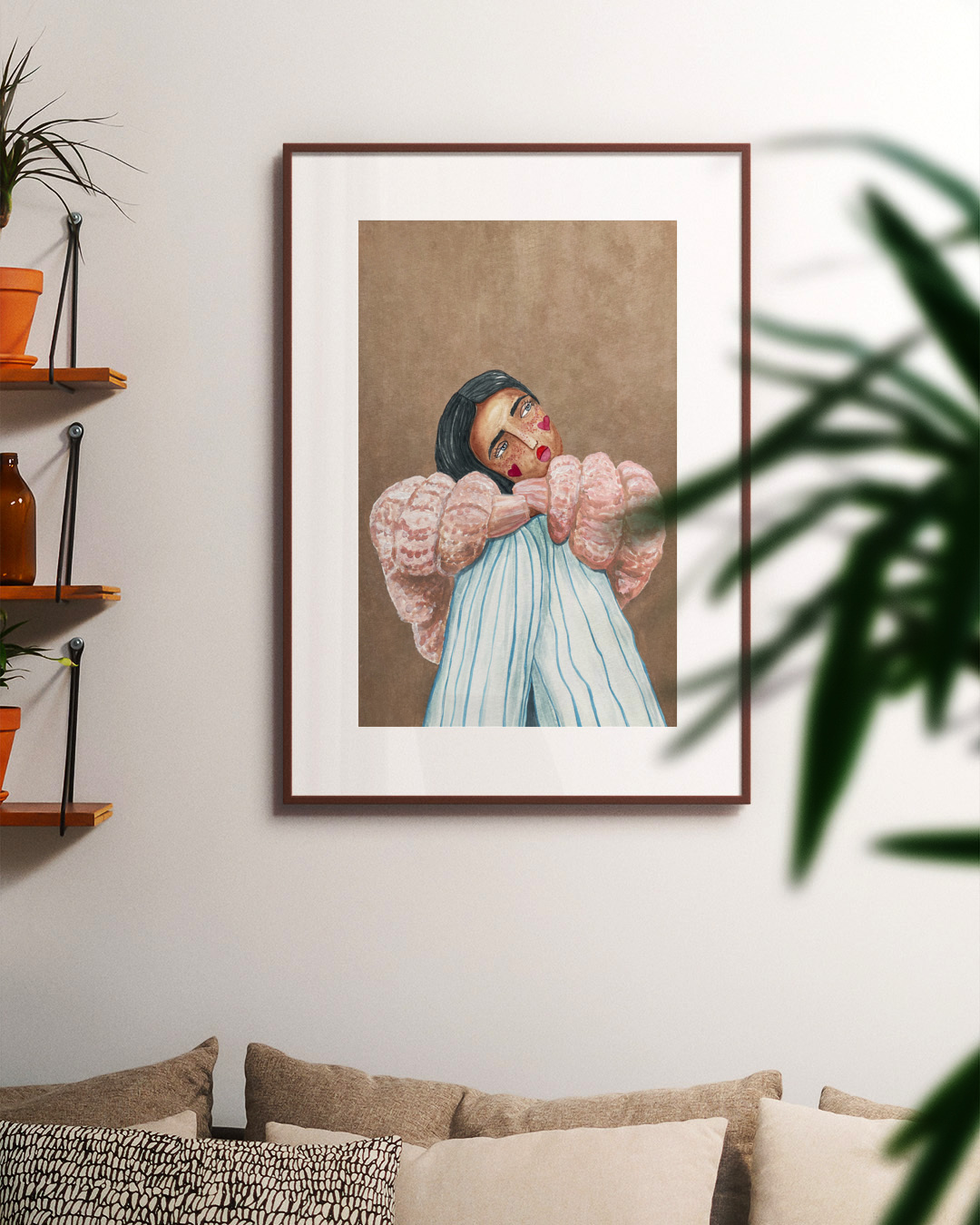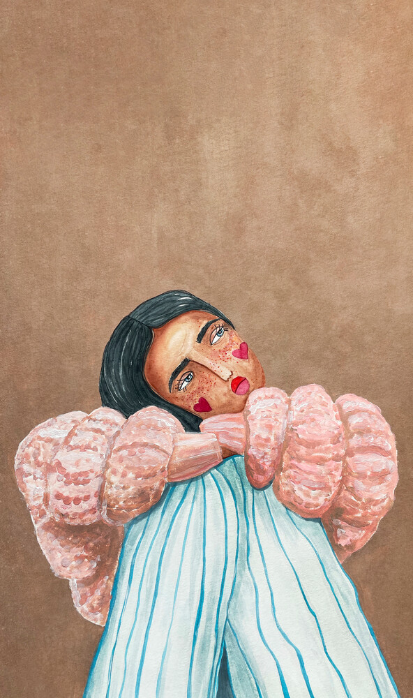 A captivating illustration by Raissa Oltmanns depicting a dreamy girl resting her head with heart motifs and a serene expression. The warm brown and pink hue enhances its whimsical charm.