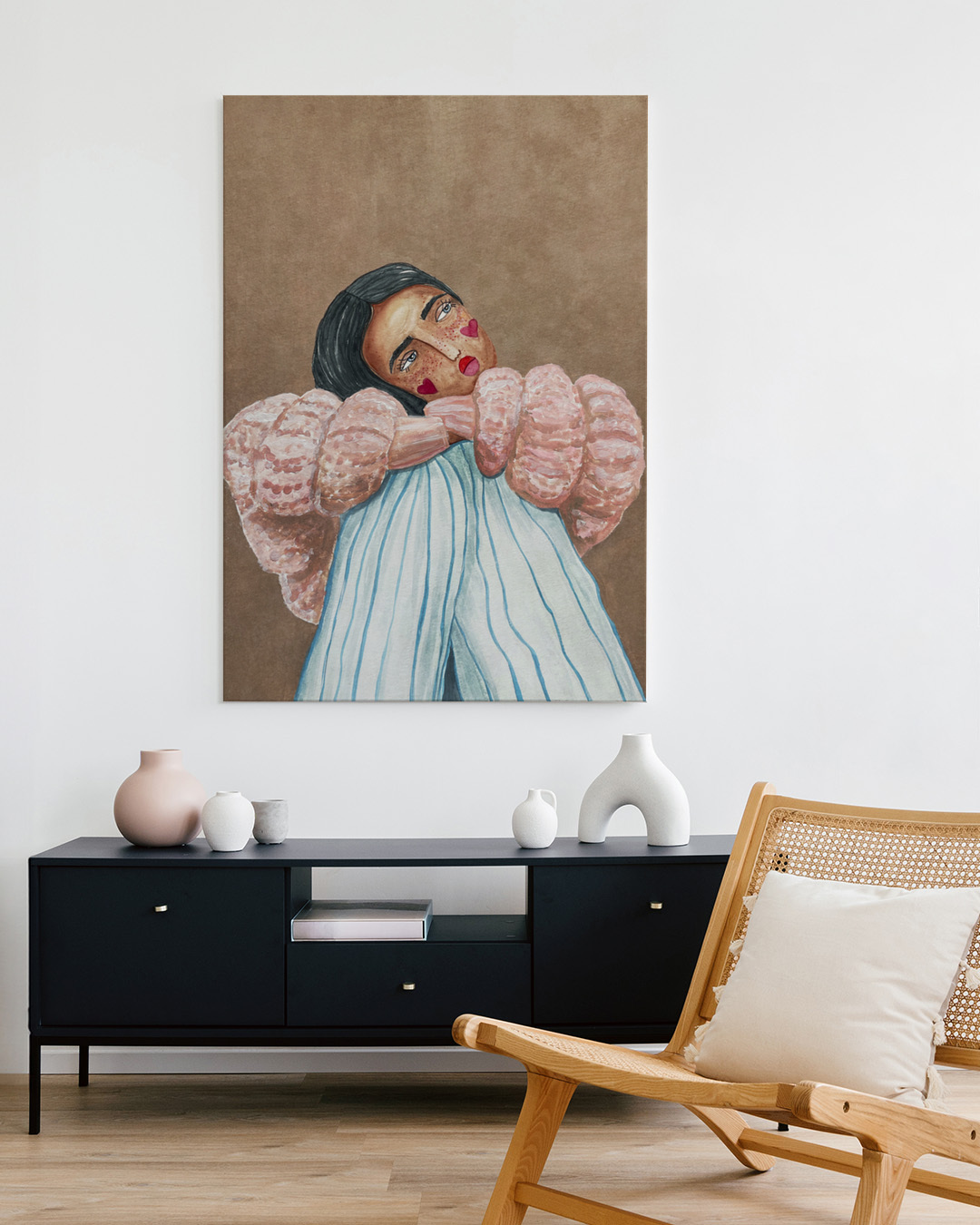 The stretched canvas is fitted with a sleek float frame in genuine wood for an elegant finish and extra dimension. The space between the canvas and the frame creates a floating effect.