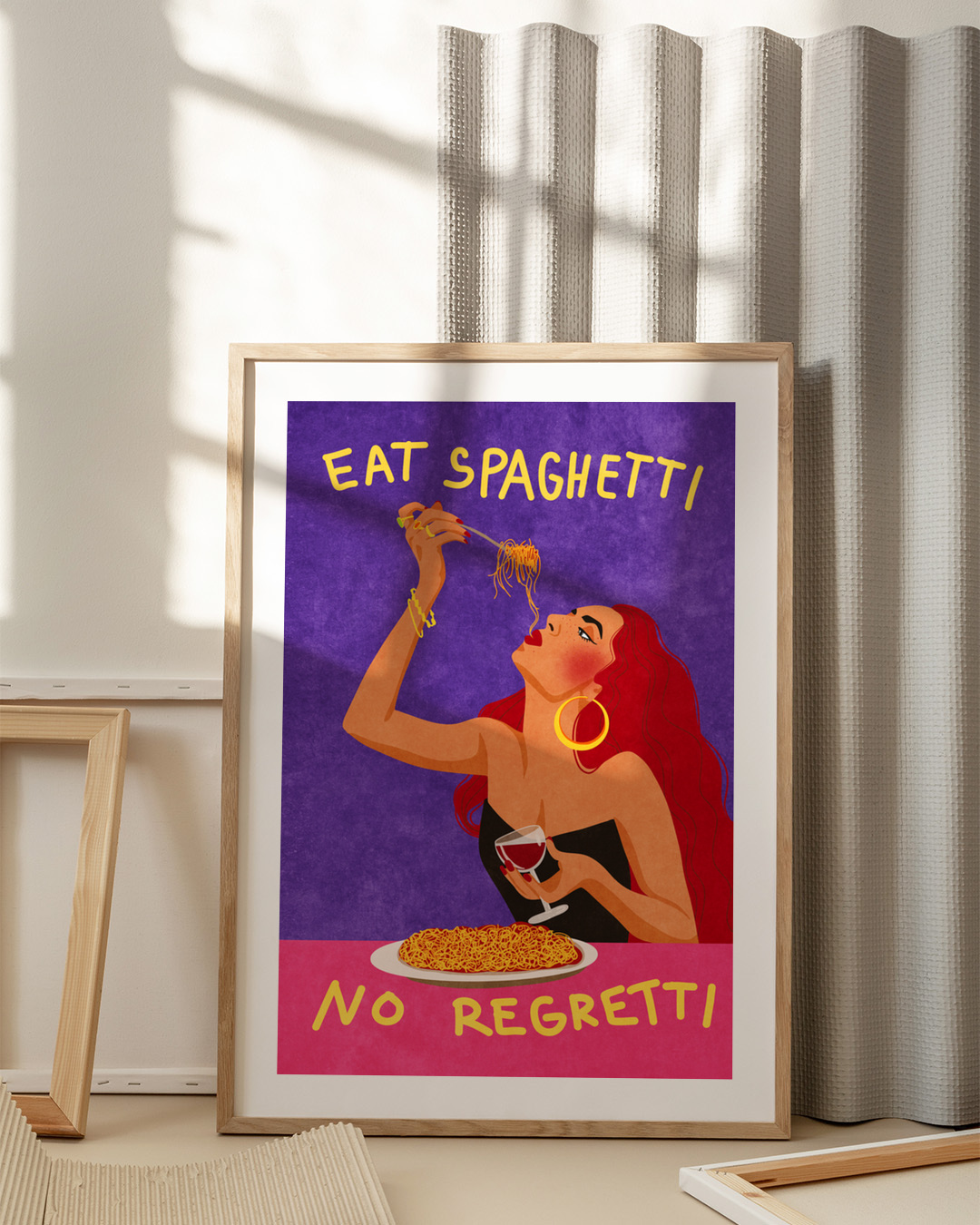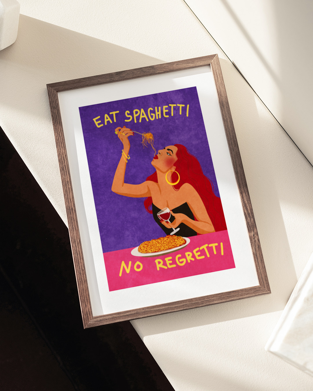 Illustration of a woman enjoying spaghetti and wine with the text 'Eat spaghetti no regretti'. Colorful and bold design.