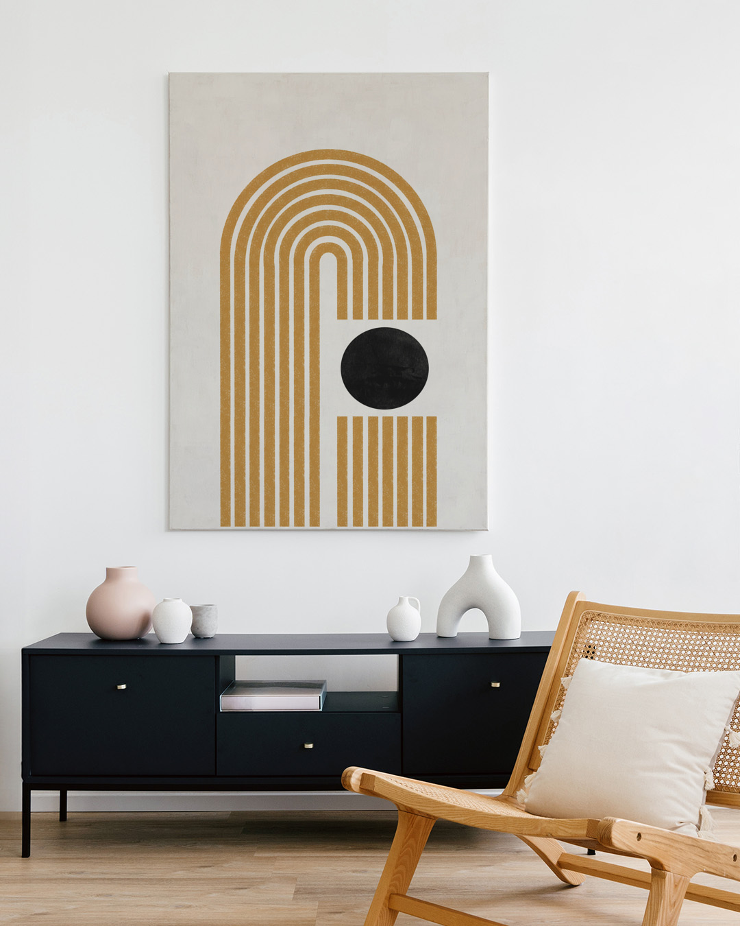 This artwork by Miuus Studio features a striking geometric design with curved lines and a prominent black circle against a beige background. Its minimalistic style adds a modern touch to any setting.