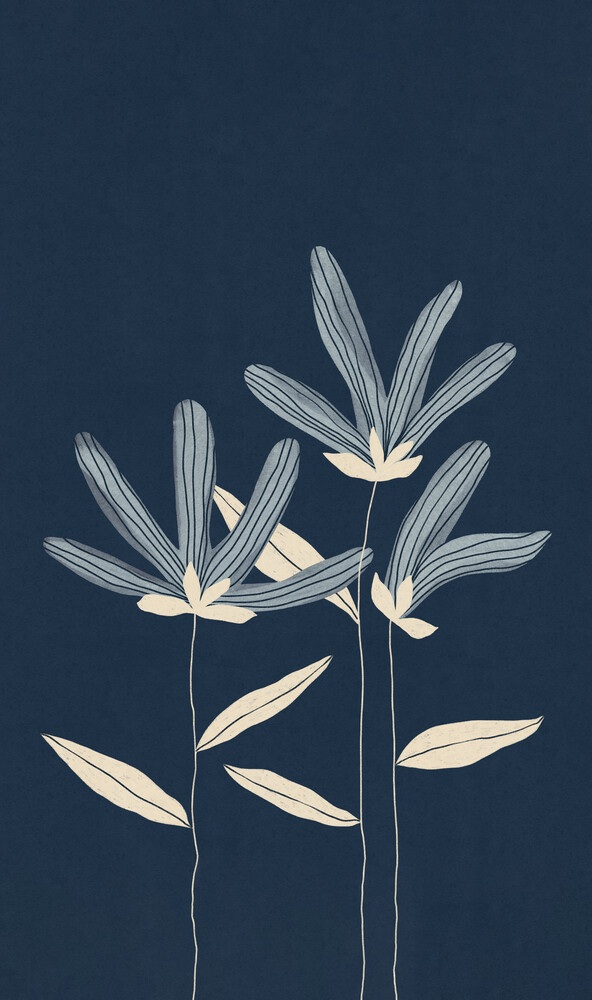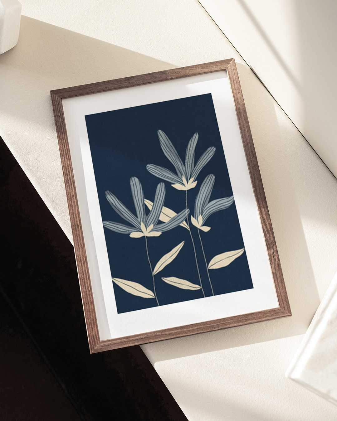 This elegant art print showcases a delicate arrangement of blue flowers on a dark background. Ideal for bringing a touch of sophistication to any space.