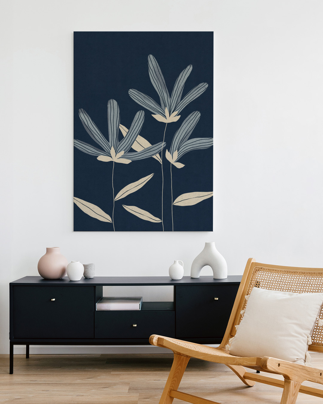 The stretched canvas is fitted with a sleek float frame in genuine wood for an elegant finish and extra dimension. The space between the canvas and the frame creates a floating effect.
